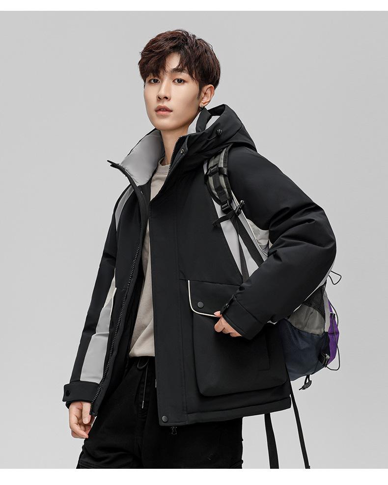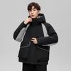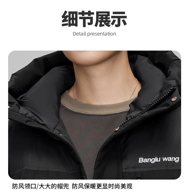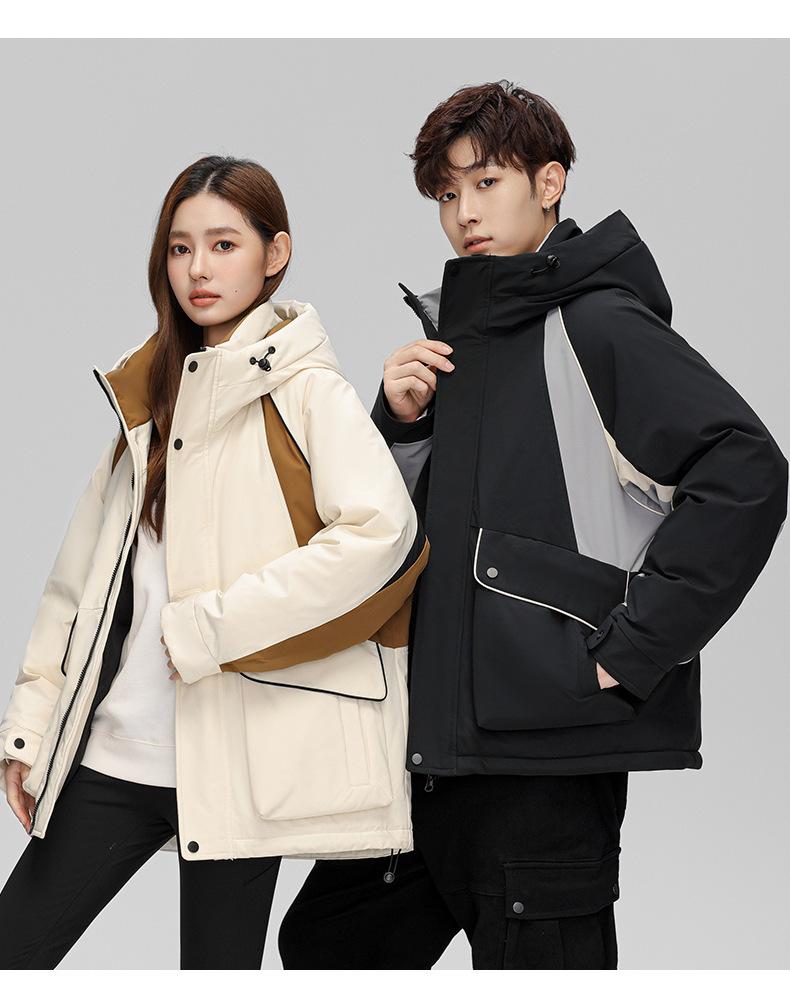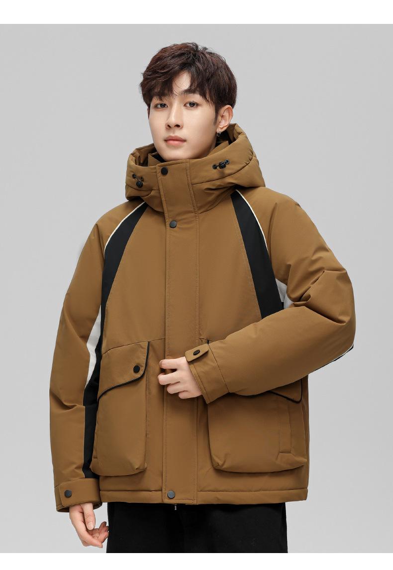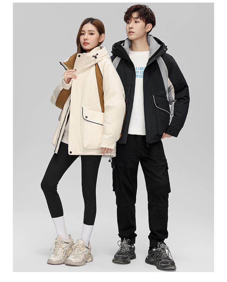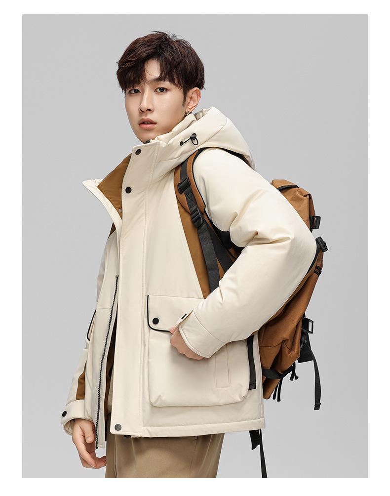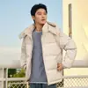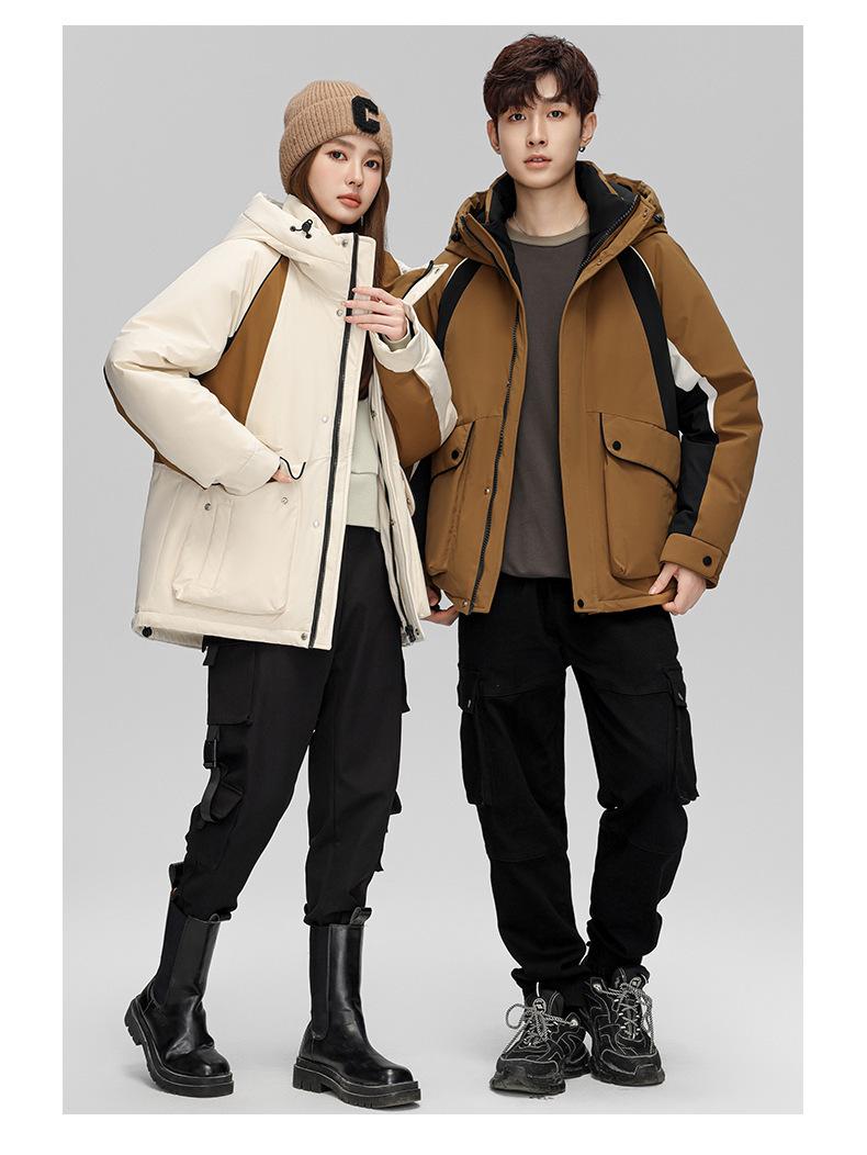 Chamarra de plumón de pato blanco 90 de cuello medio alto invierno marca estadounidense de moda empalmado chamarra de plumón para hombre adolescentes pareja top con capucha