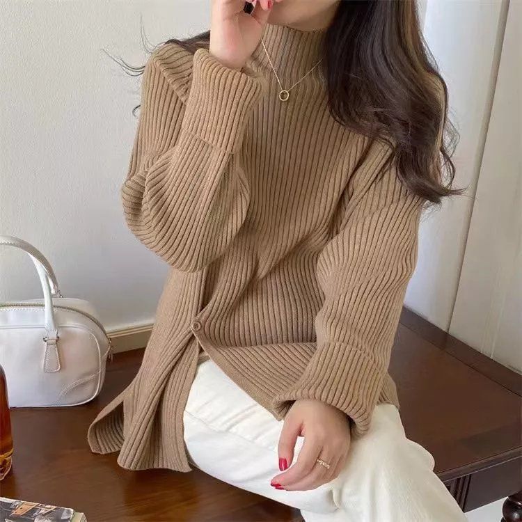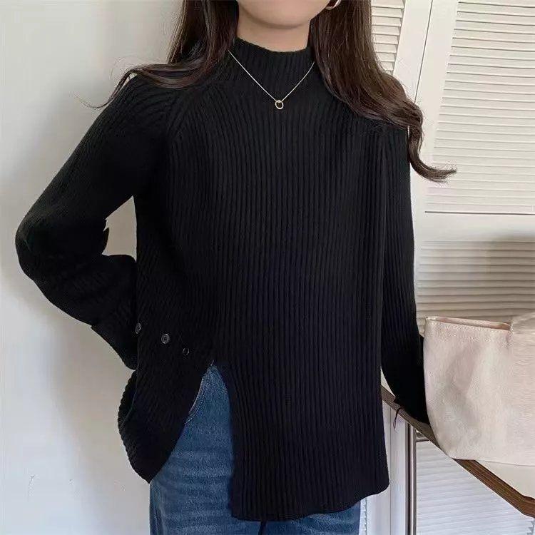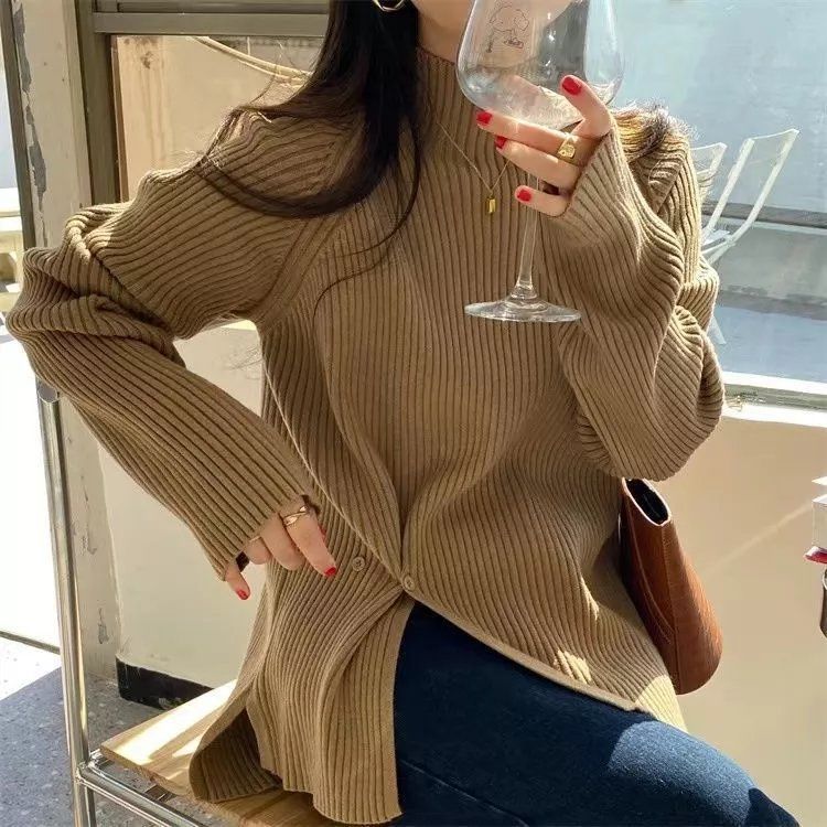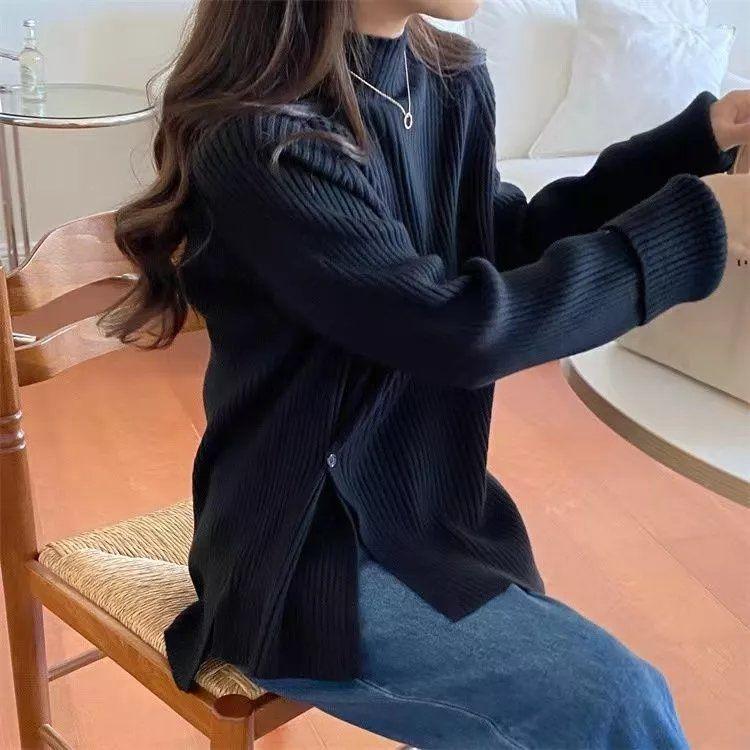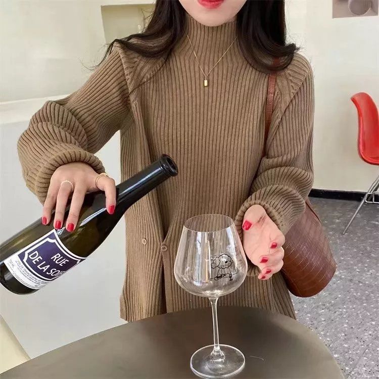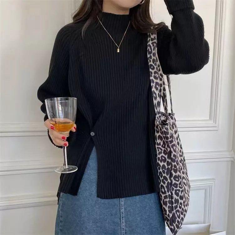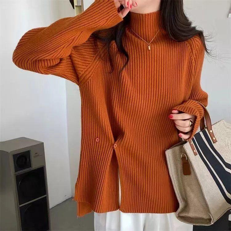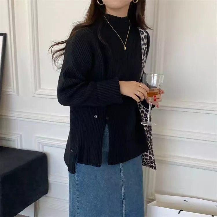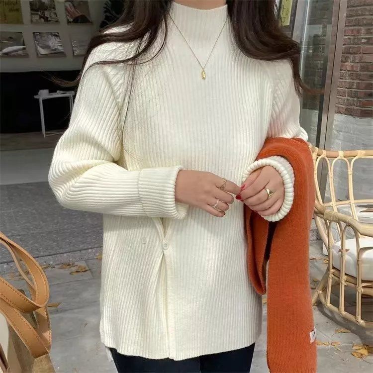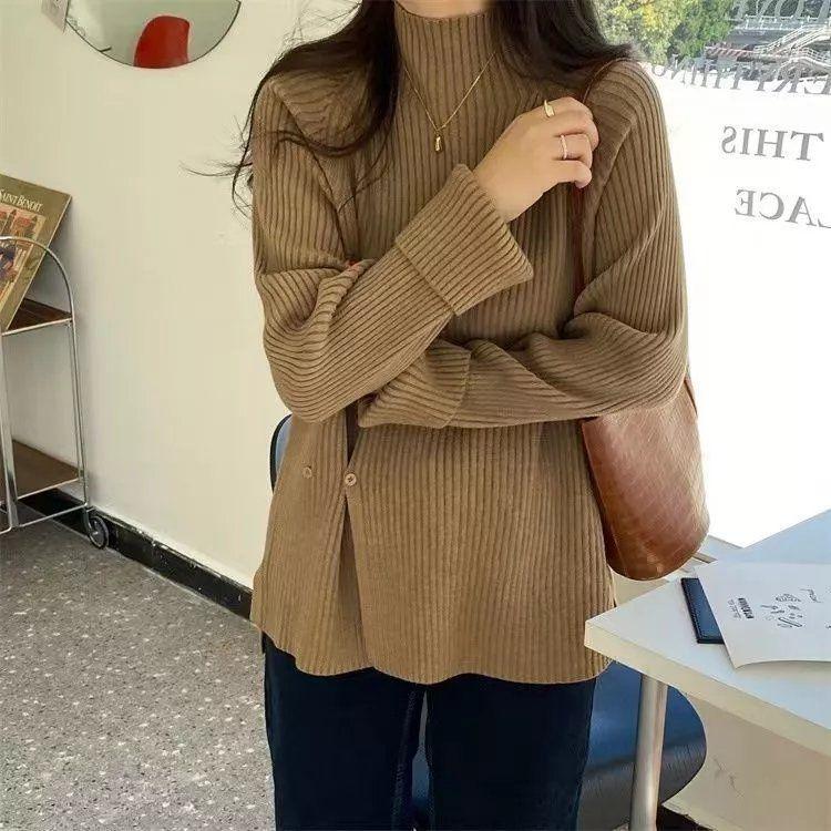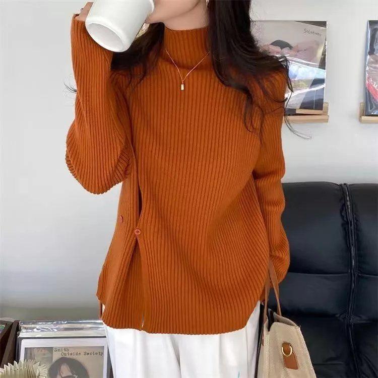 Estilo coreano otoño e invierno Nuevo suéter de punto de cuello medio alto holgado con diseño de botones divididos para mujer