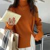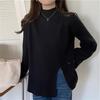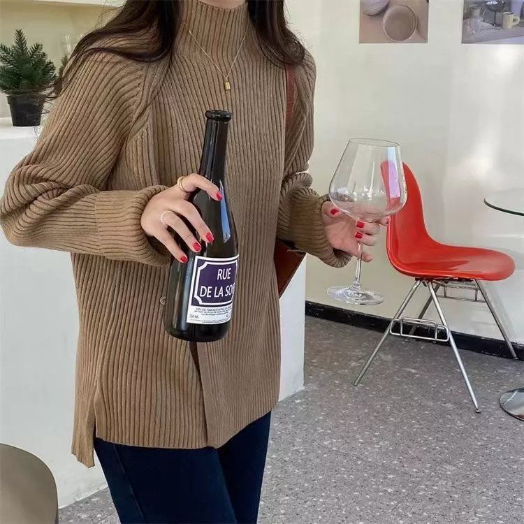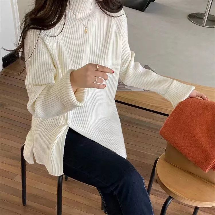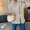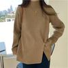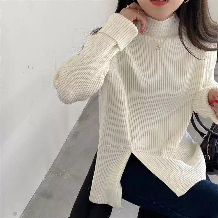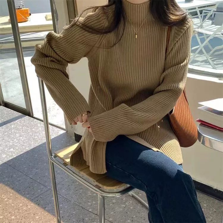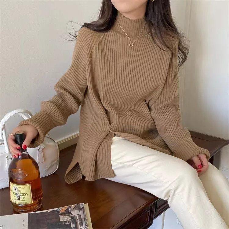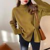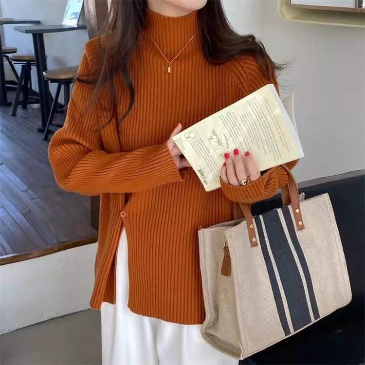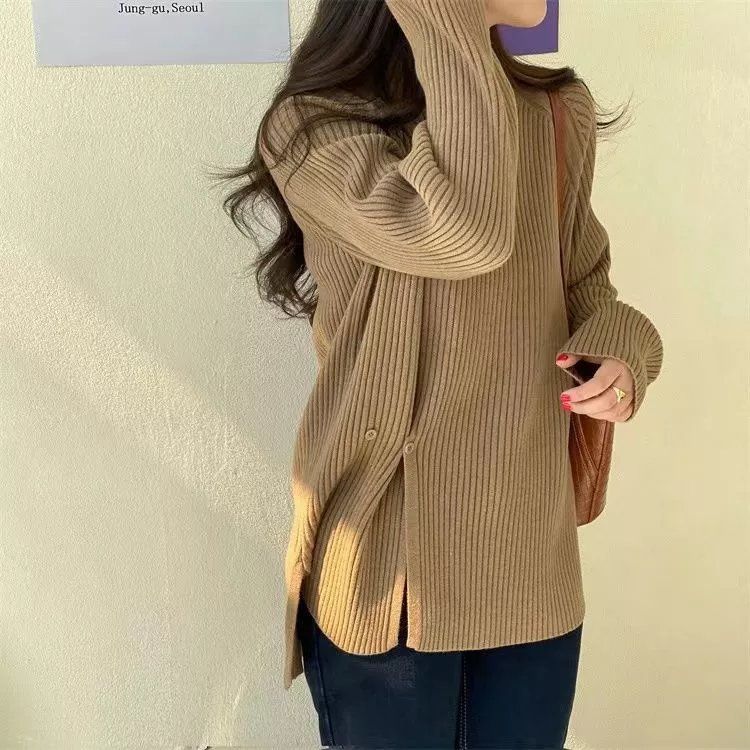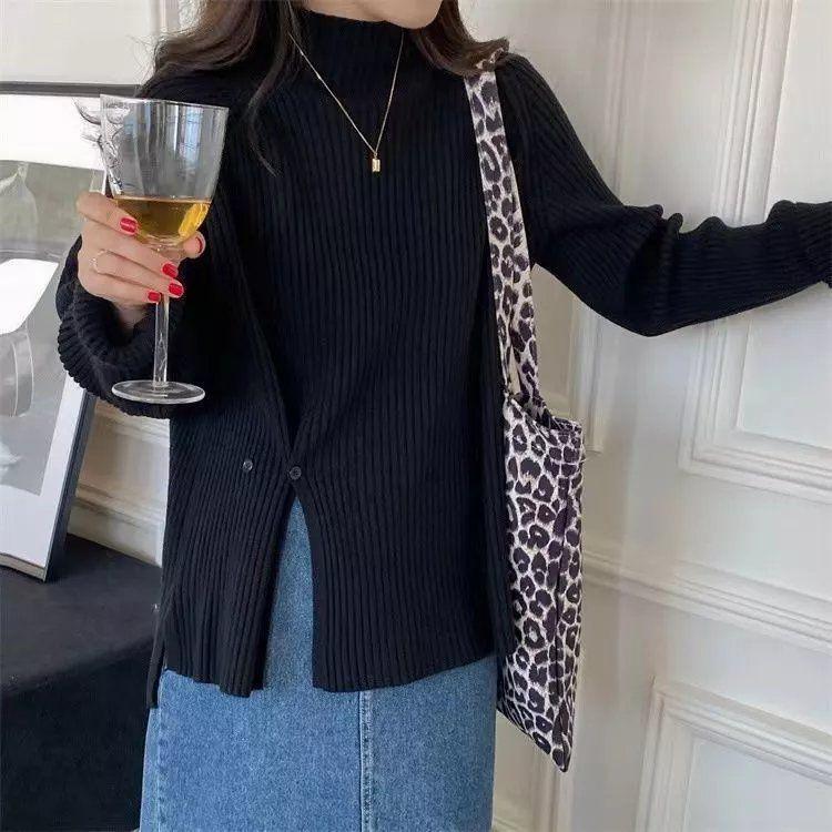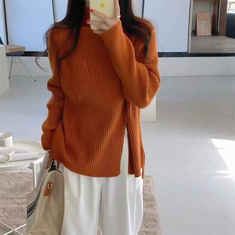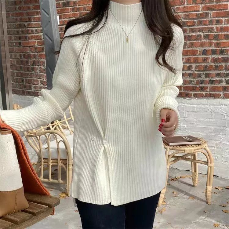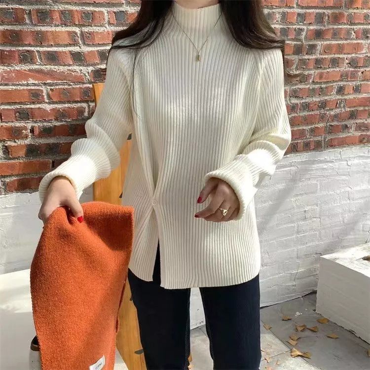 Estilo coreano otoño e invierno Nuevo suéter de punto de cuello medio alto holgado con diseño de botones divididos para mujer
