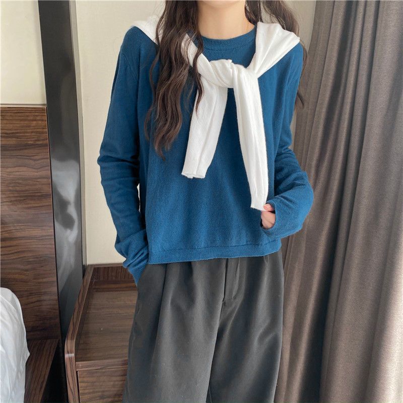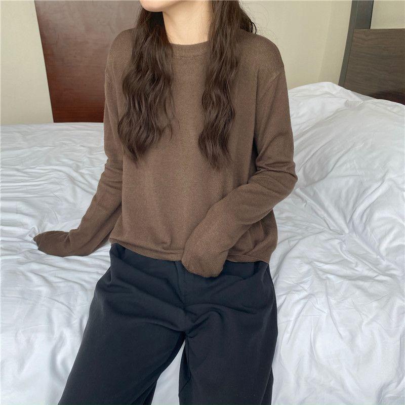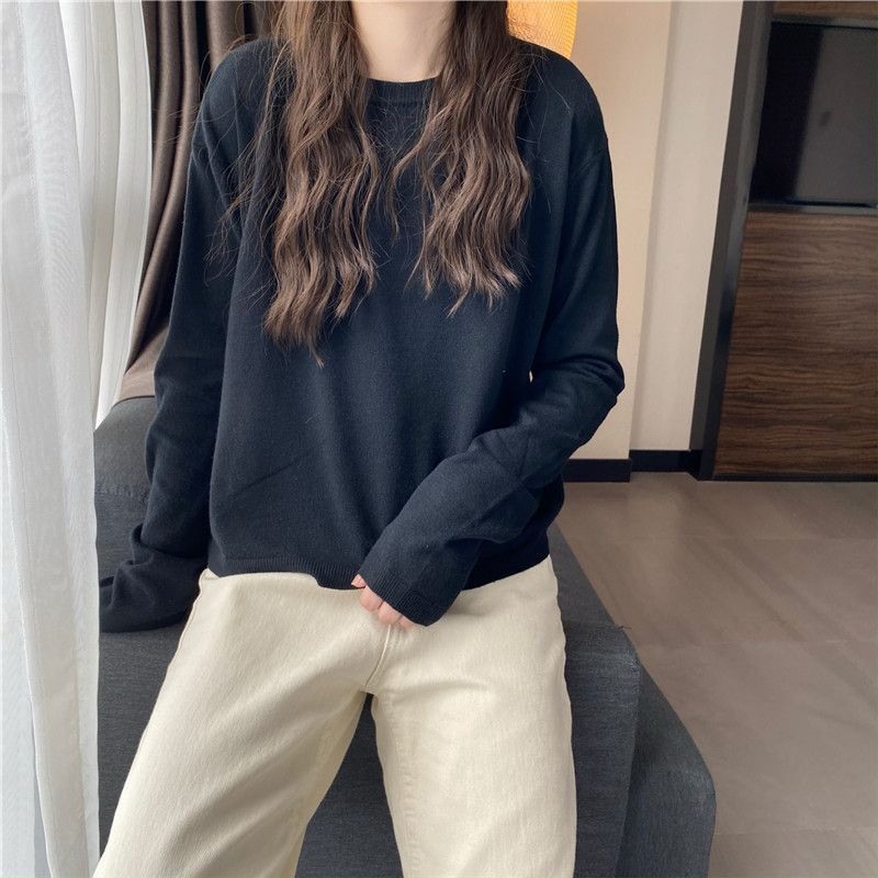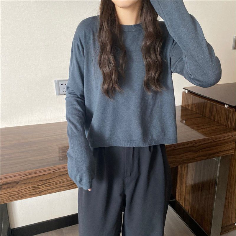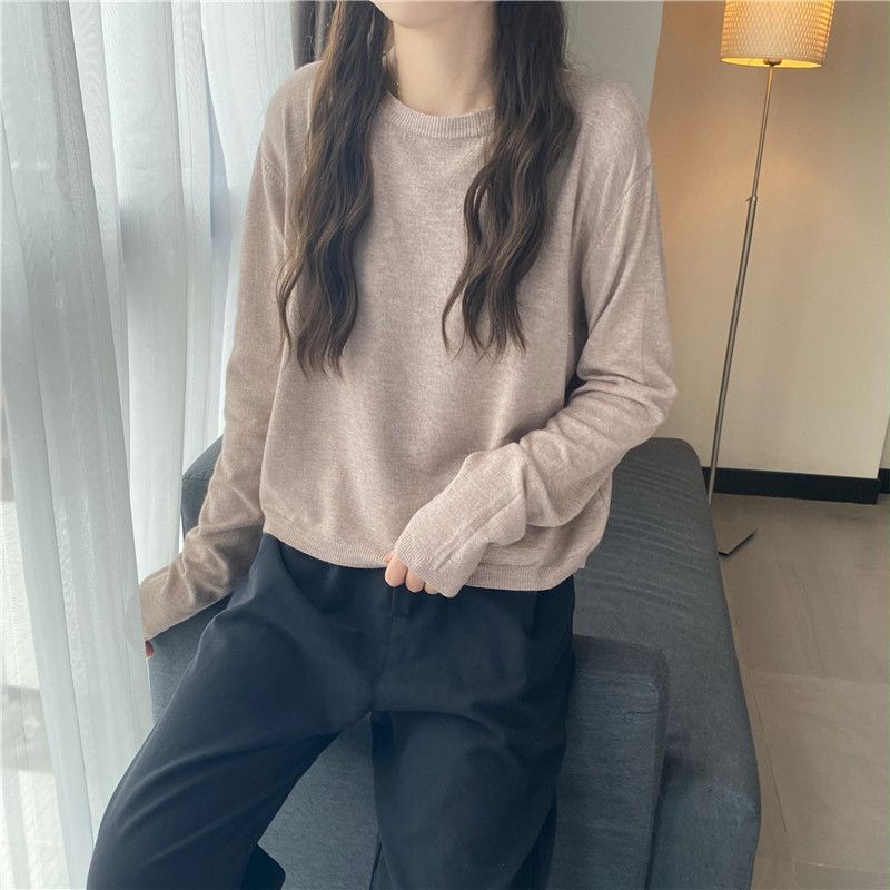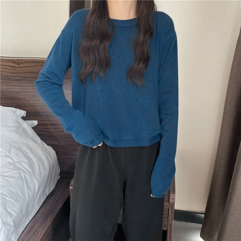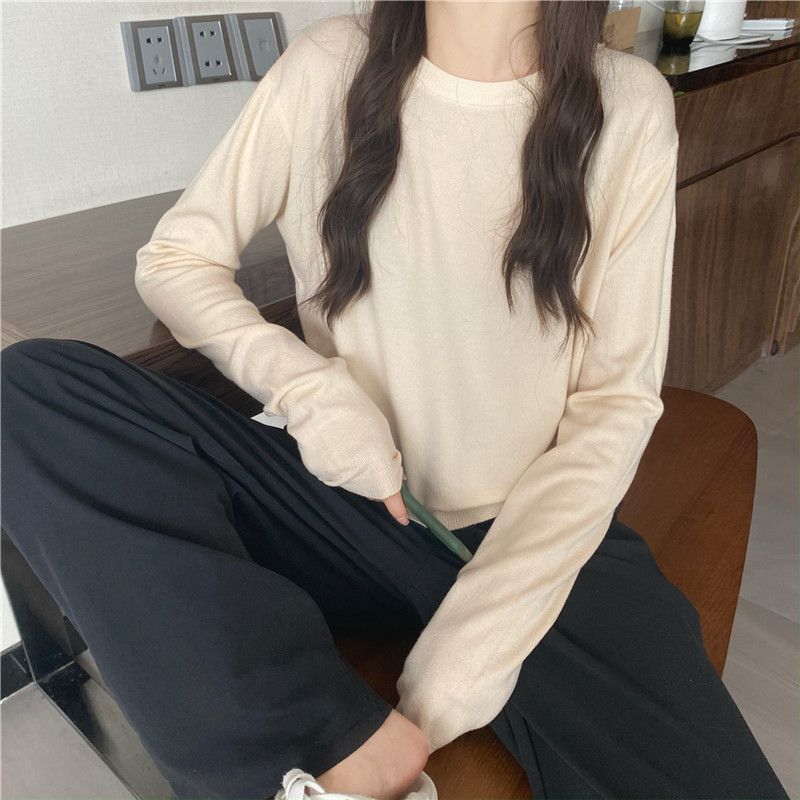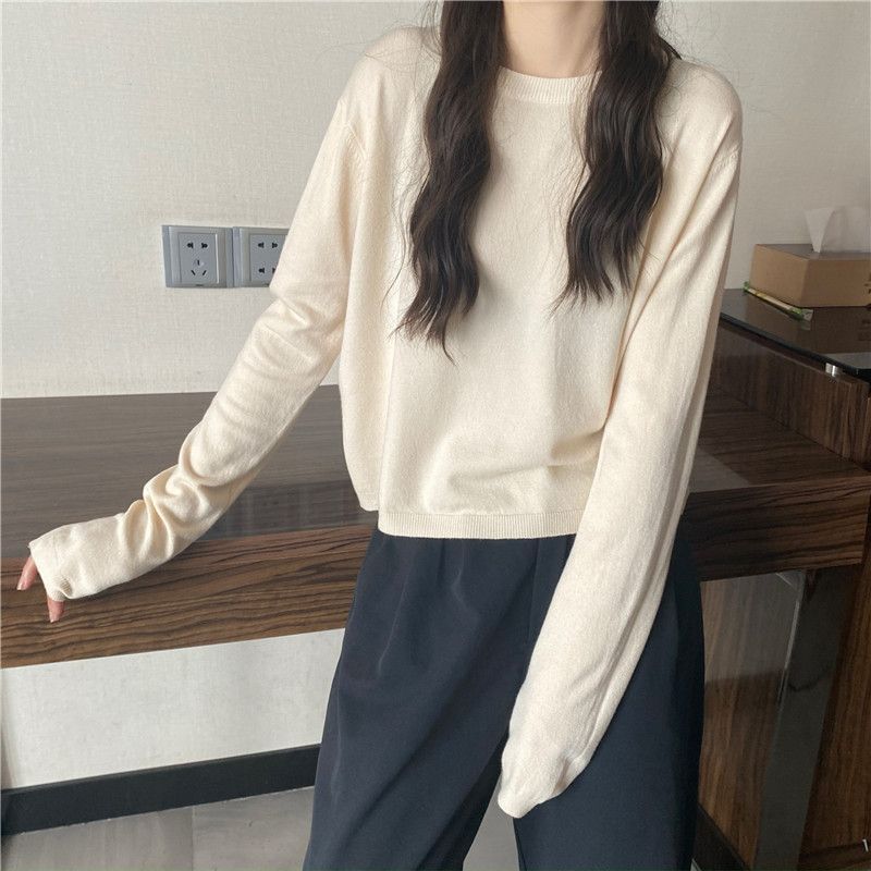Jersey de cuello redondo de estilo coreano para mujer, top de punto de manga larga, camiseta interior corta y holgada adelgazante, primavera y otoño de 2023