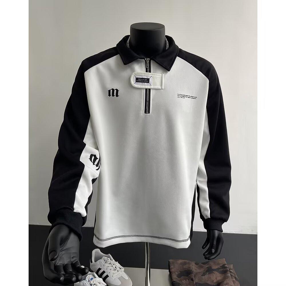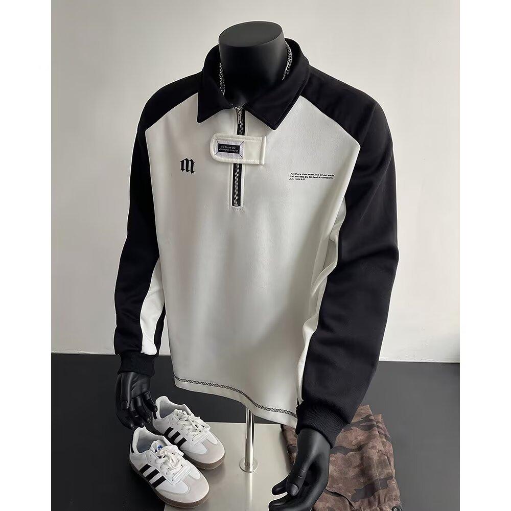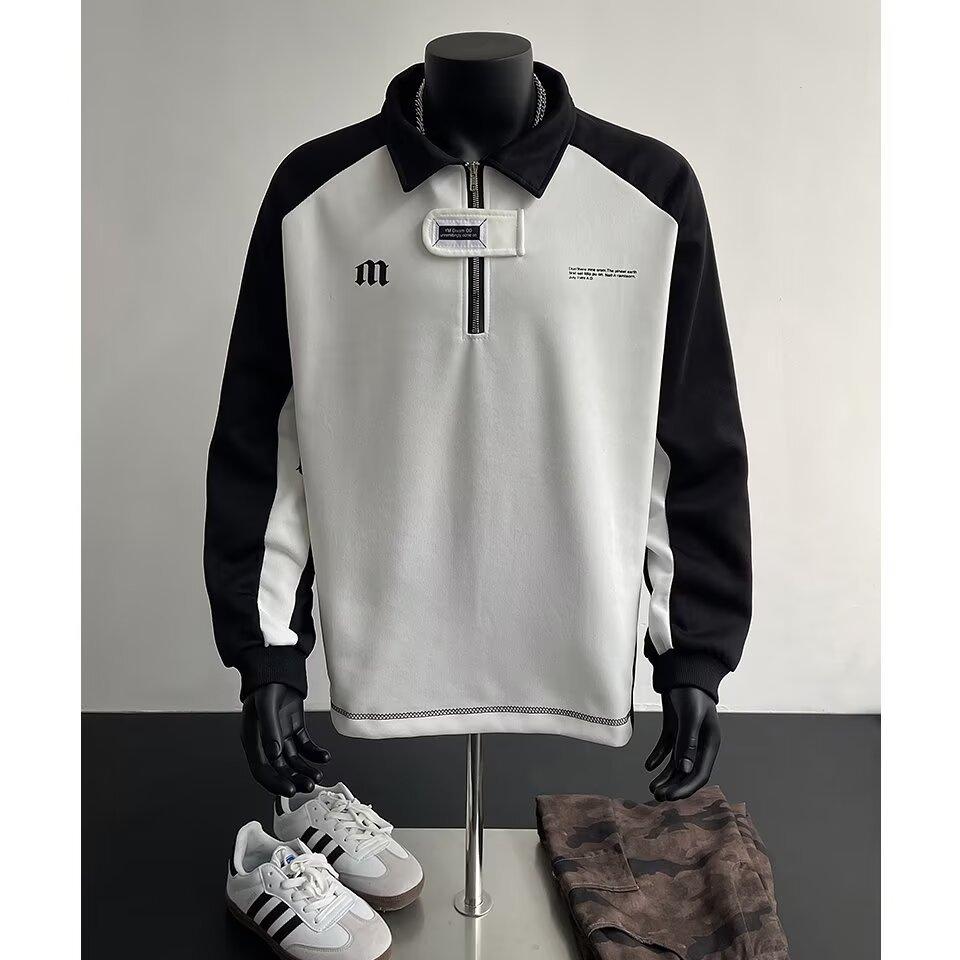 Polo Retro de Estilo Americano con Media Cremallera en Contraste, Solapa, Felpa Forrada, Sudadera Gruesa de Otoño e Invierno, Holgada, de Nicho, Estilo Universitario