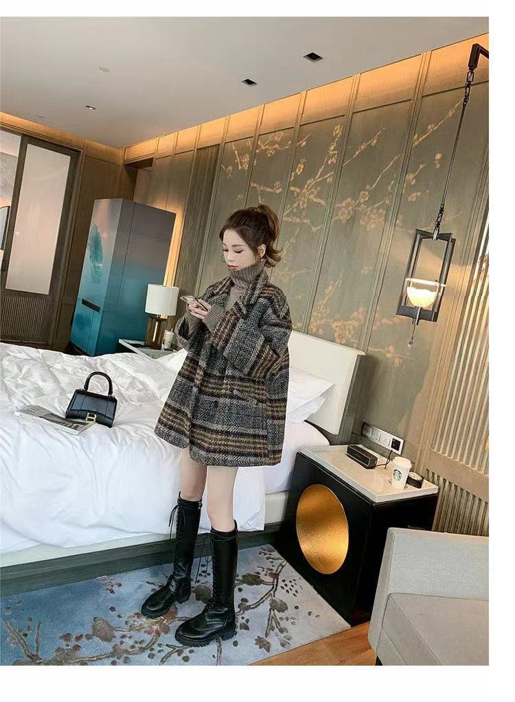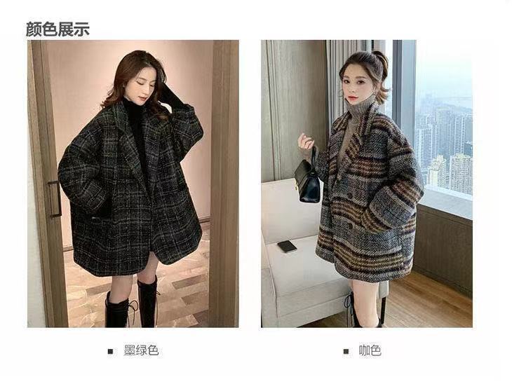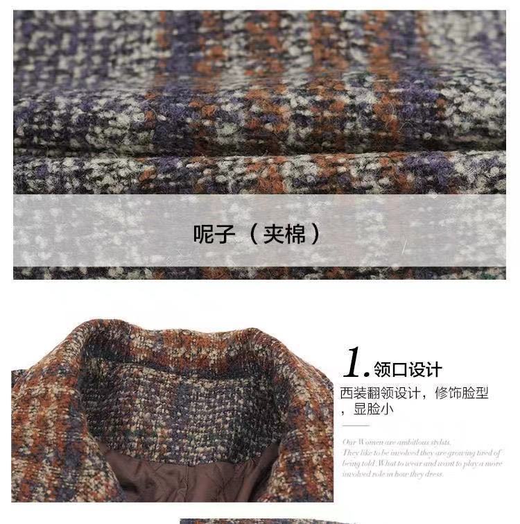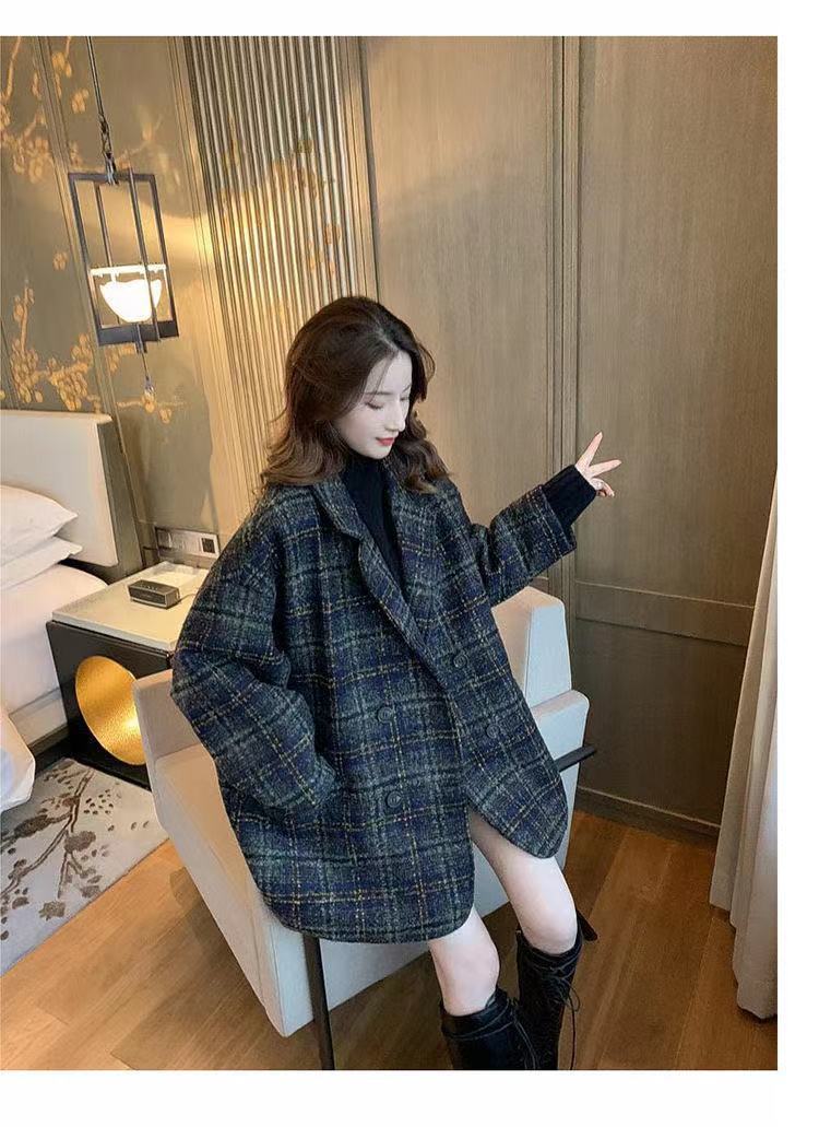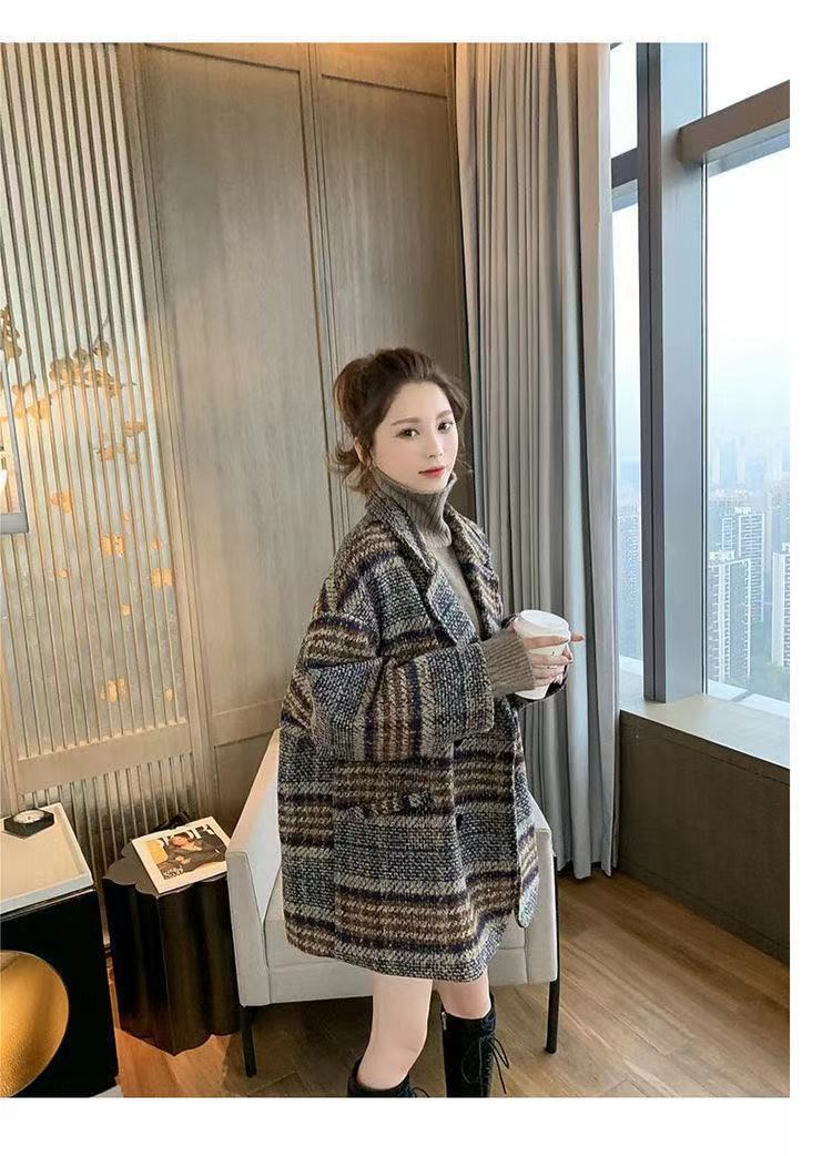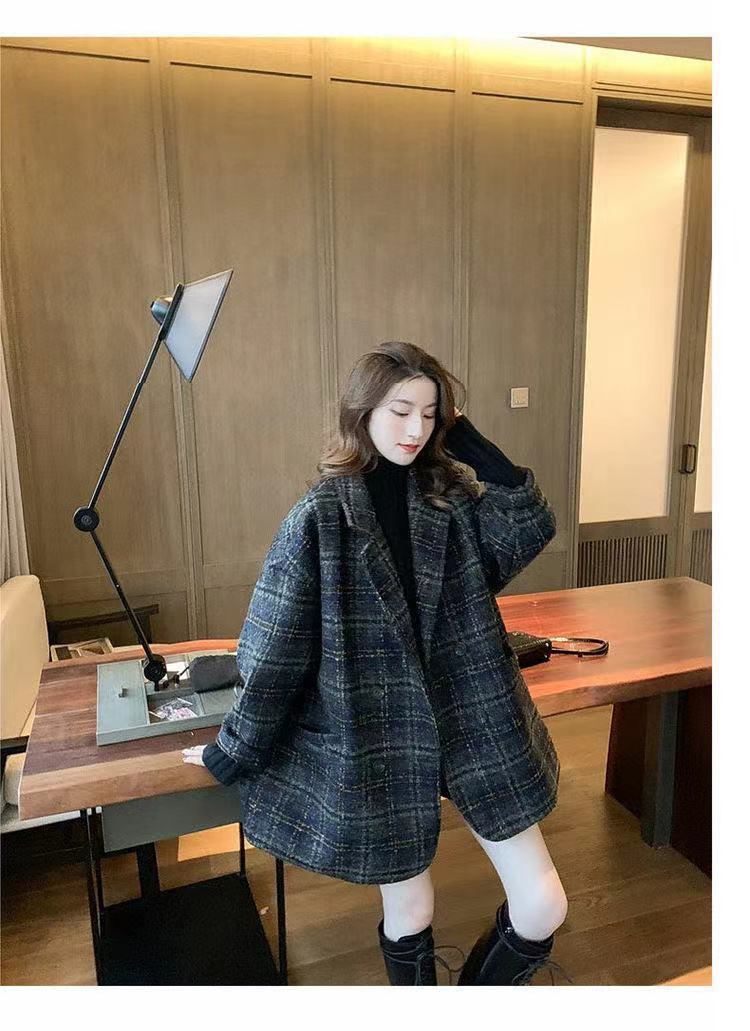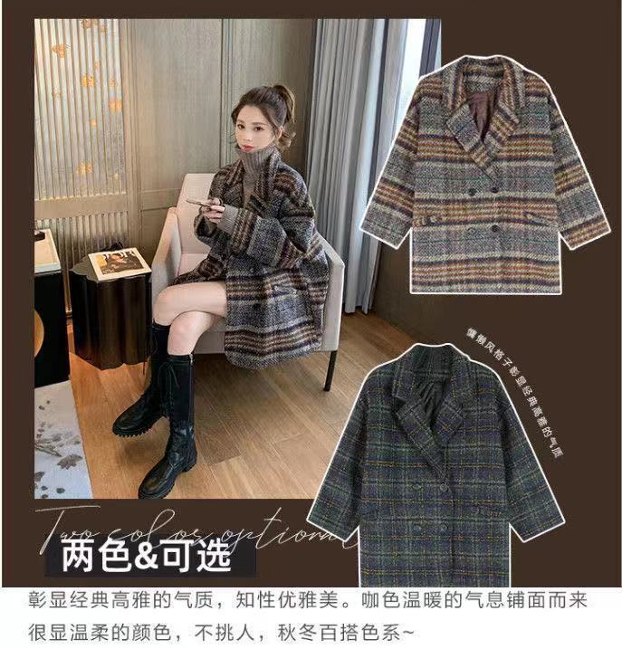 Chaqueta de Traje de Talla Grande para Mujer Otoño e Invierno Nueva Elegante Pequeña Versátil a Cuadros Largo Medio Lana Abrigo