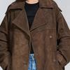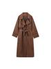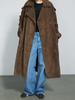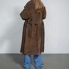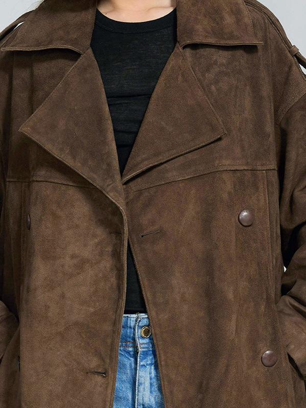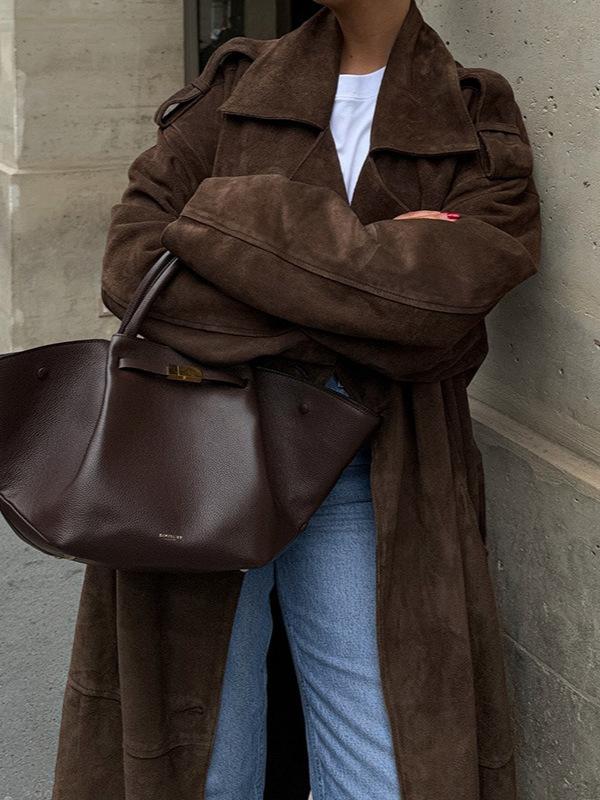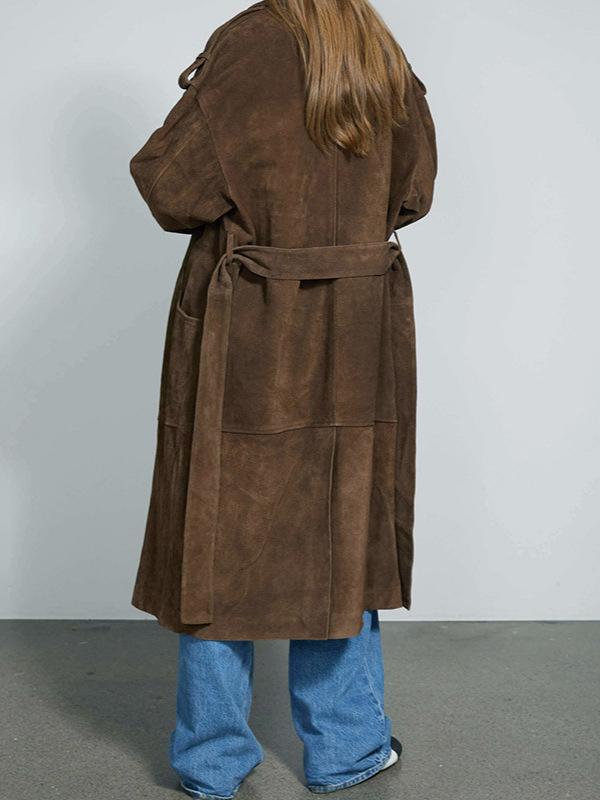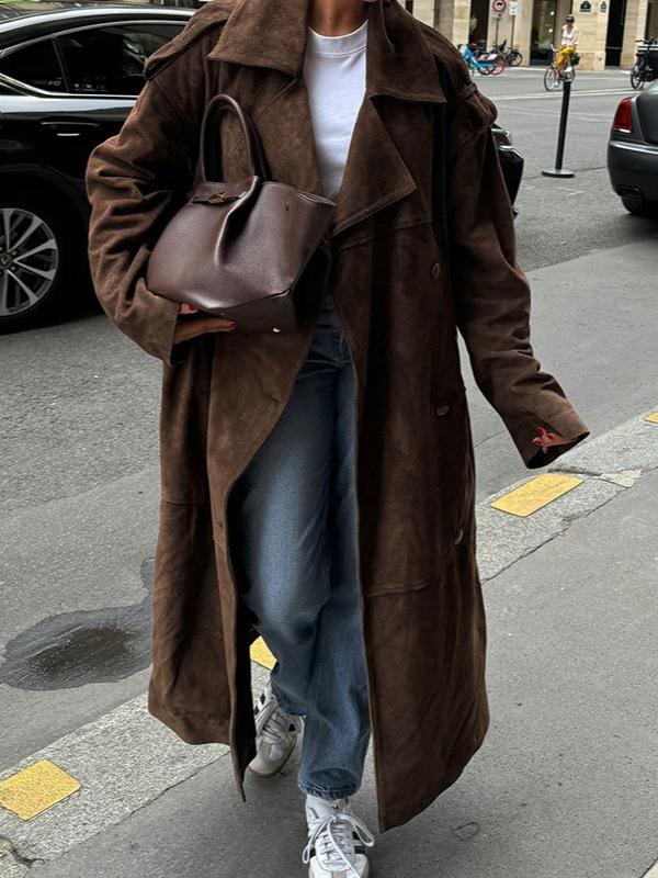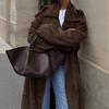 Abrigo largo de ante marrón elegante con solapa suelta para uso diario en Europa y América, otoño 2024