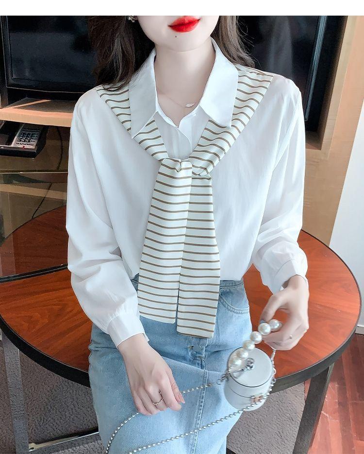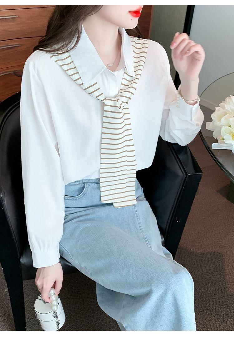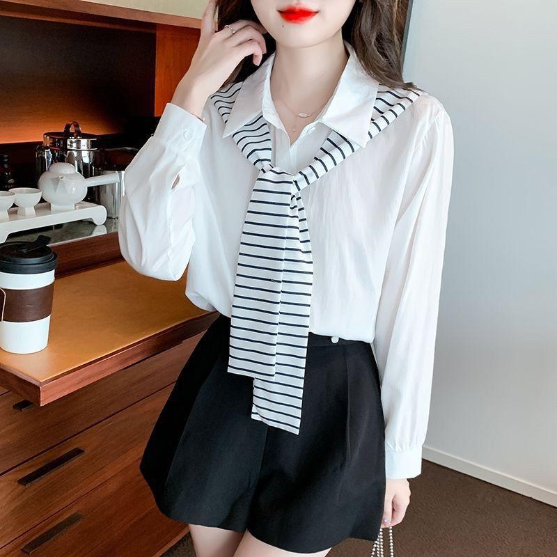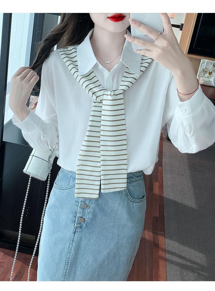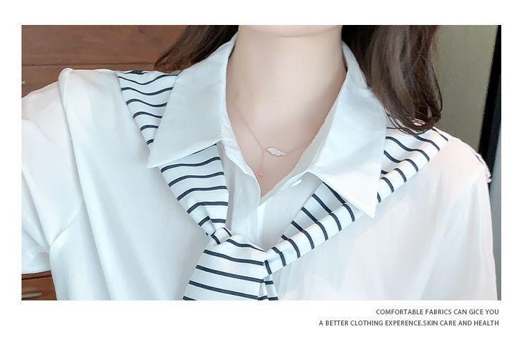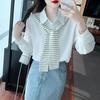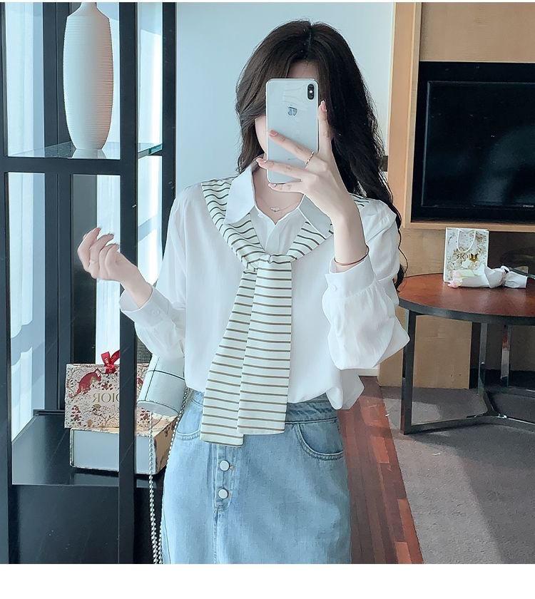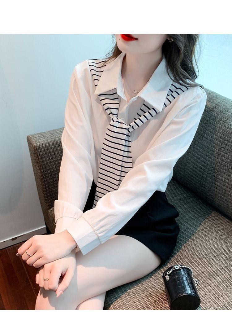 Camisa blanca de manga larga a rayas de dos piezas con chal falso para mujer, diseño de cárdigan con costuras nuevas de otoño, camisa pequeña Sense