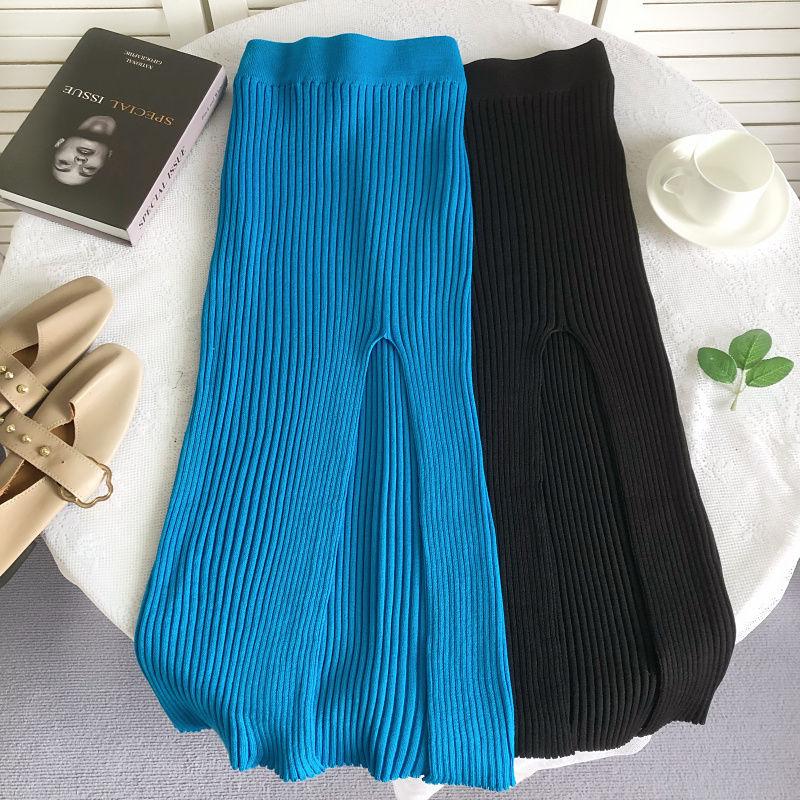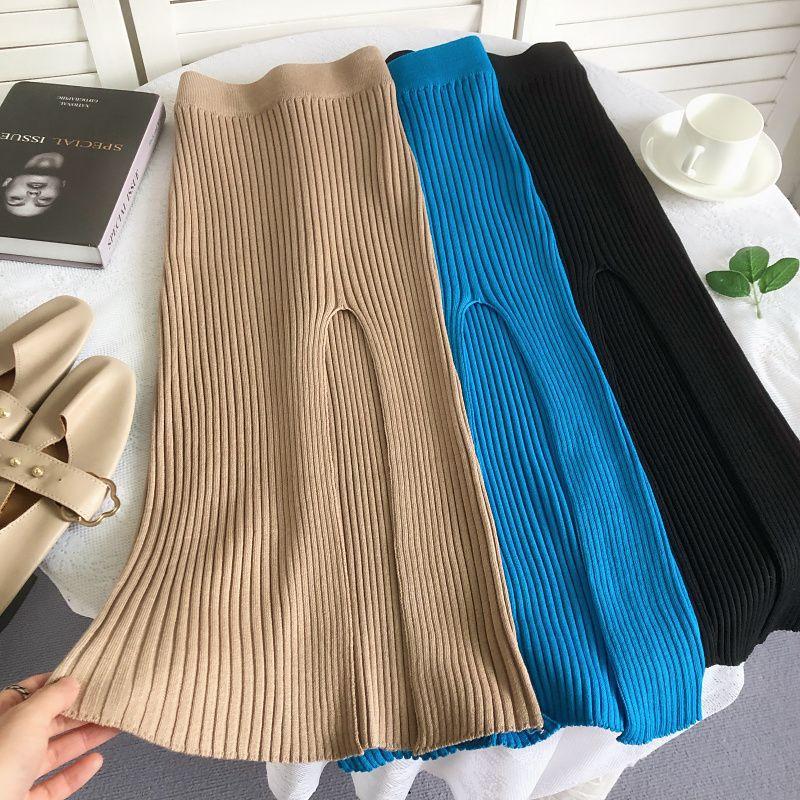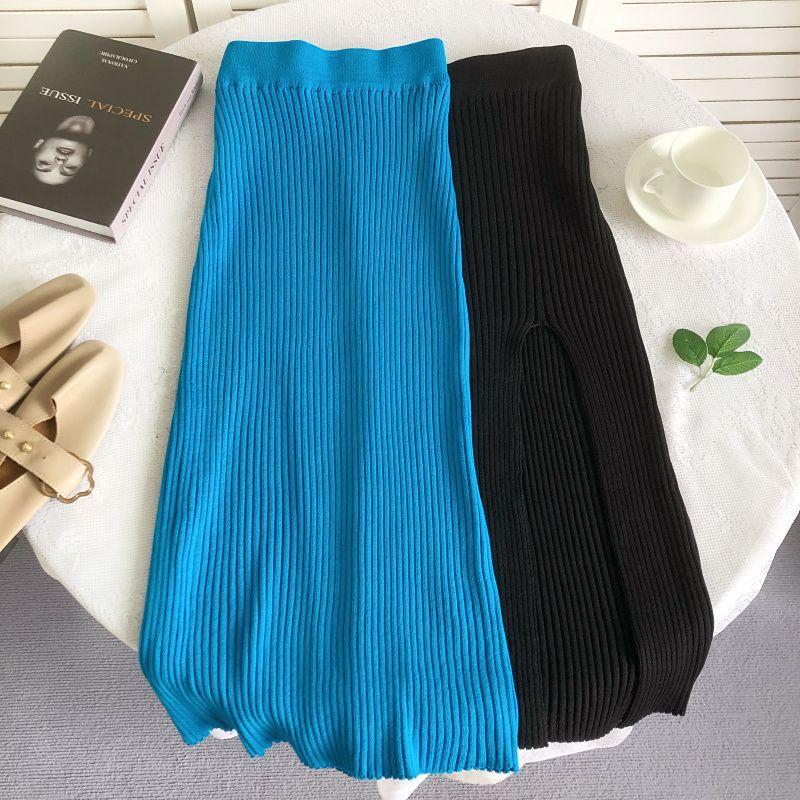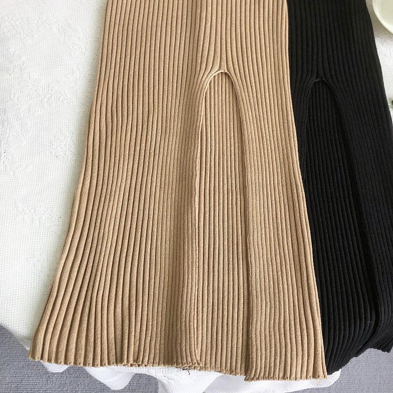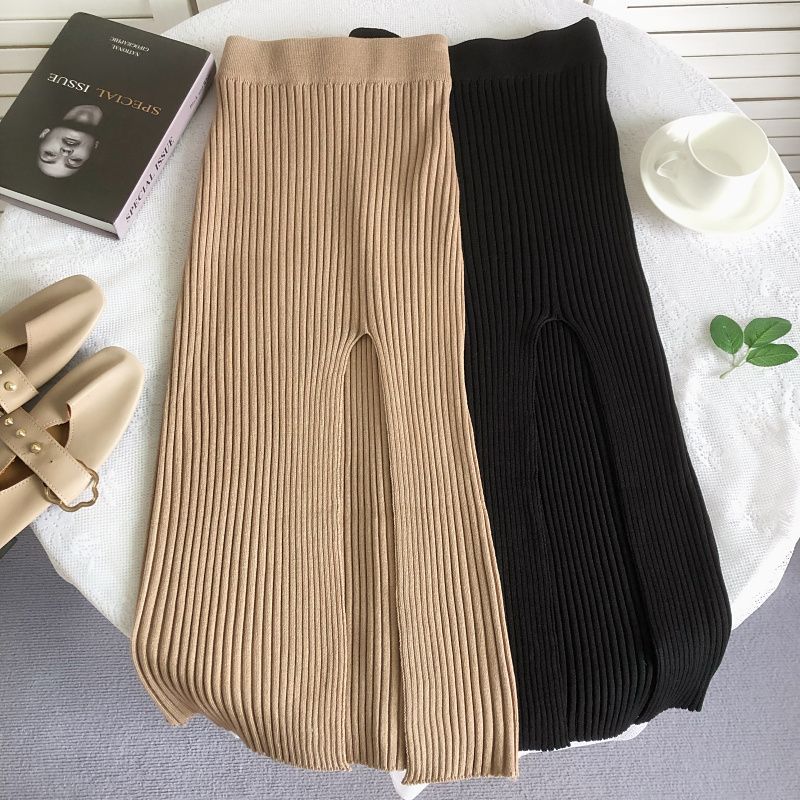 Falda Tejida Retro Estilo Coreano Negro 2024 Otoño e Invierno Nueva Cintura Alta Adelgazante Largo Medio Abertura Falda Sexy