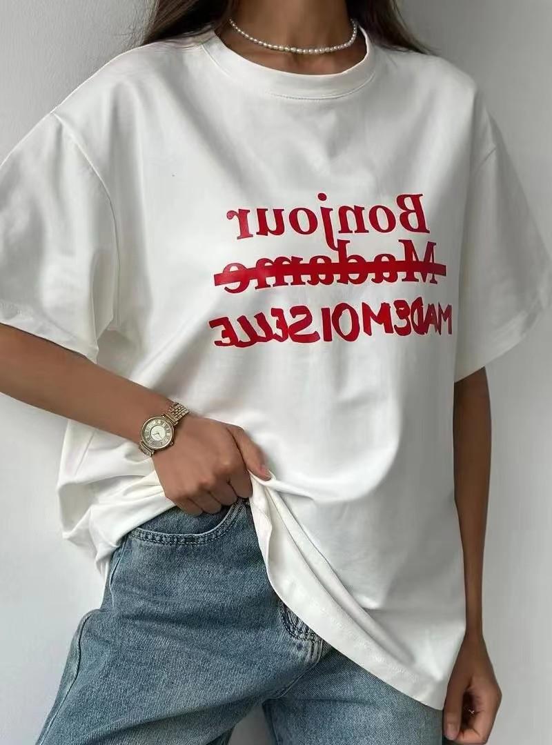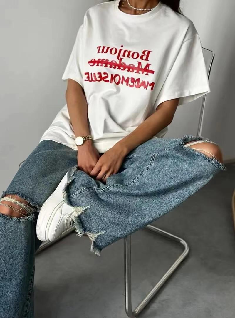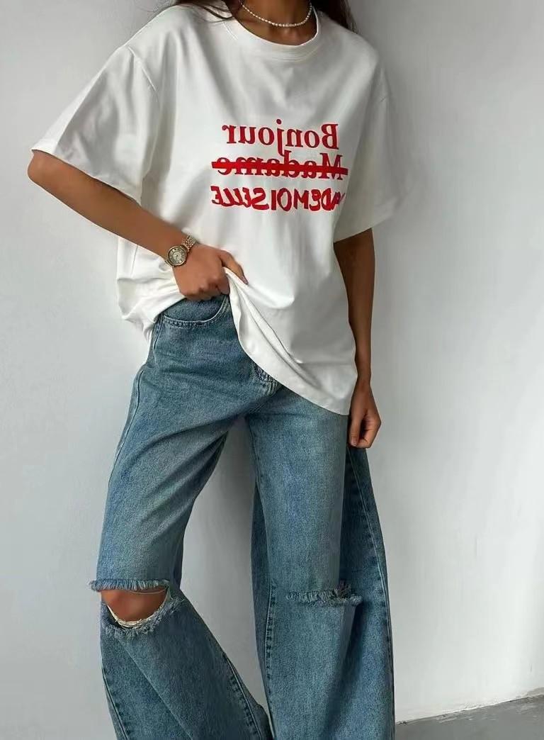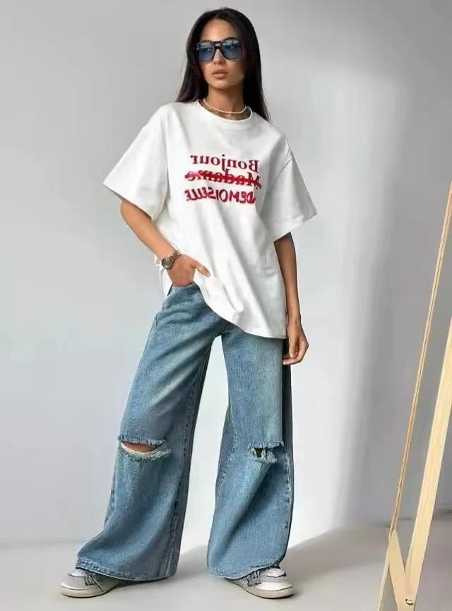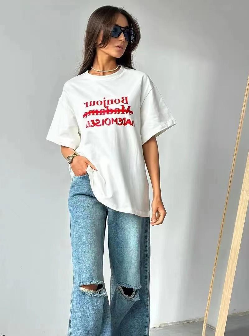 Camiseta de manga corta holgada, estilo americano, retro, informal, con estampado de letras, 100% algodón, novedad de verano de 2024.
