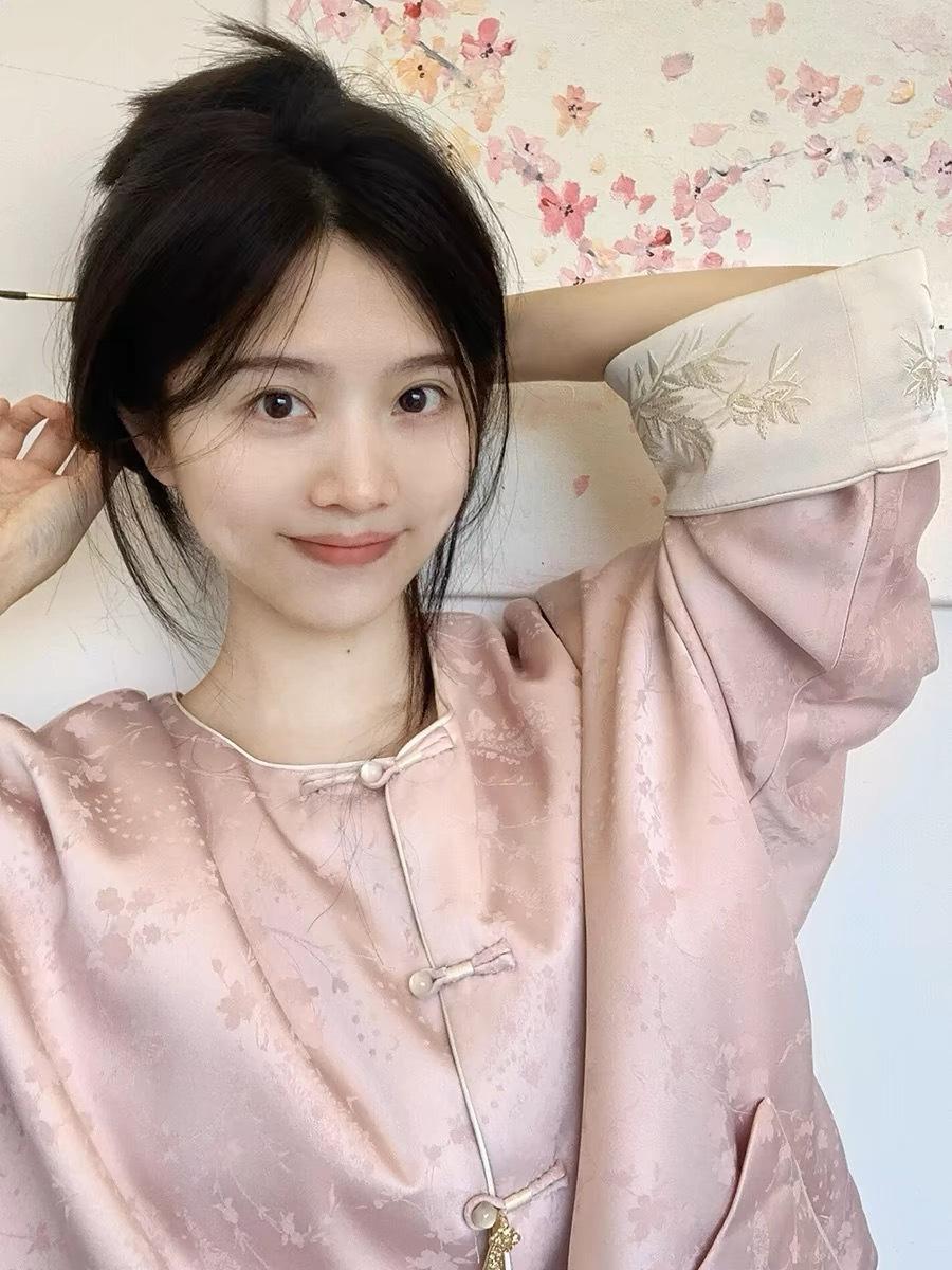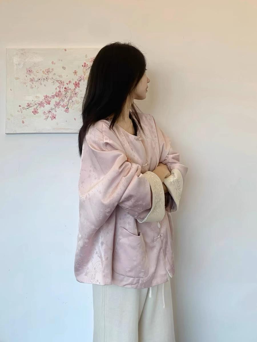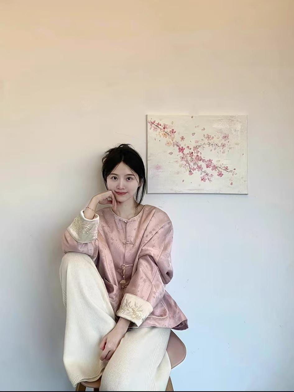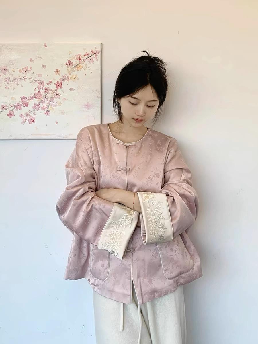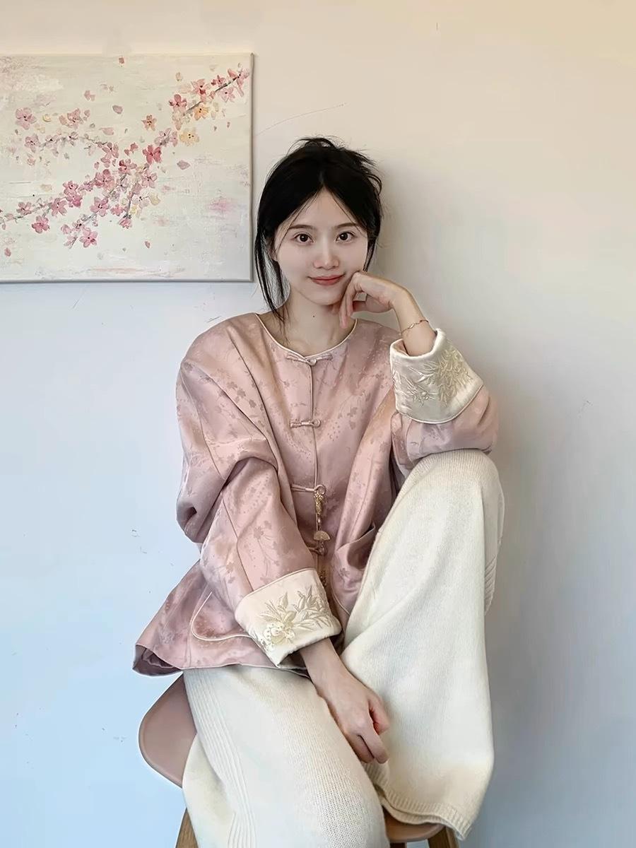 2025 principios de primavera nueva moda antiedad de calle frita industria pesada bordado nuevo abrigo rosa chino pantalones de pierna ancha estilo nacional ropa de mujer