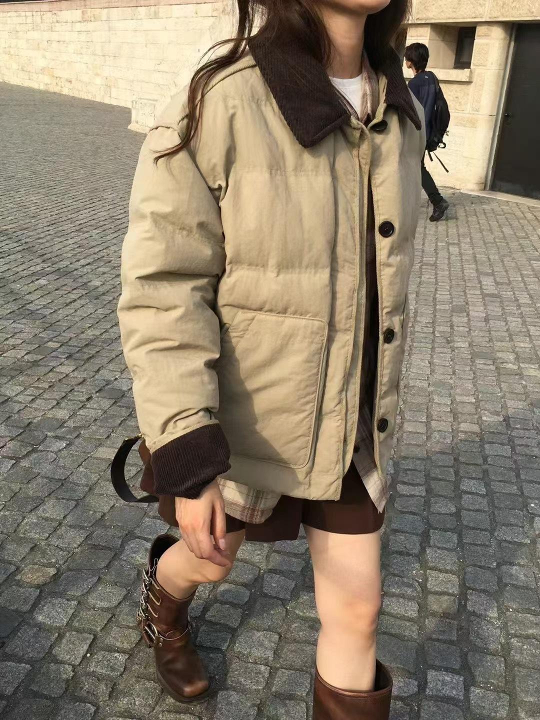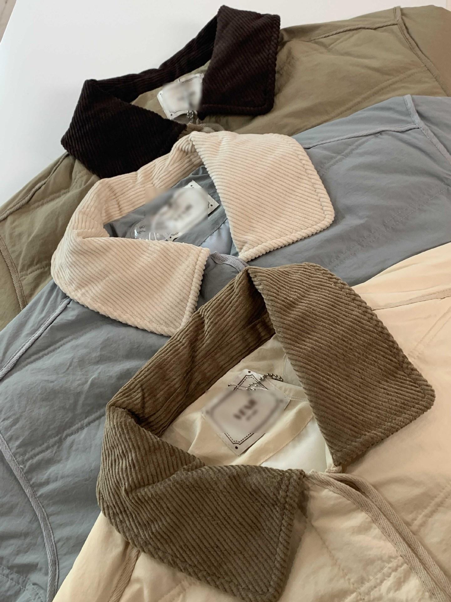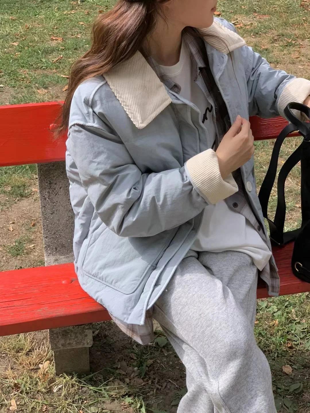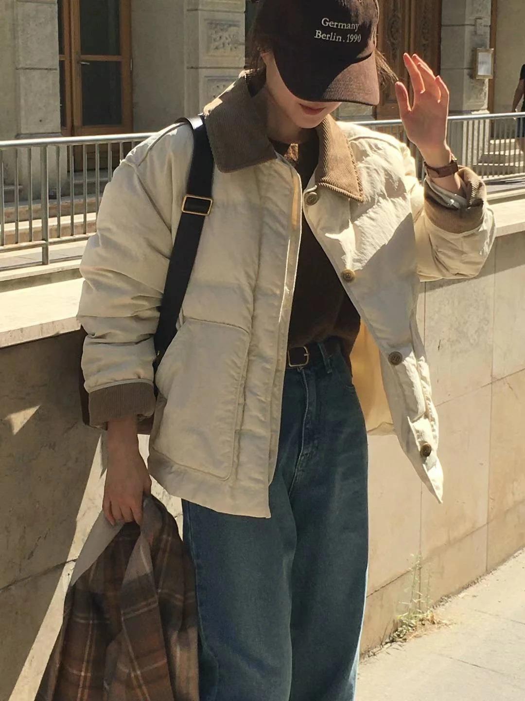 Stock Listo Chaqueta Acolchada de Pana con Solapa en Contraste 2024 Otoño e Invierno Nueva Chaqueta Simple Holgada de Estilo Coreano de Alta Gama