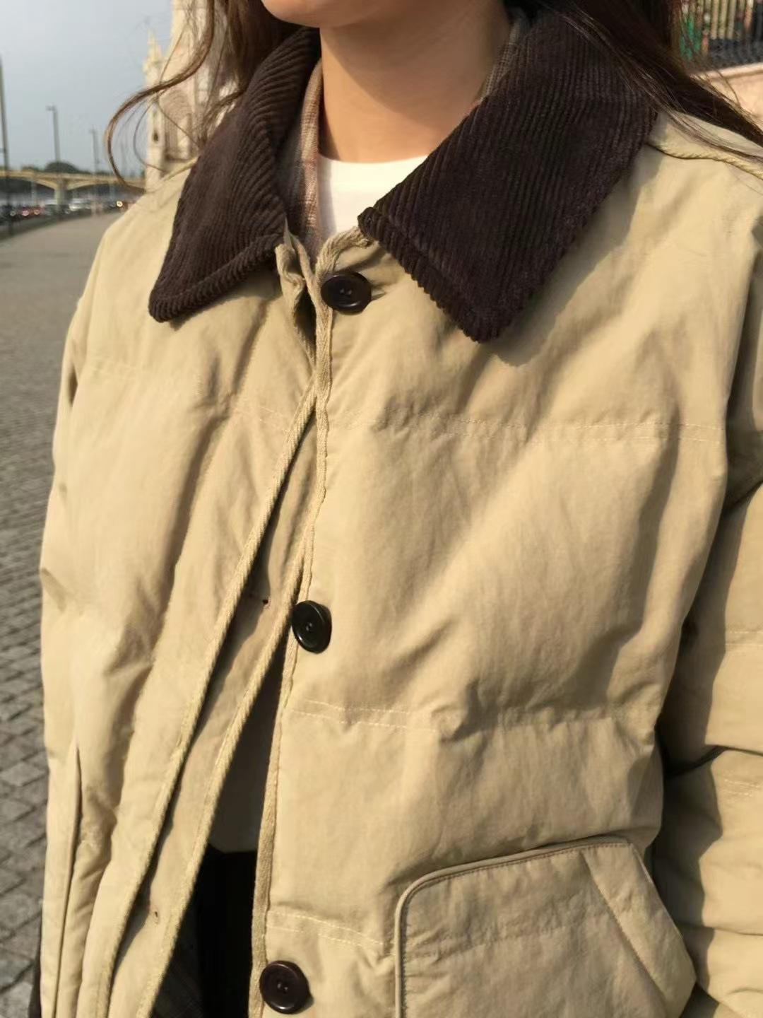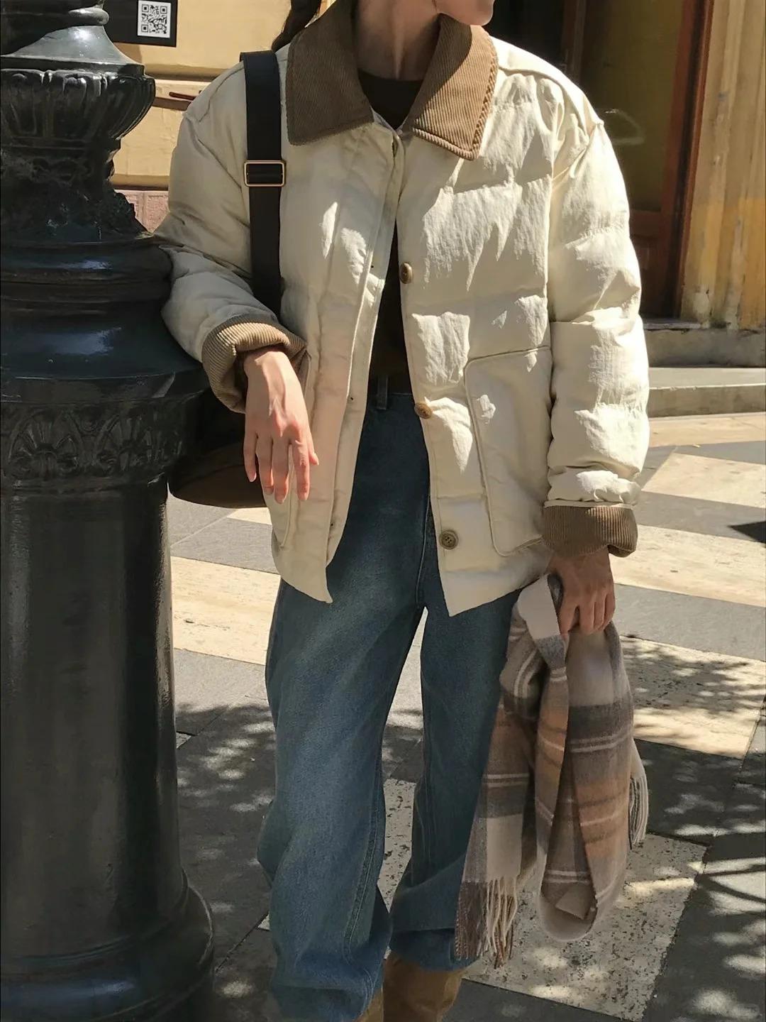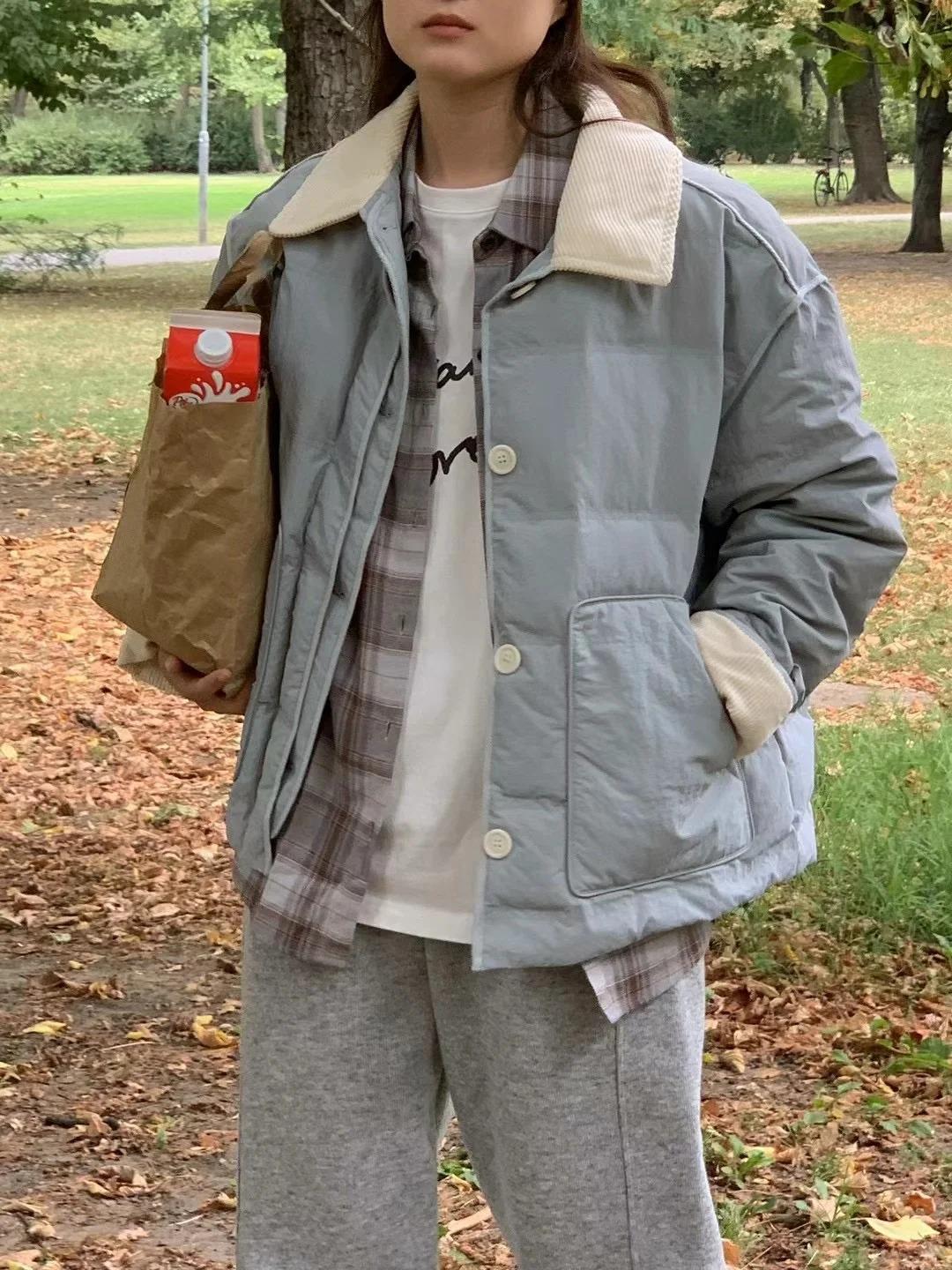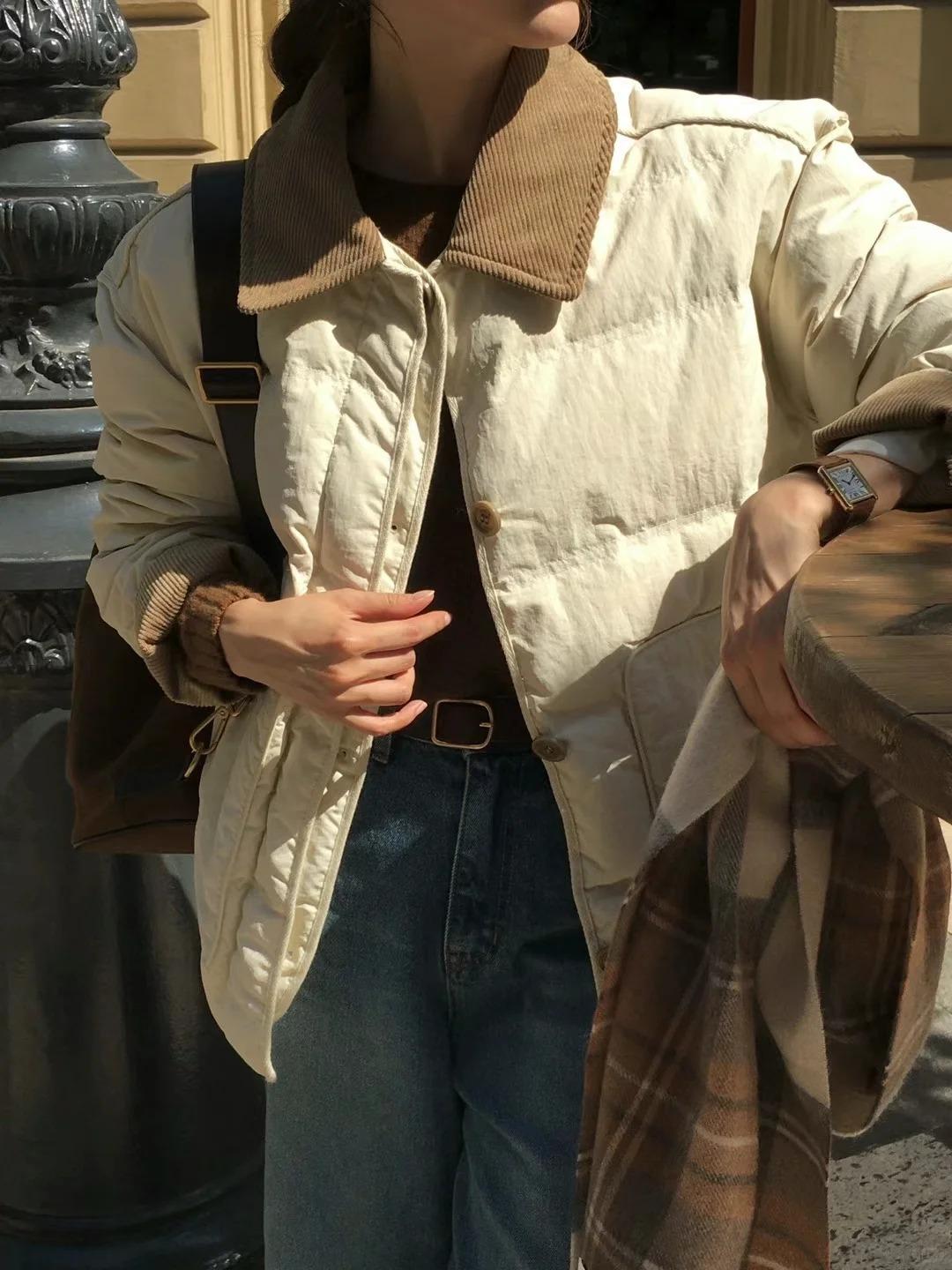 Stock Listo Chaqueta Acolchada de Pana con Solapa en Contraste 2024 Otoño e Invierno Nueva Chaqueta Simple Holgada de Estilo Coreano de Alta Gama