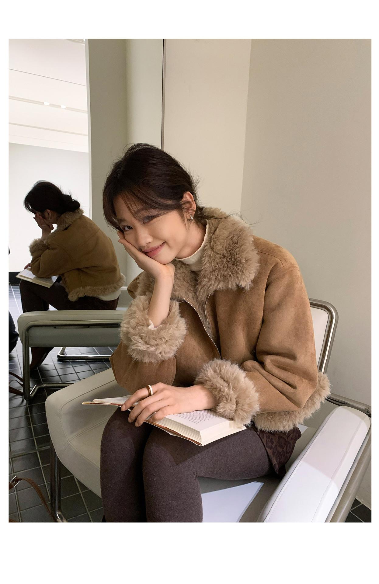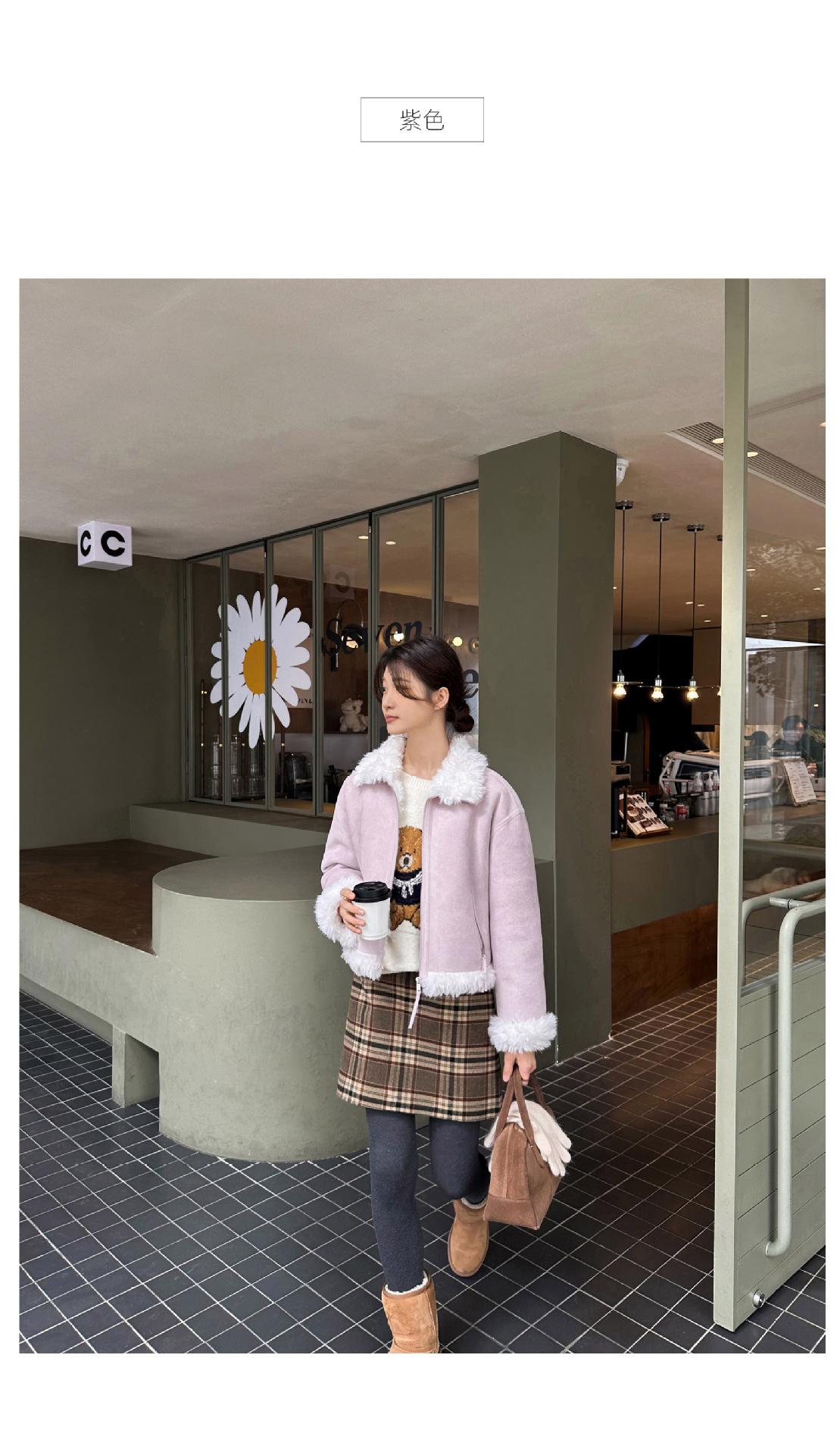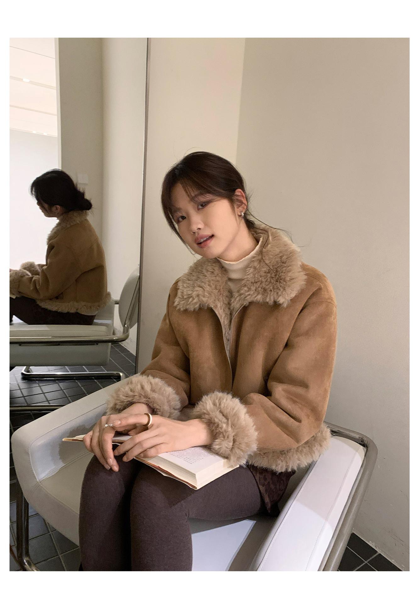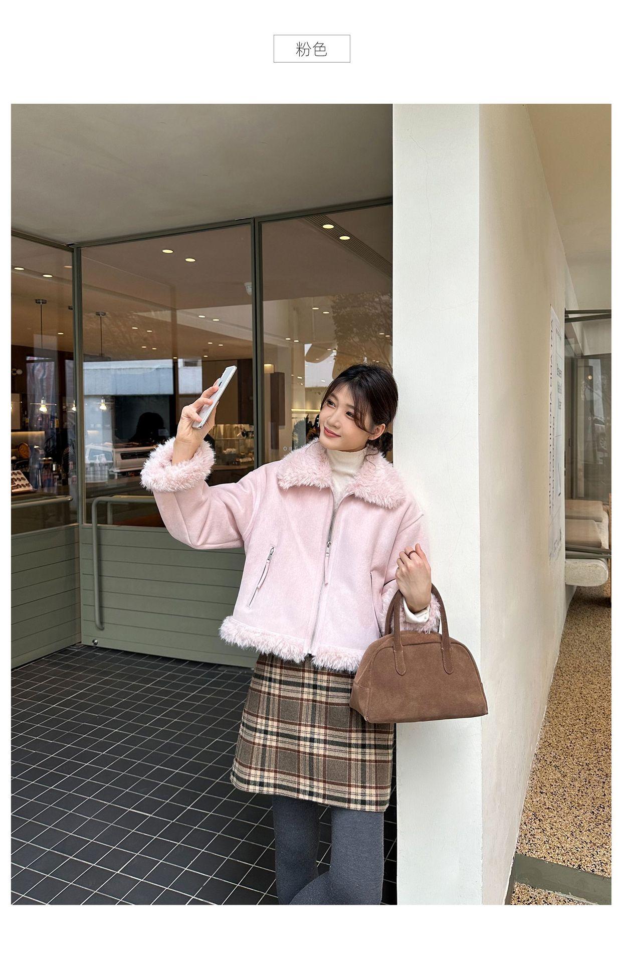 Chaqueta corta clásica de invierno con solapa y contraste de color para mujer, cálida y combinable con todo, con cremallera