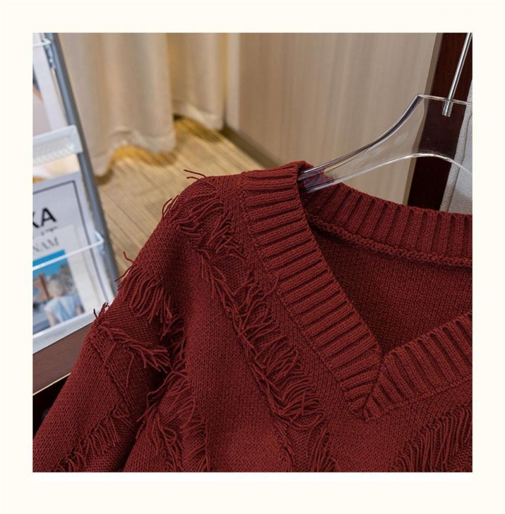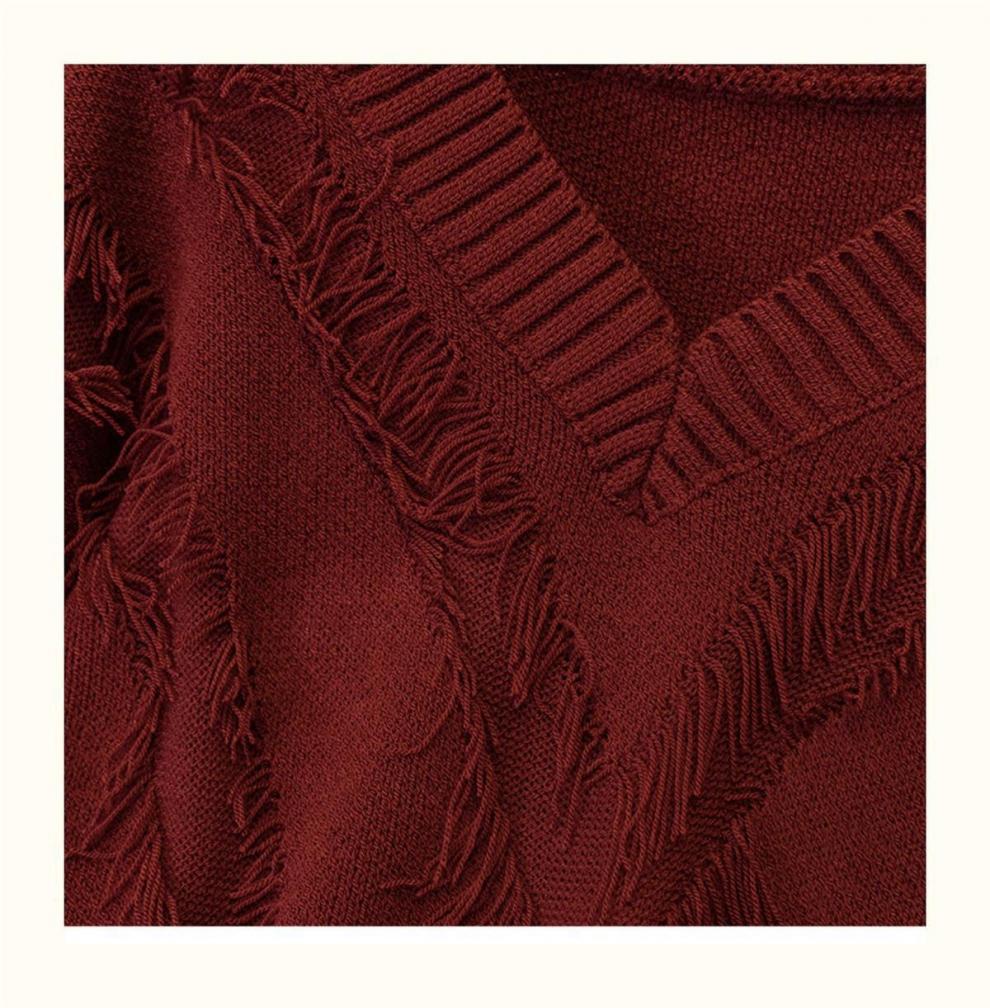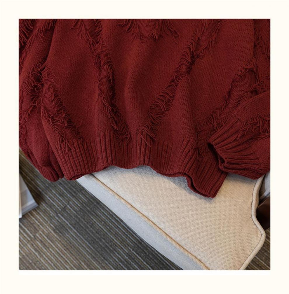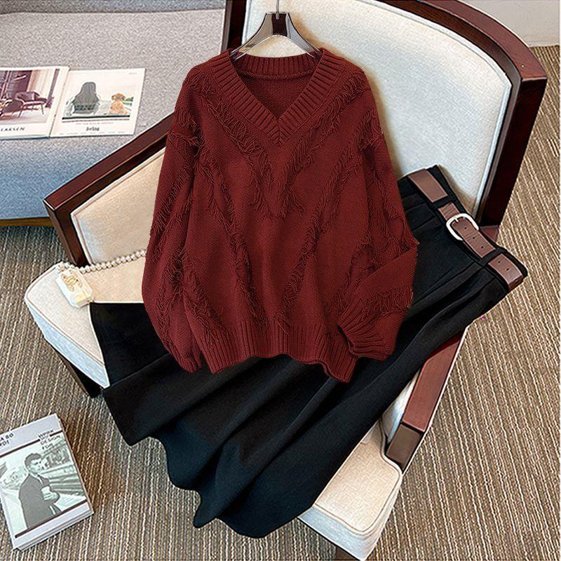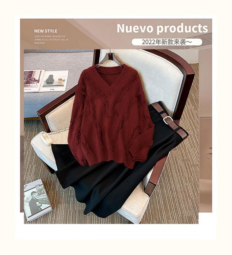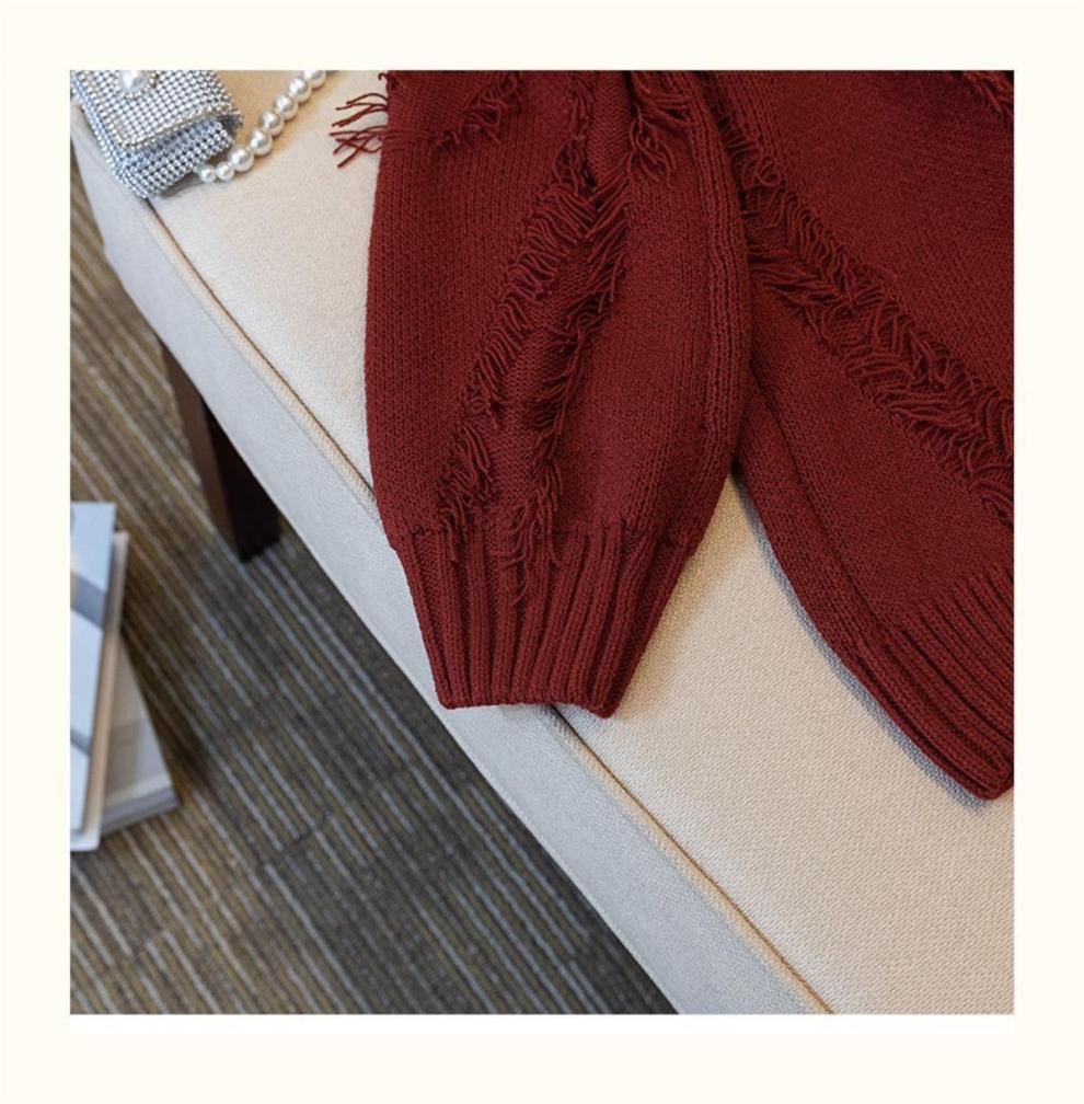 Suéter de Punto Rojo con Borlas de Primavera y Otoño con Sentido de Diseño Nuevo Falda de Cintura Alta Temperamento Conjunto de Dos Piezas Mujer