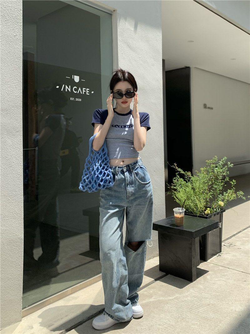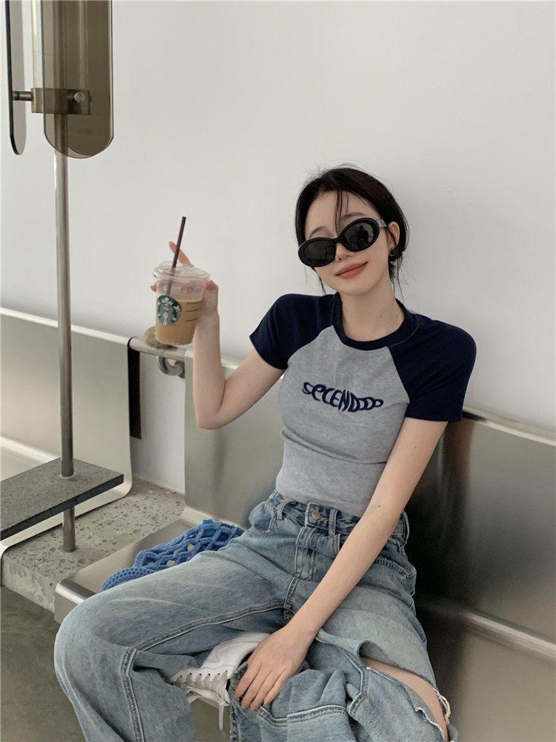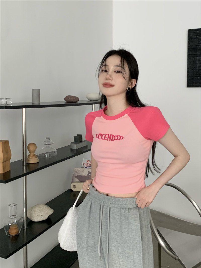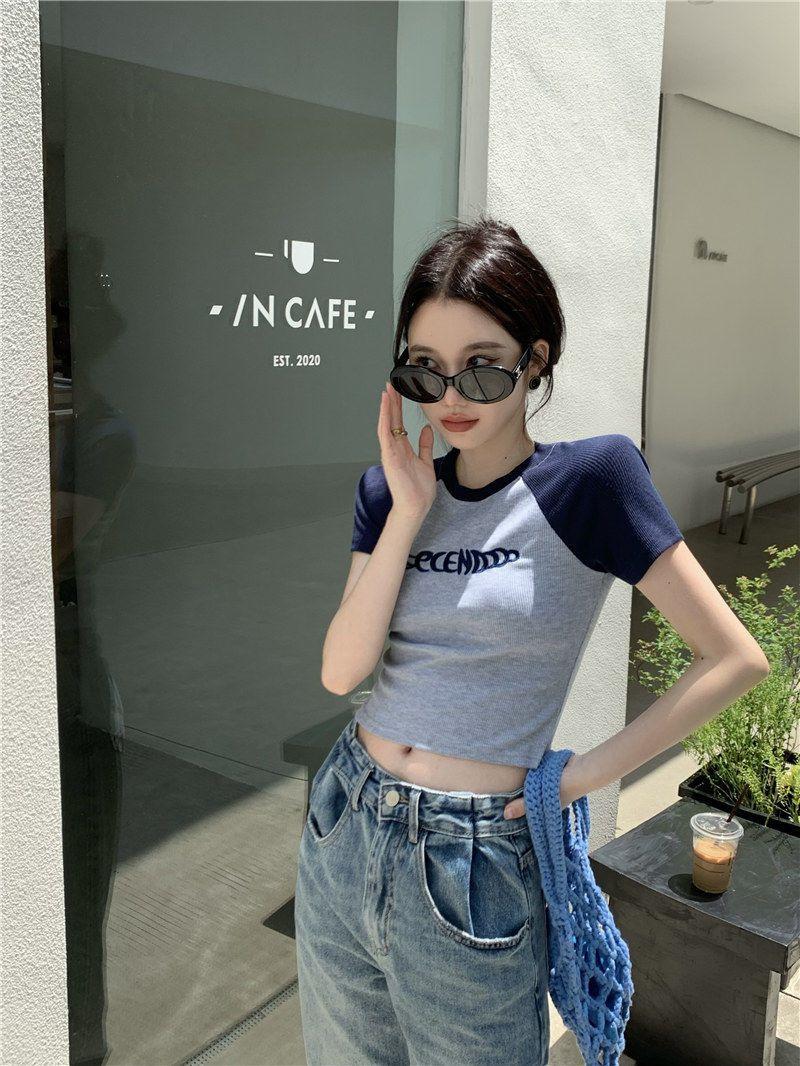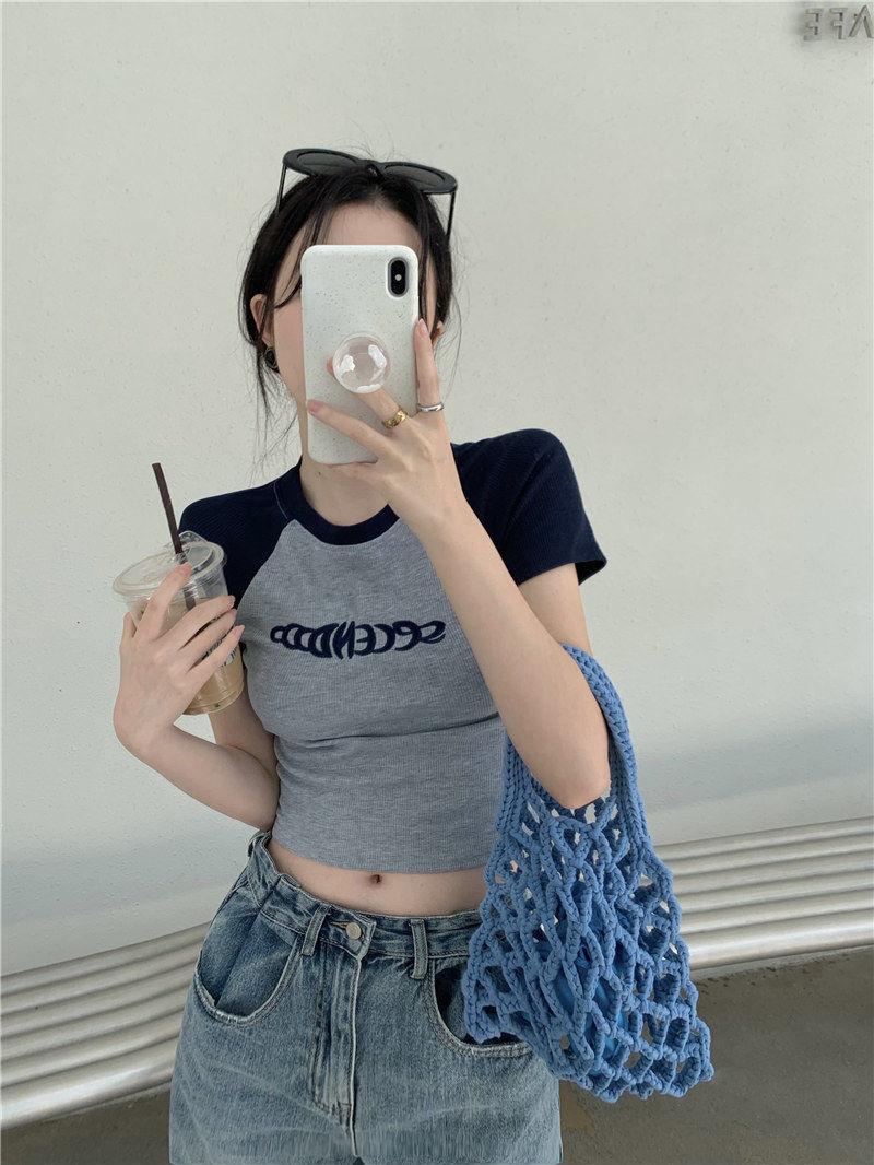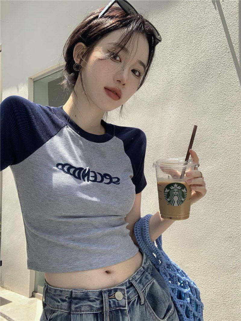 Camiseta de manga corta bordada para mujer, diseño de verano, estilo nicho, ajustada, dulce y sexy, con ombligo, top de moda.