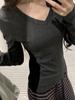 Estilo Chica Caliente Color Contrastante Look Adelgazante Cuello en V Camiseta de Manga Larga para Mujer Otoño e Invierno Moda Elegante Chic de Alta Gama Ropa Interior