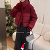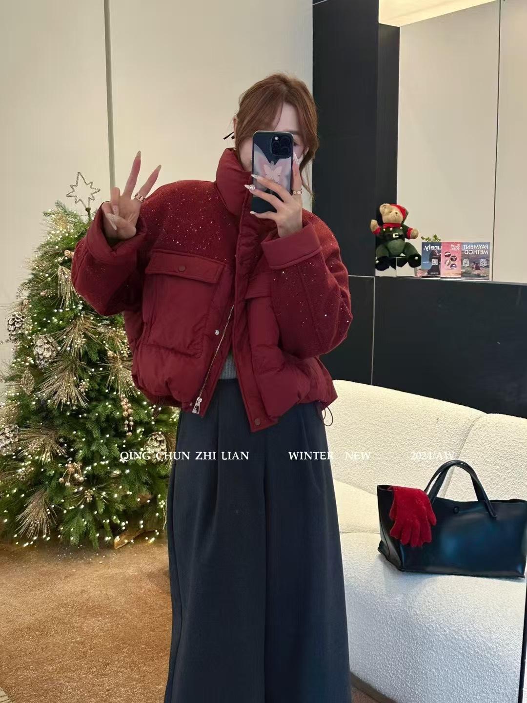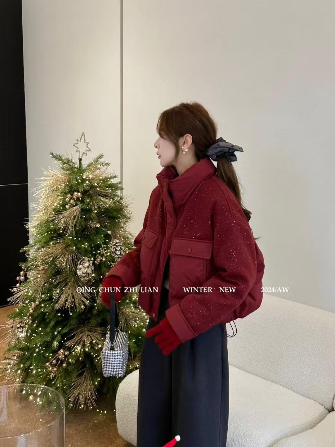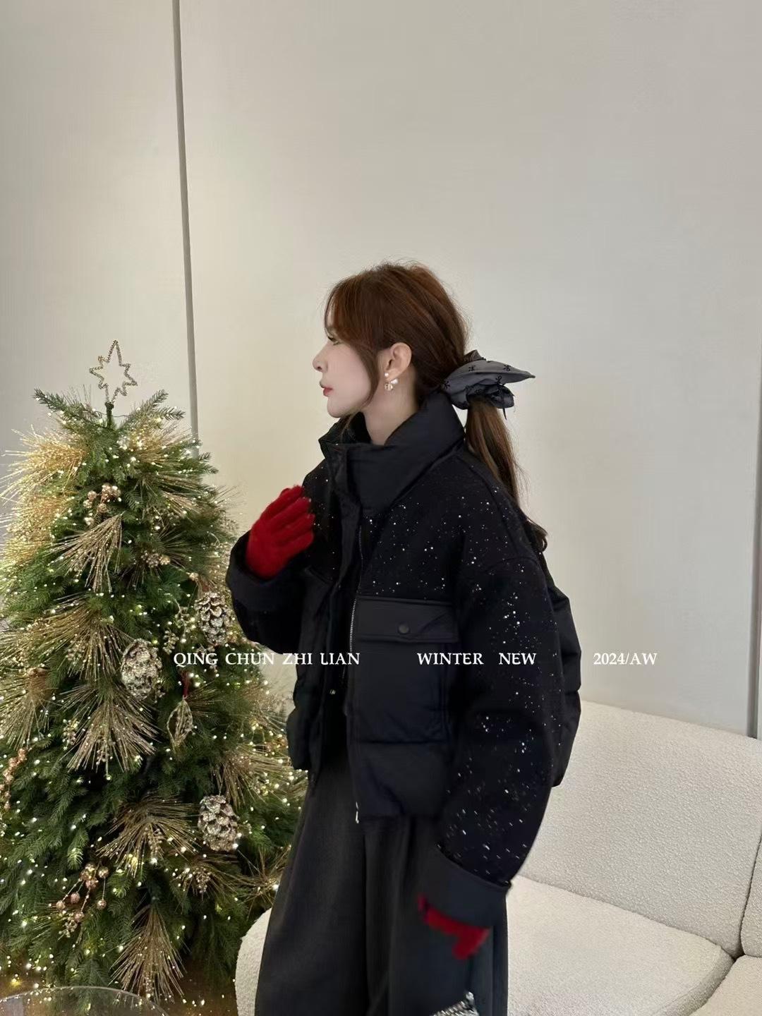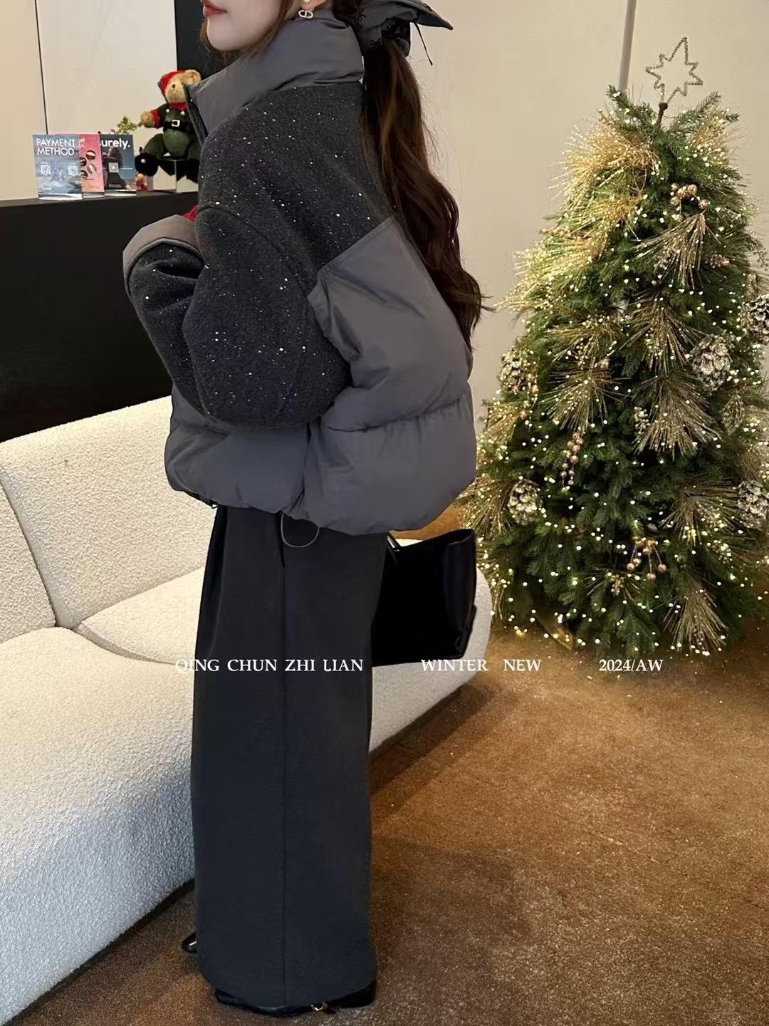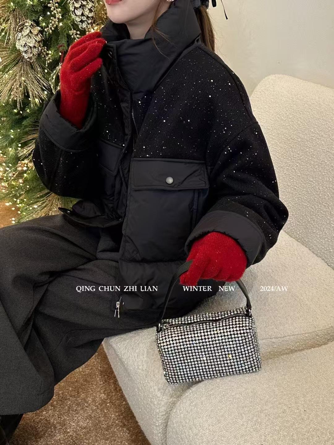 Chaqueta acolchada de algodón con costuras de lana con lentejuelas de cuello alto estilo coreano para mujer, nueva para el invierno 2024, diseño casual de corte relajado, abrigo cálido