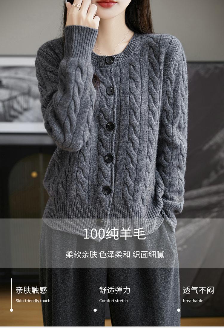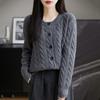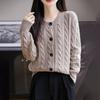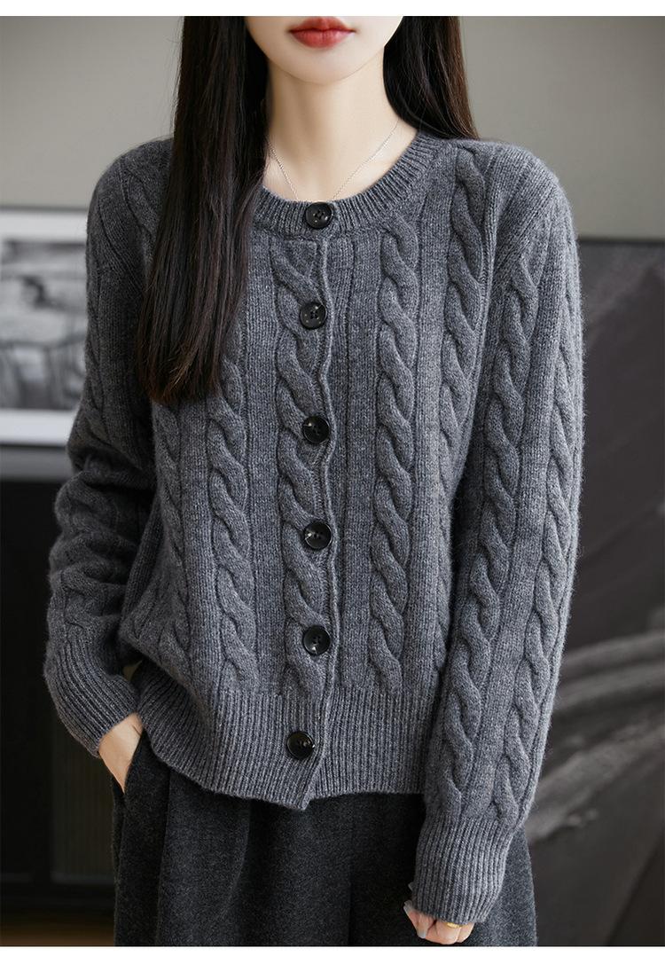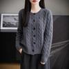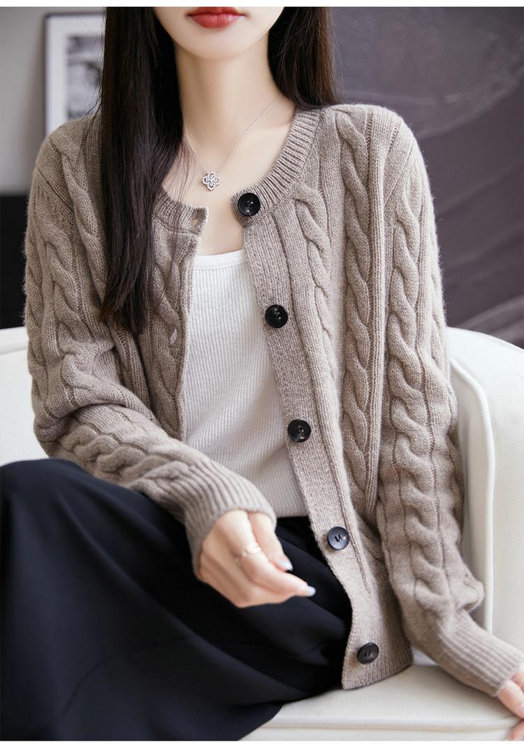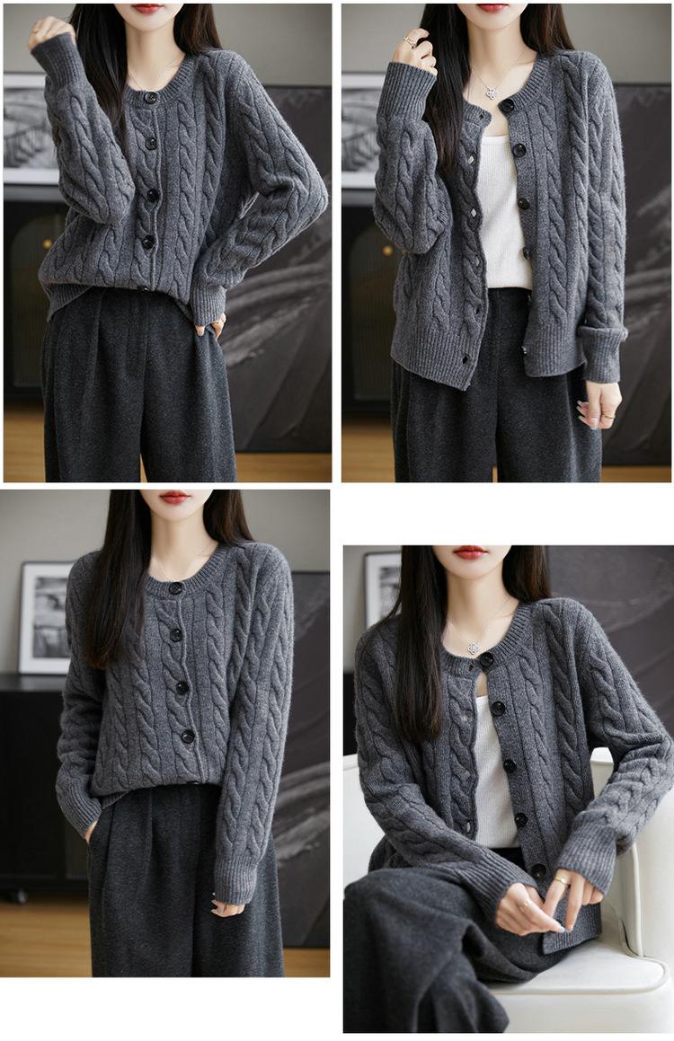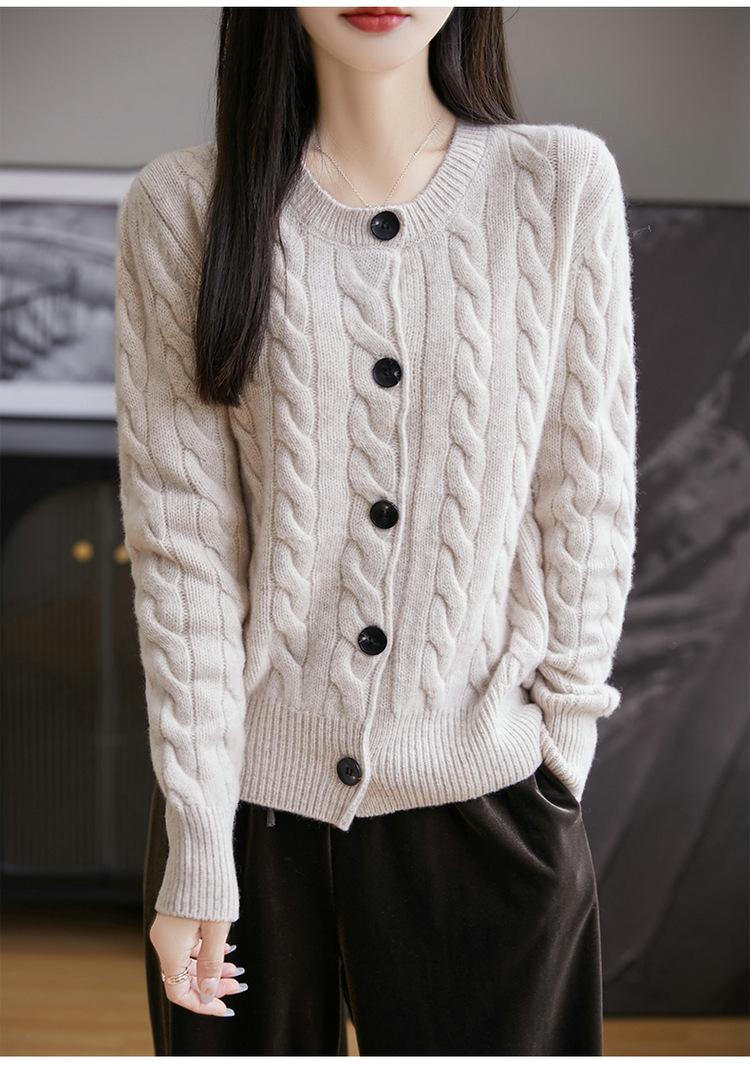 Suéter de lana pura con cuello redondo y giro para mujer, abrigo de otoño e invierno, cárdigan de punto elegante de estilo holgado y grueso.