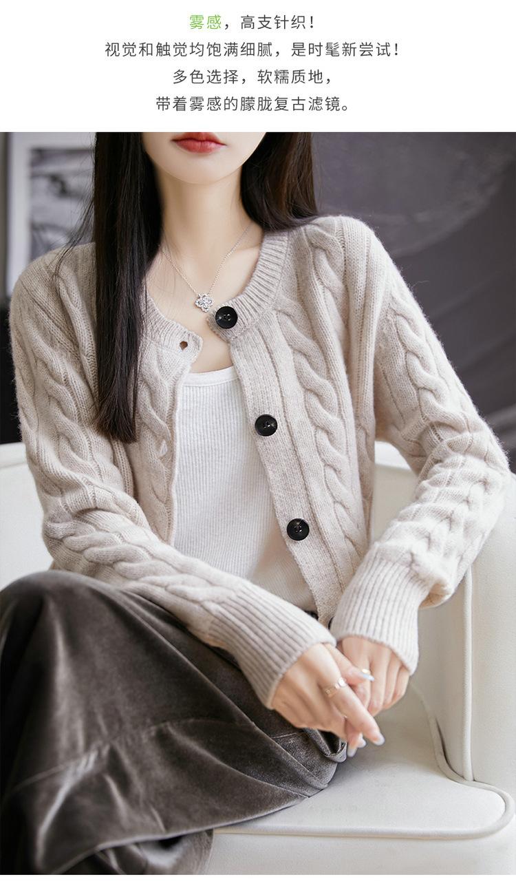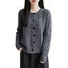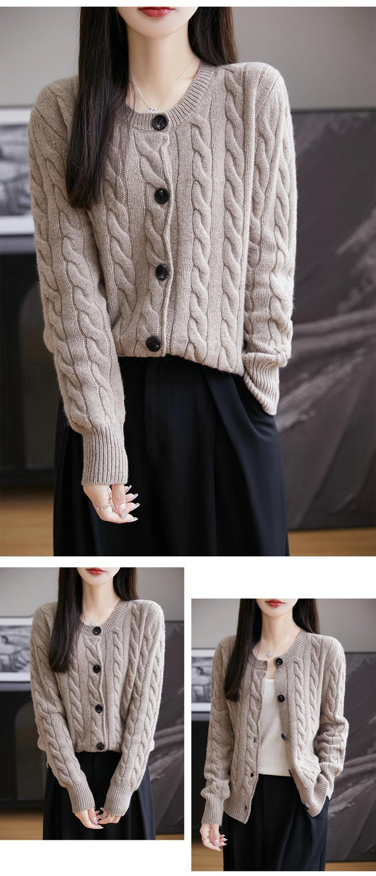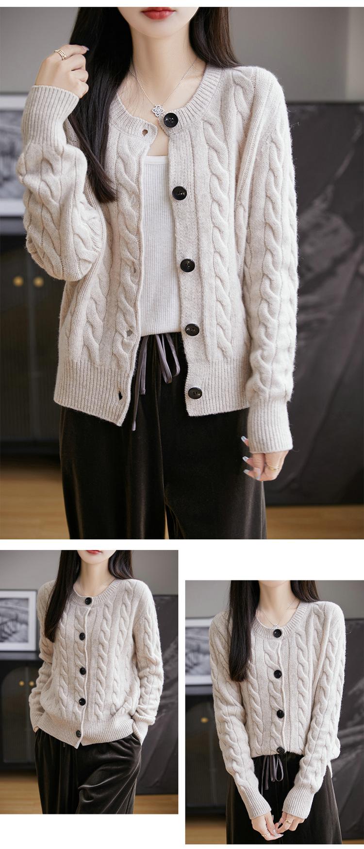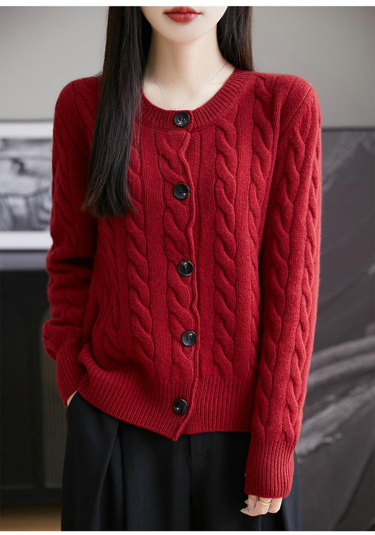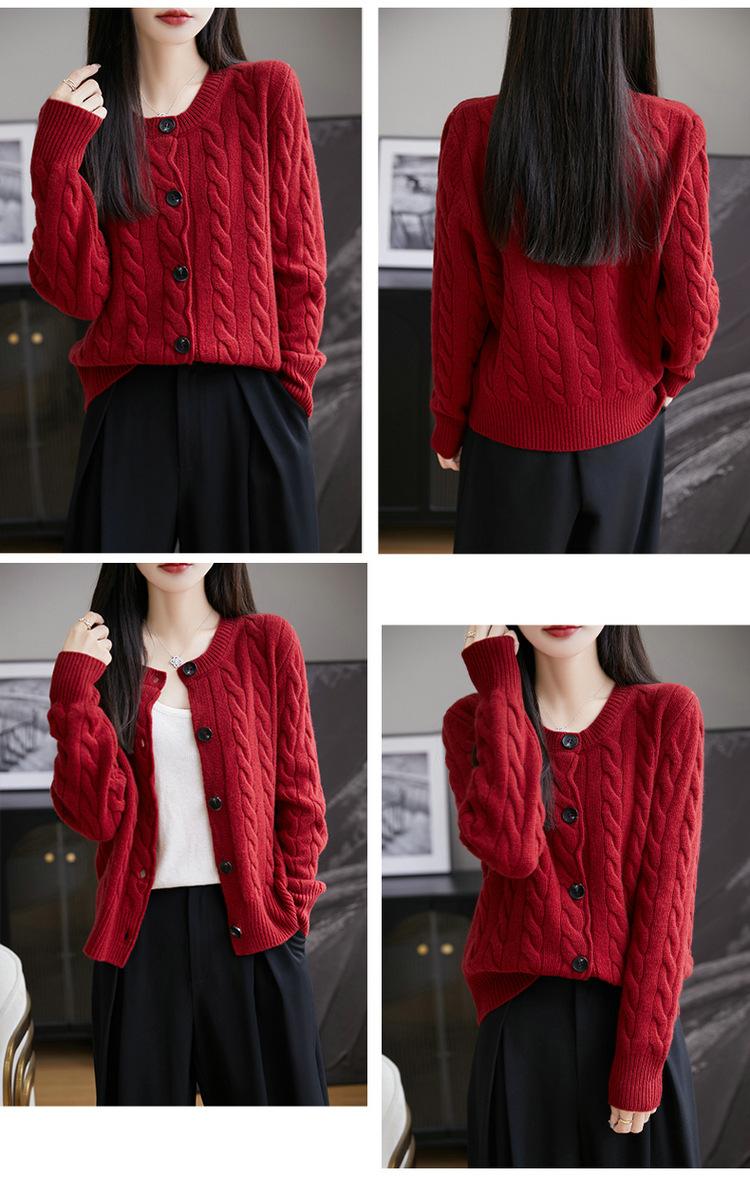 Suéter de lana pura con cuello redondo y giro para mujer, abrigo de otoño e invierno, cárdigan de punto elegante de estilo holgado y grueso.