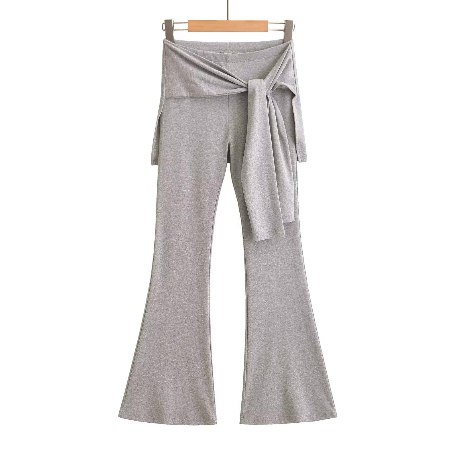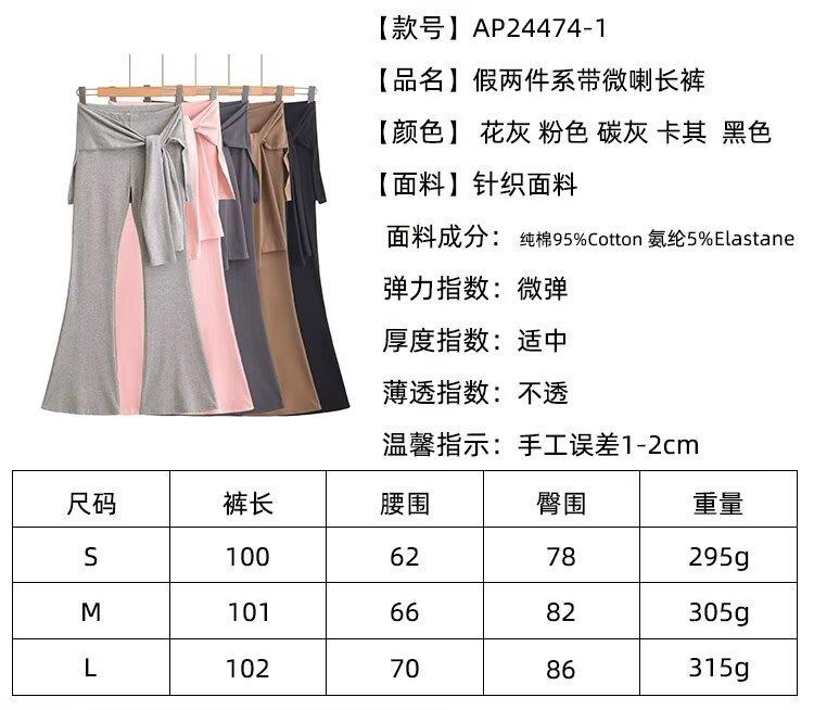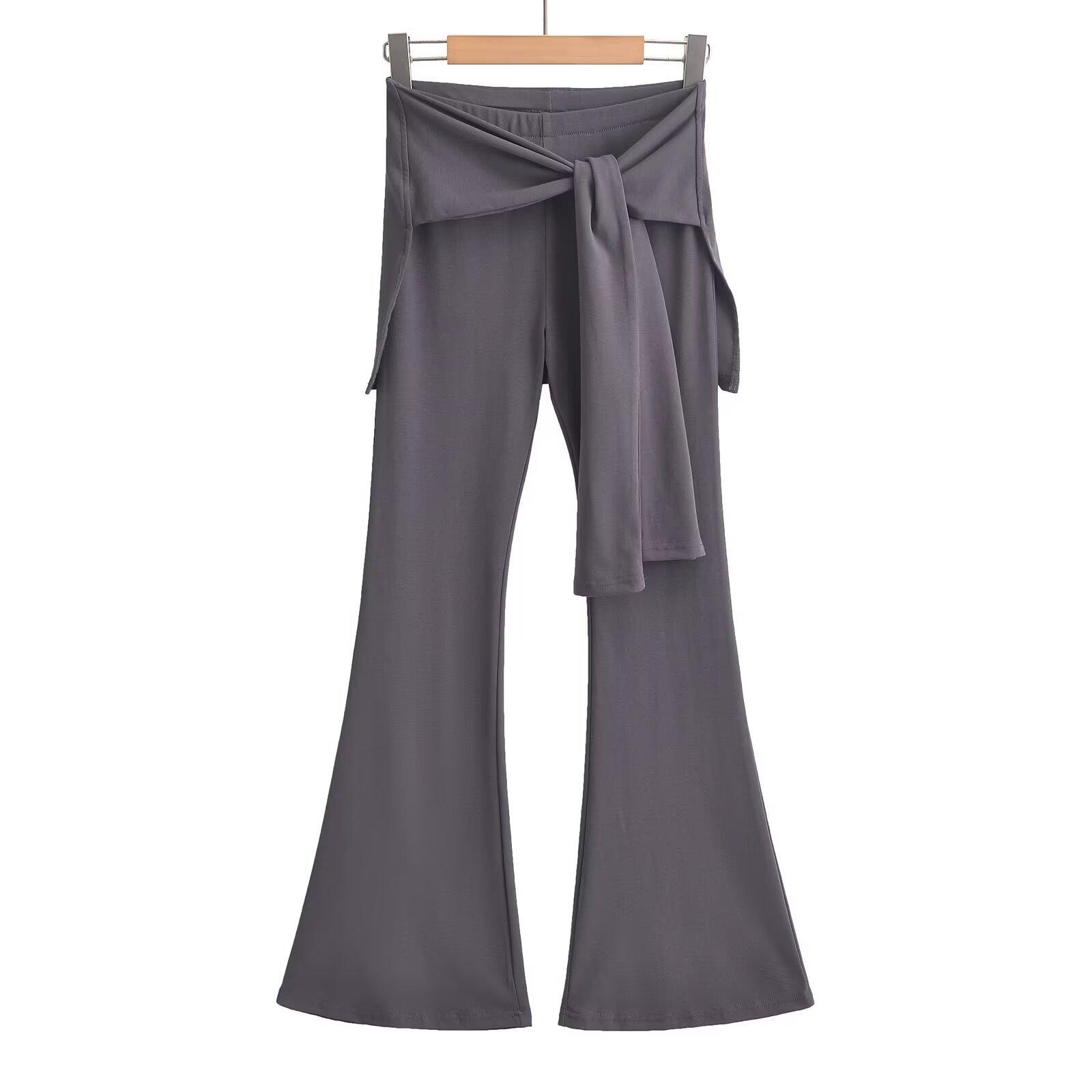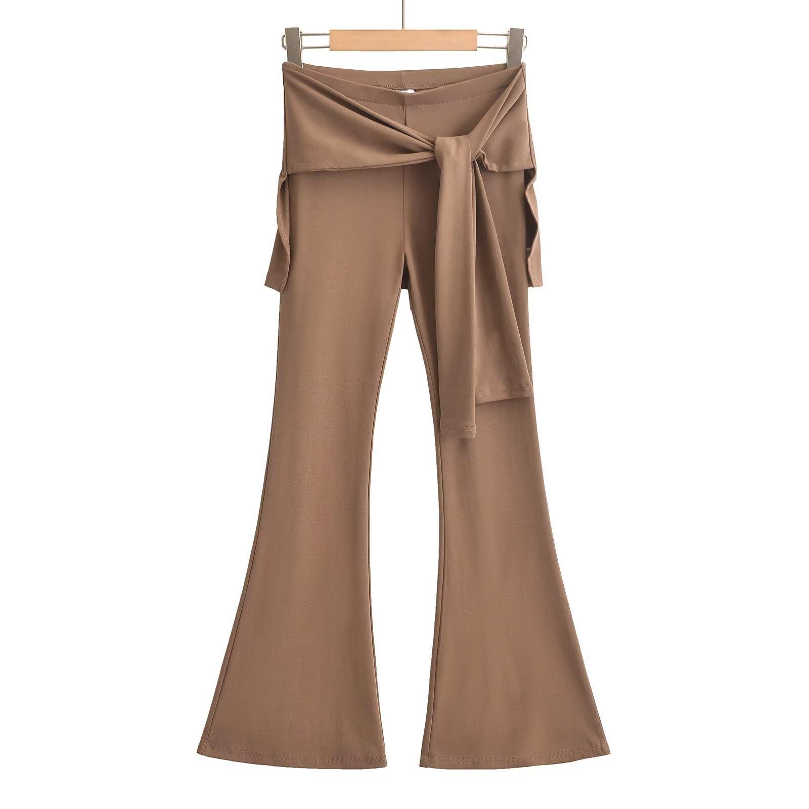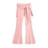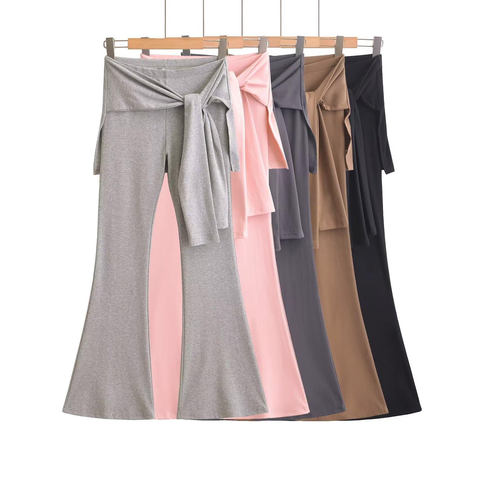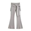 Venta al por mayor de comercio exterior transfronterizo para mujer, micro-pantalones de encaje con cordones de dos piezas falsas, diseño ajustado de cintura alta, pantalones acampanados con lazo