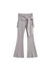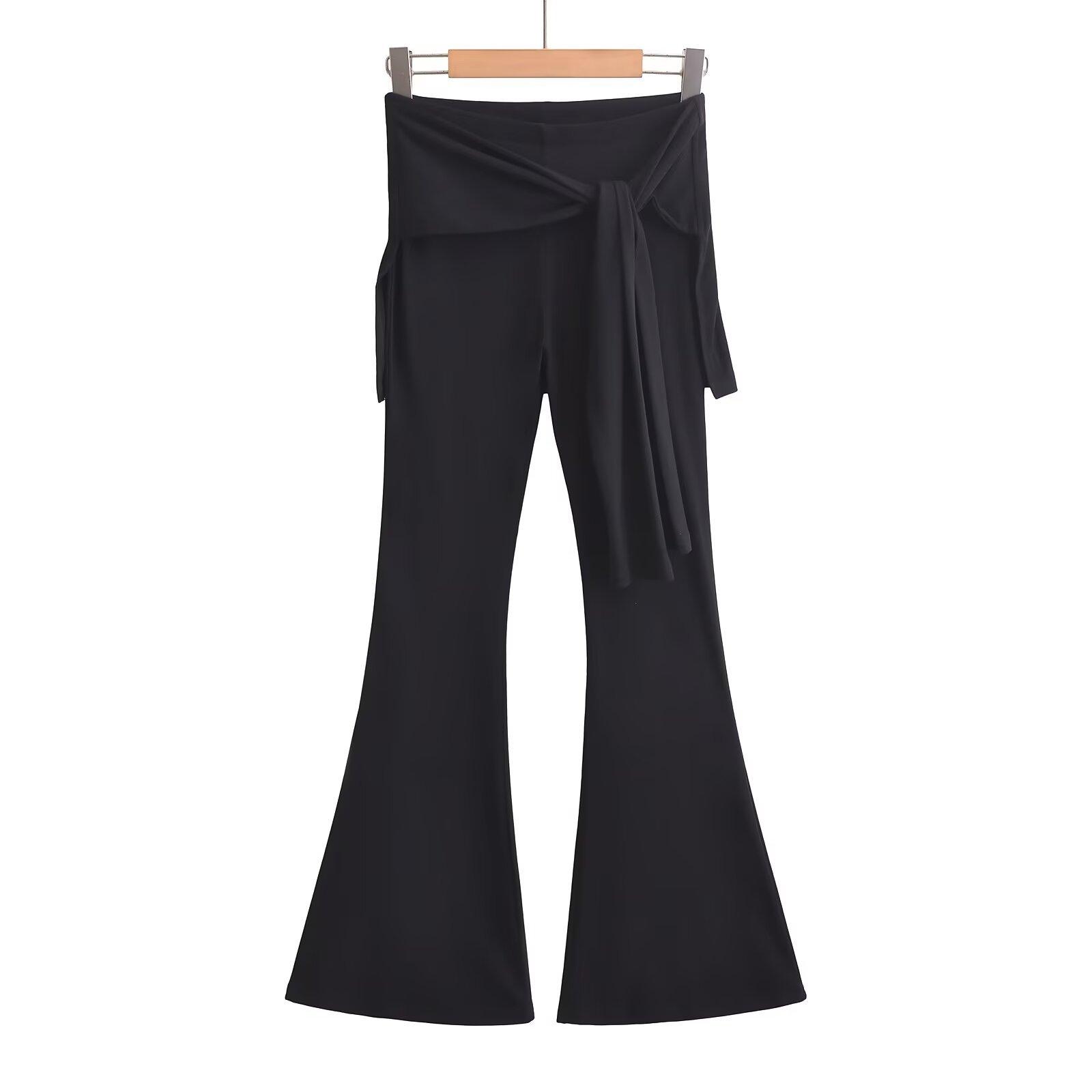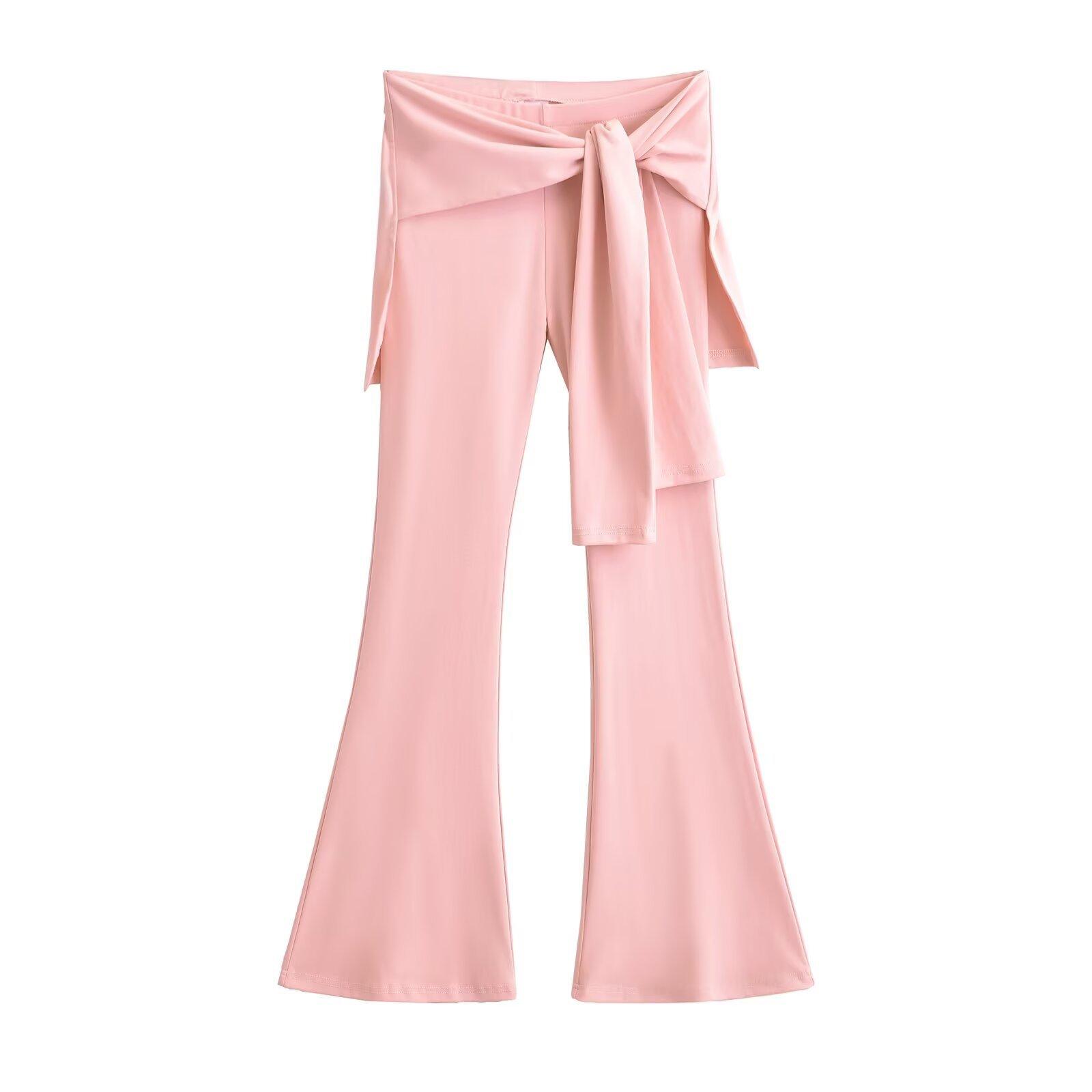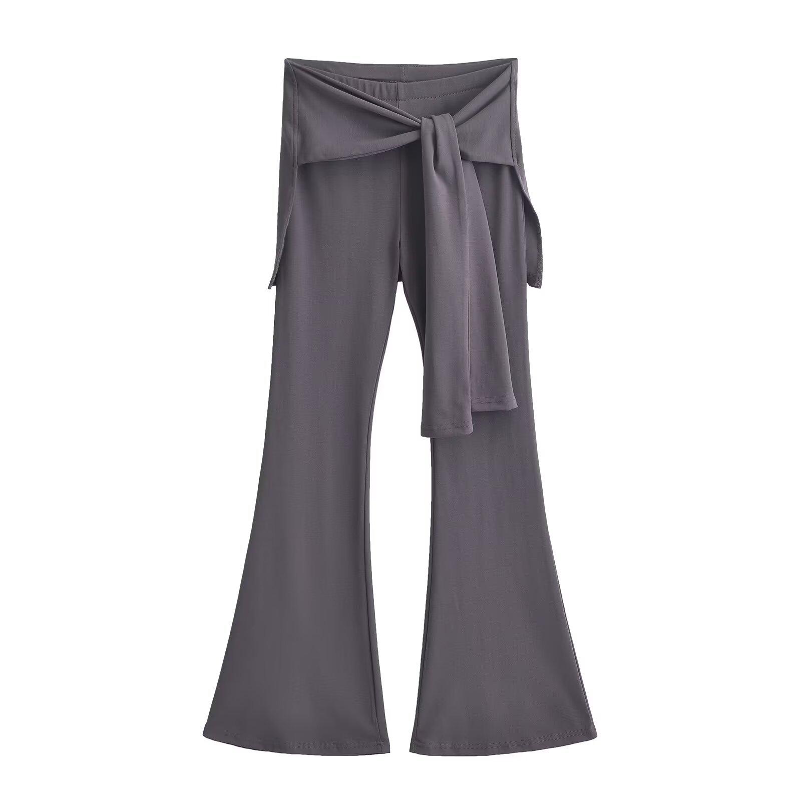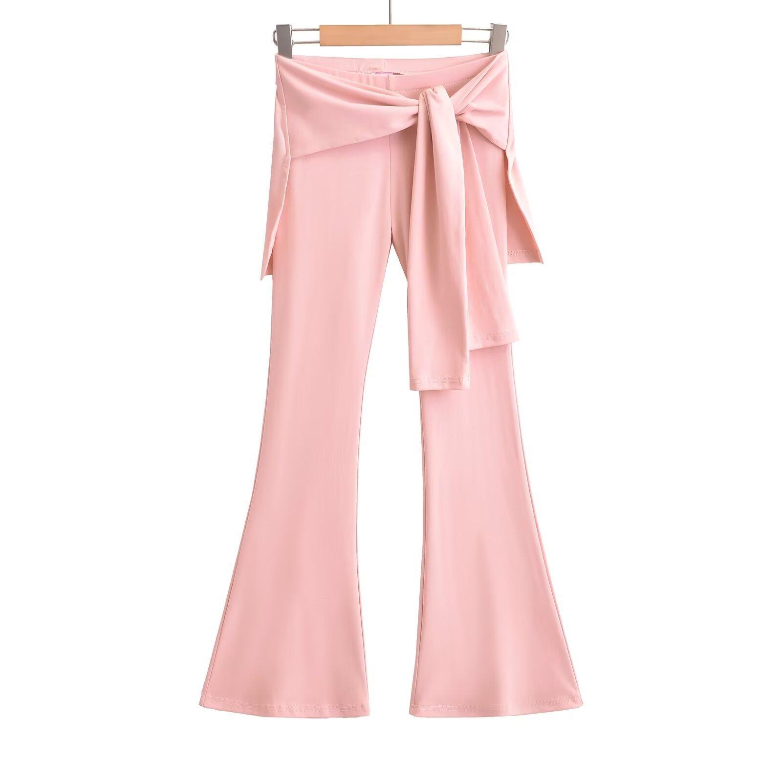 Venta al por mayor de comercio exterior transfronterizo para mujer, micro-pantalones de encaje con cordones de dos piezas falsas, diseño ajustado de cintura alta, pantalones acampanados con lazo
