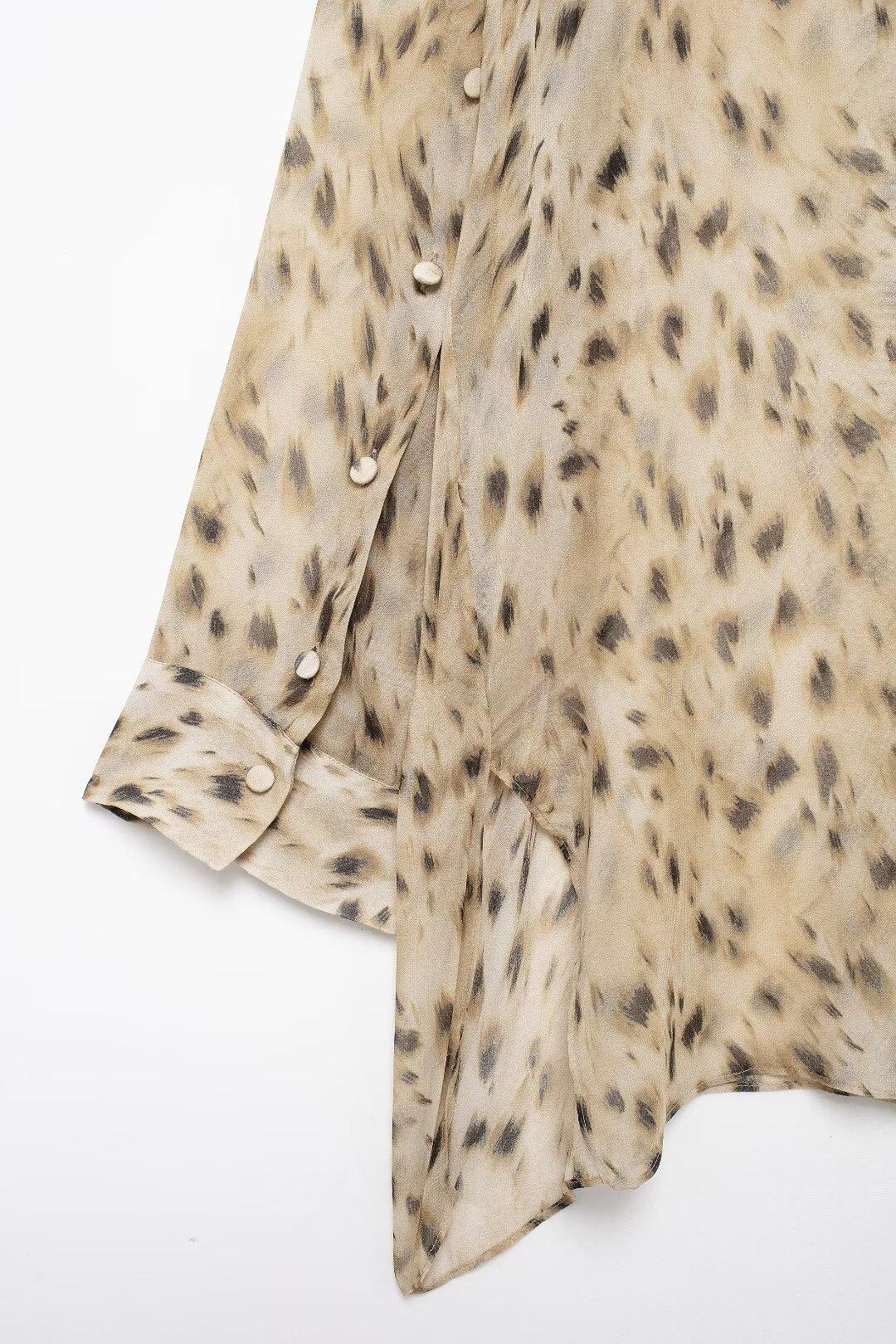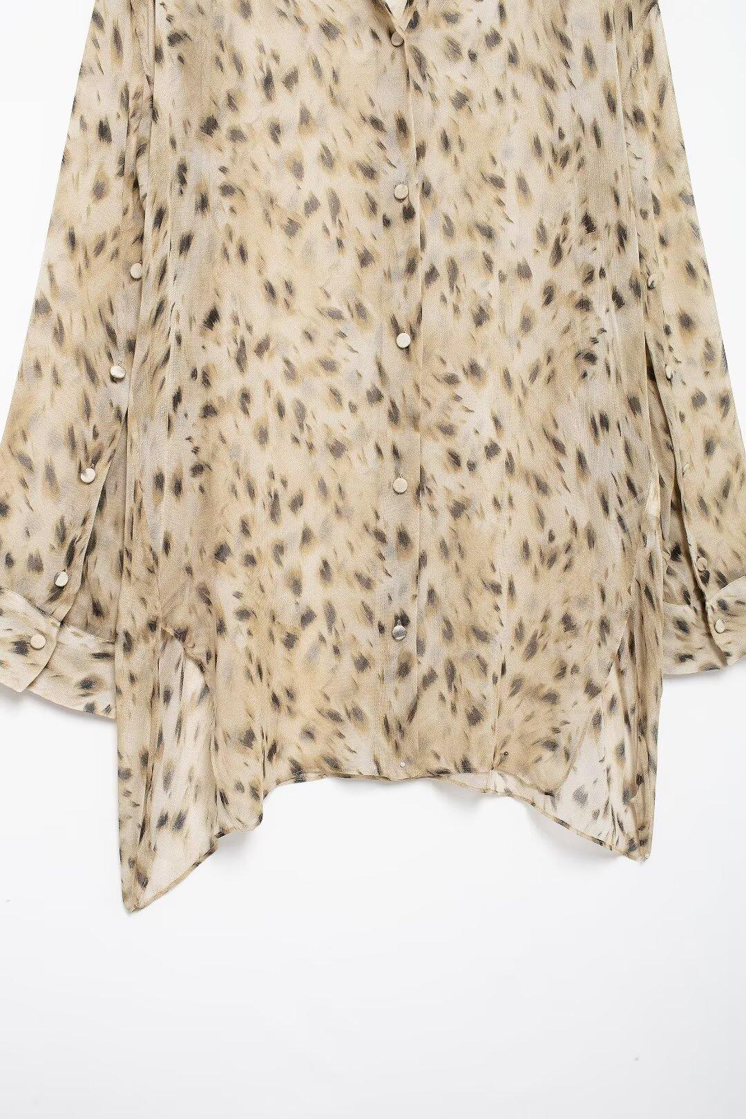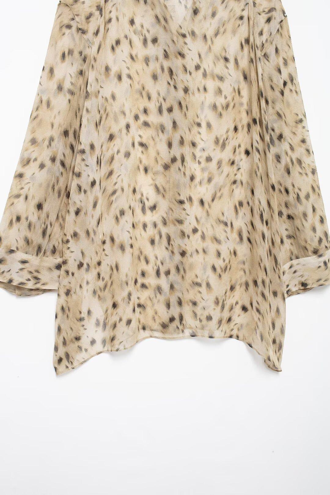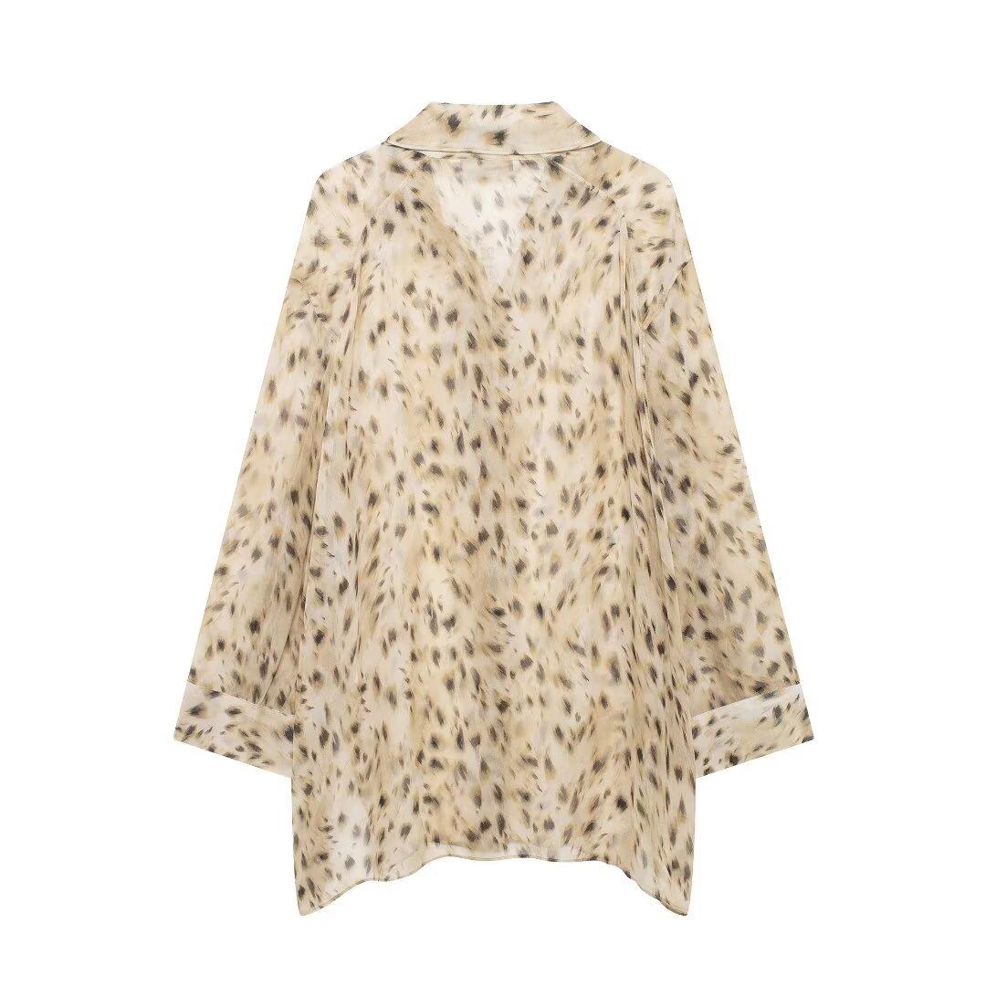 Camisa de manga larga con solapa y estampado animal translúcido para mujer, estilo europeo y americano transfronterizo 2024