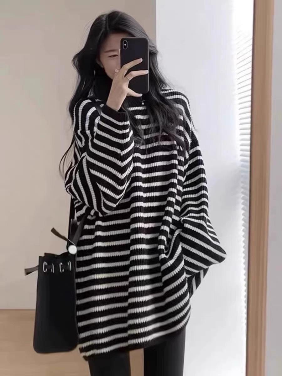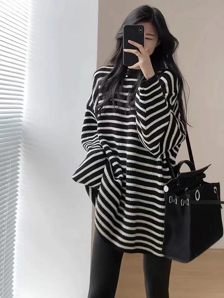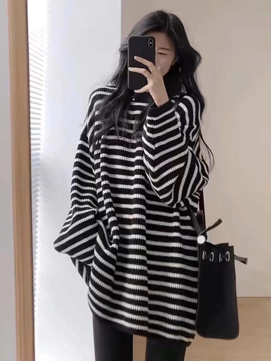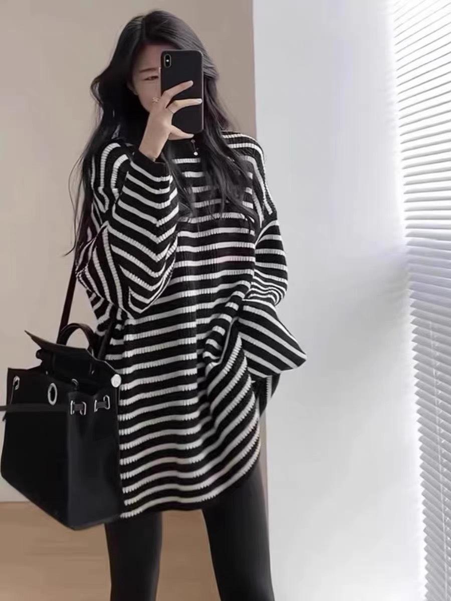 Suéter informal holgado de cuello redondo a rayas de longitud media para mujer, otoño e invierno 2024, camisa de punto de lana pura