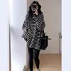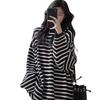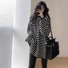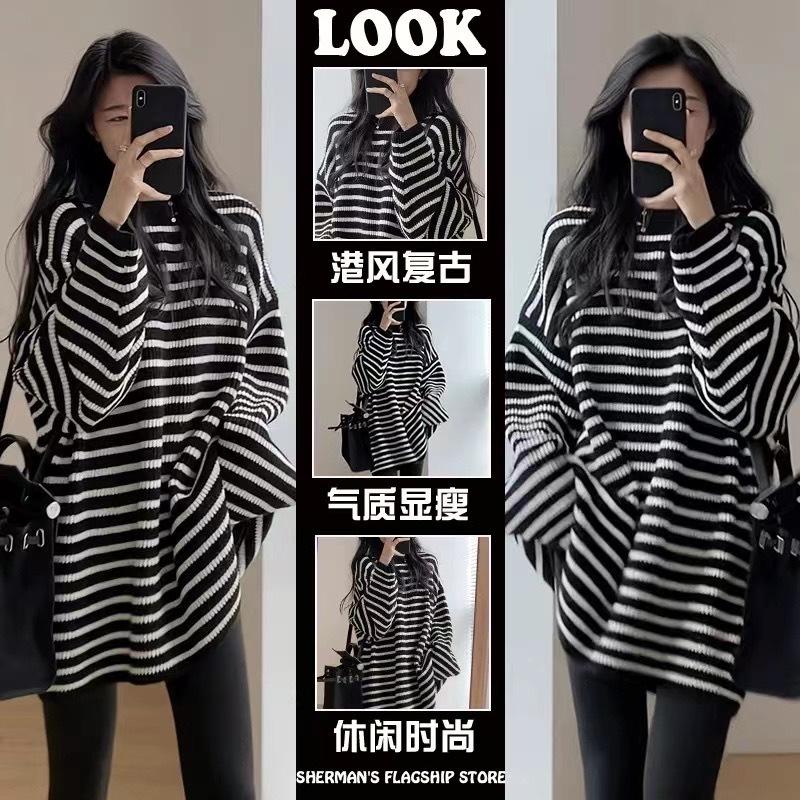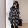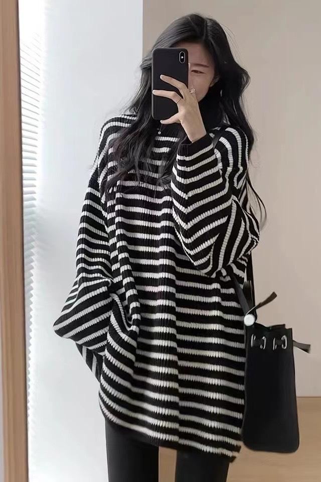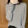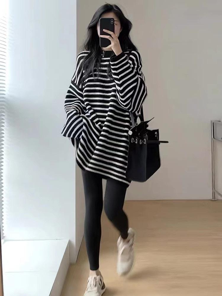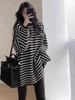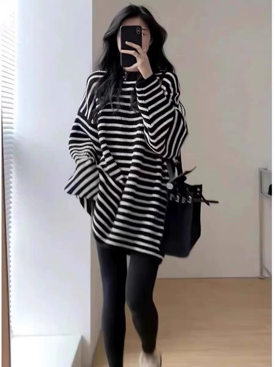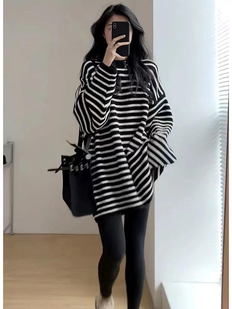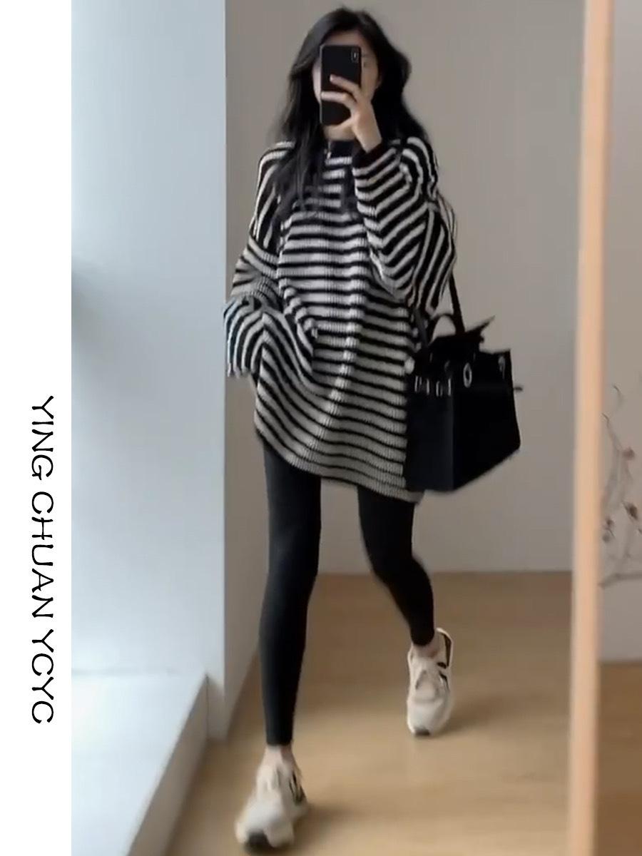 Suéter informal holgado de cuello redondo a rayas de longitud media para mujer, otoño e invierno 2024, camisa de punto de lana pura