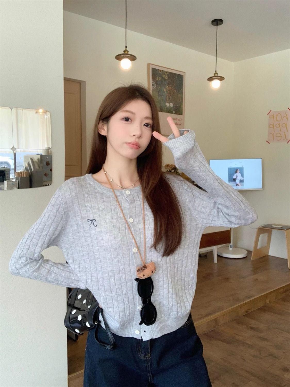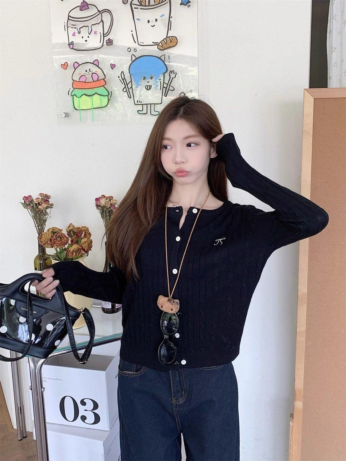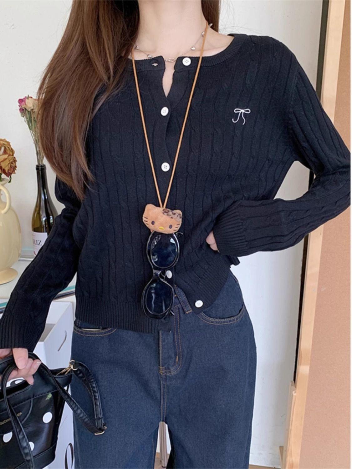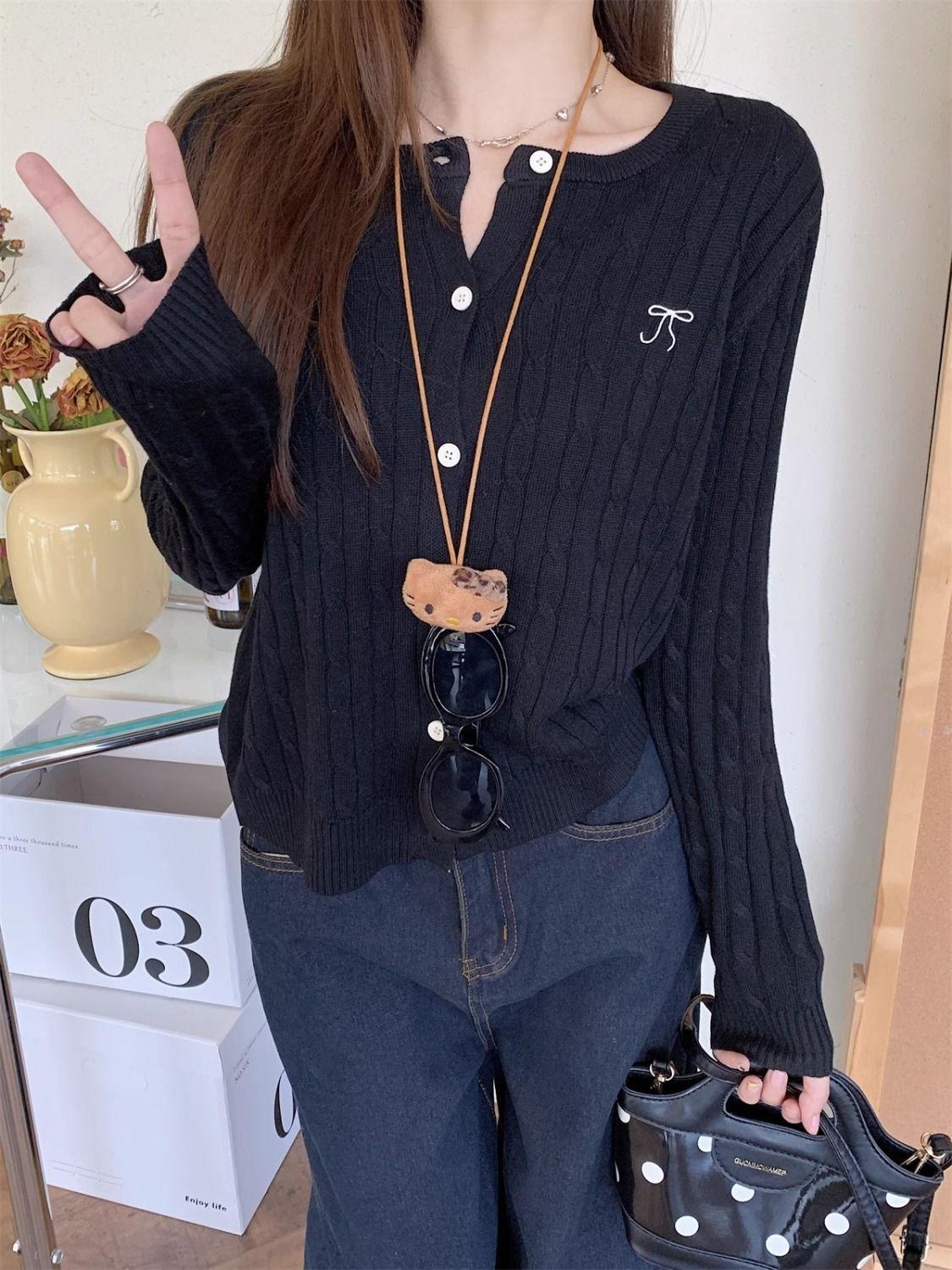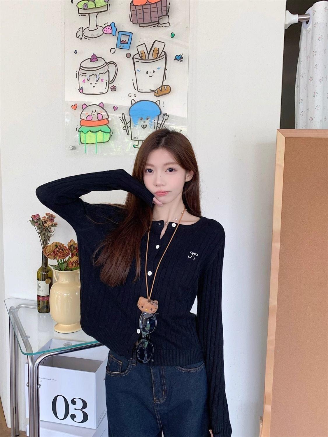 Suéter de manga larga para mujer, otoño e invierno 2024, nuevo diseño de botones, cuello redondo, color liso, suéter corto y cálido