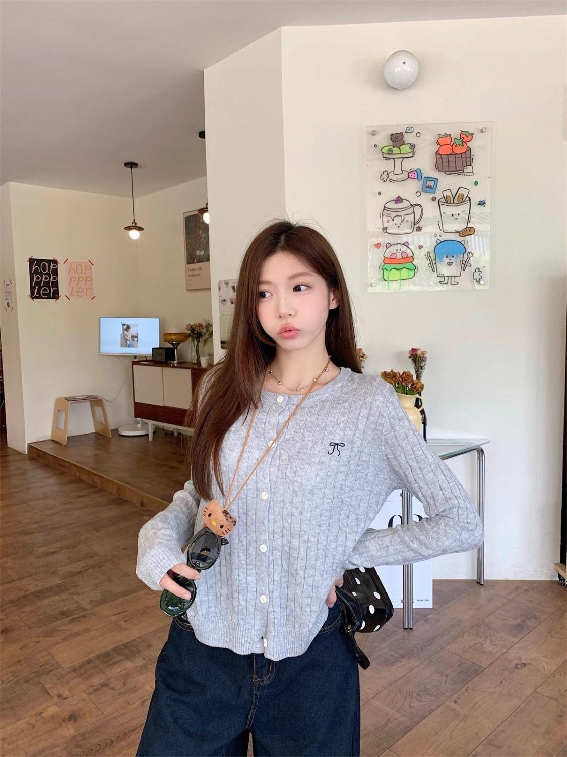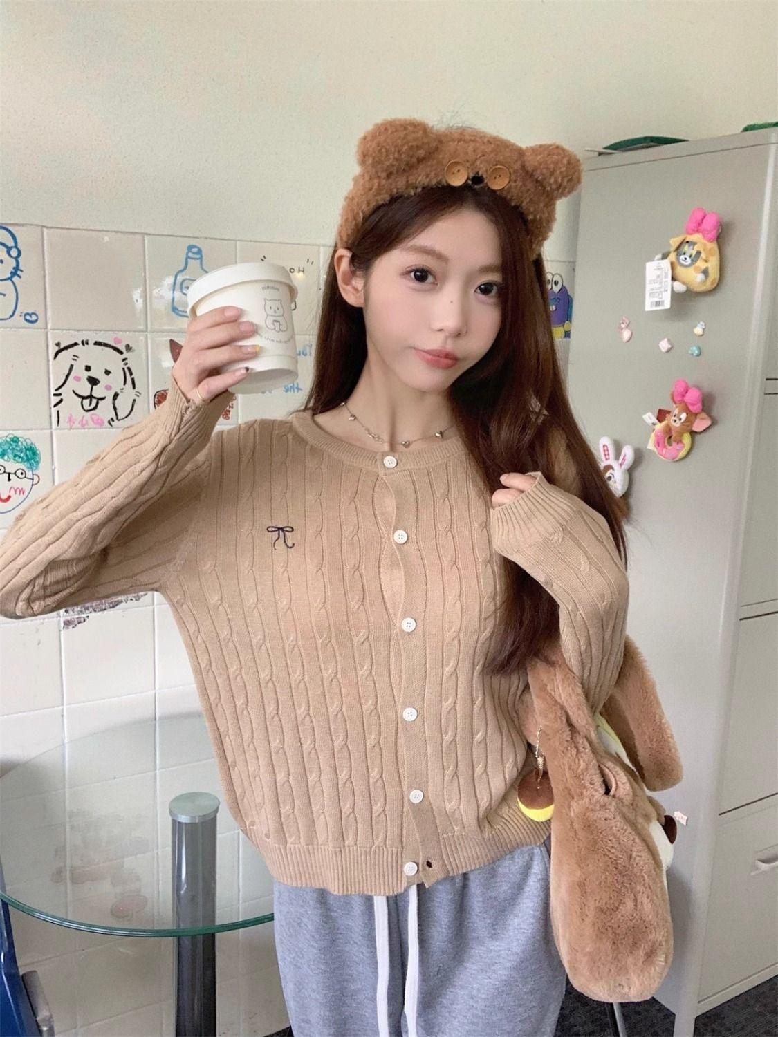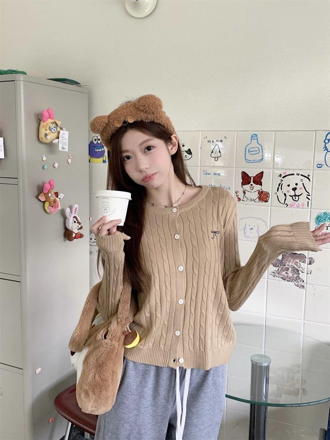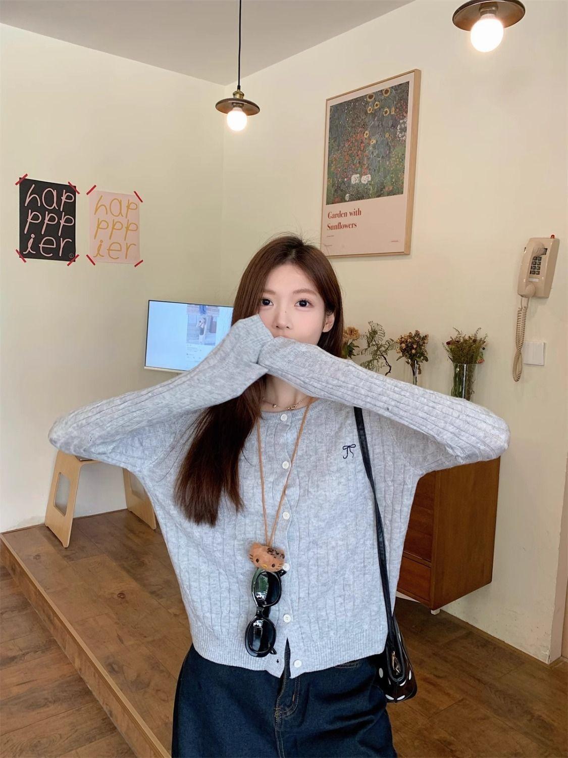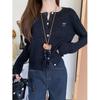 Suéter de manga larga para mujer, otoño e invierno 2024, nuevo diseño de botones, cuello redondo, color liso, suéter corto y cálido