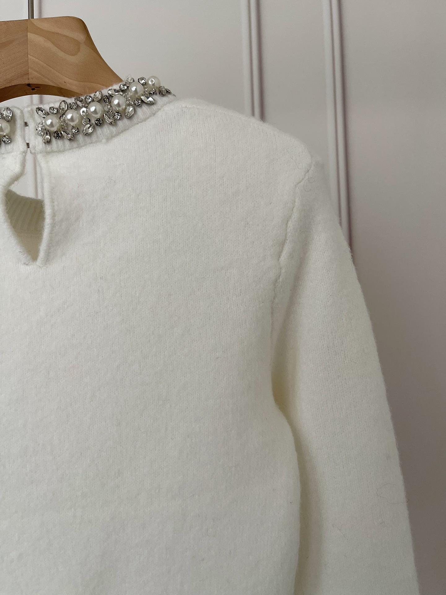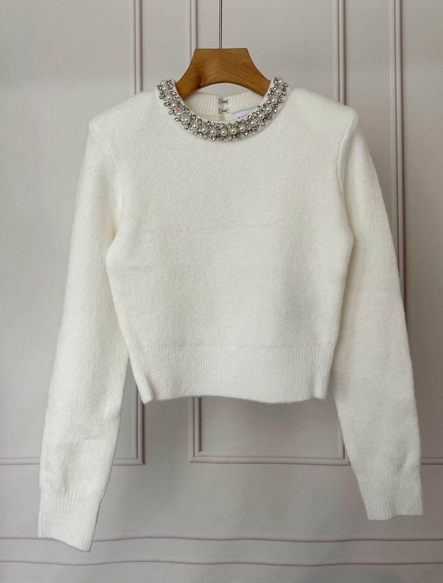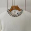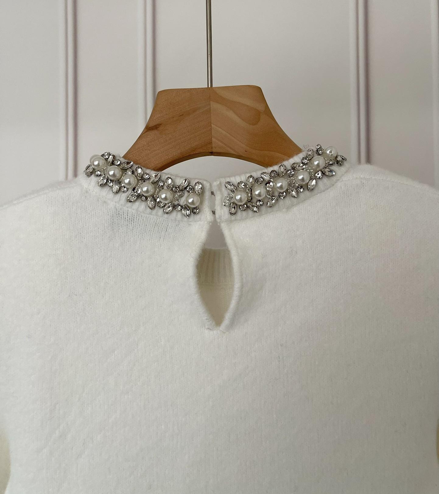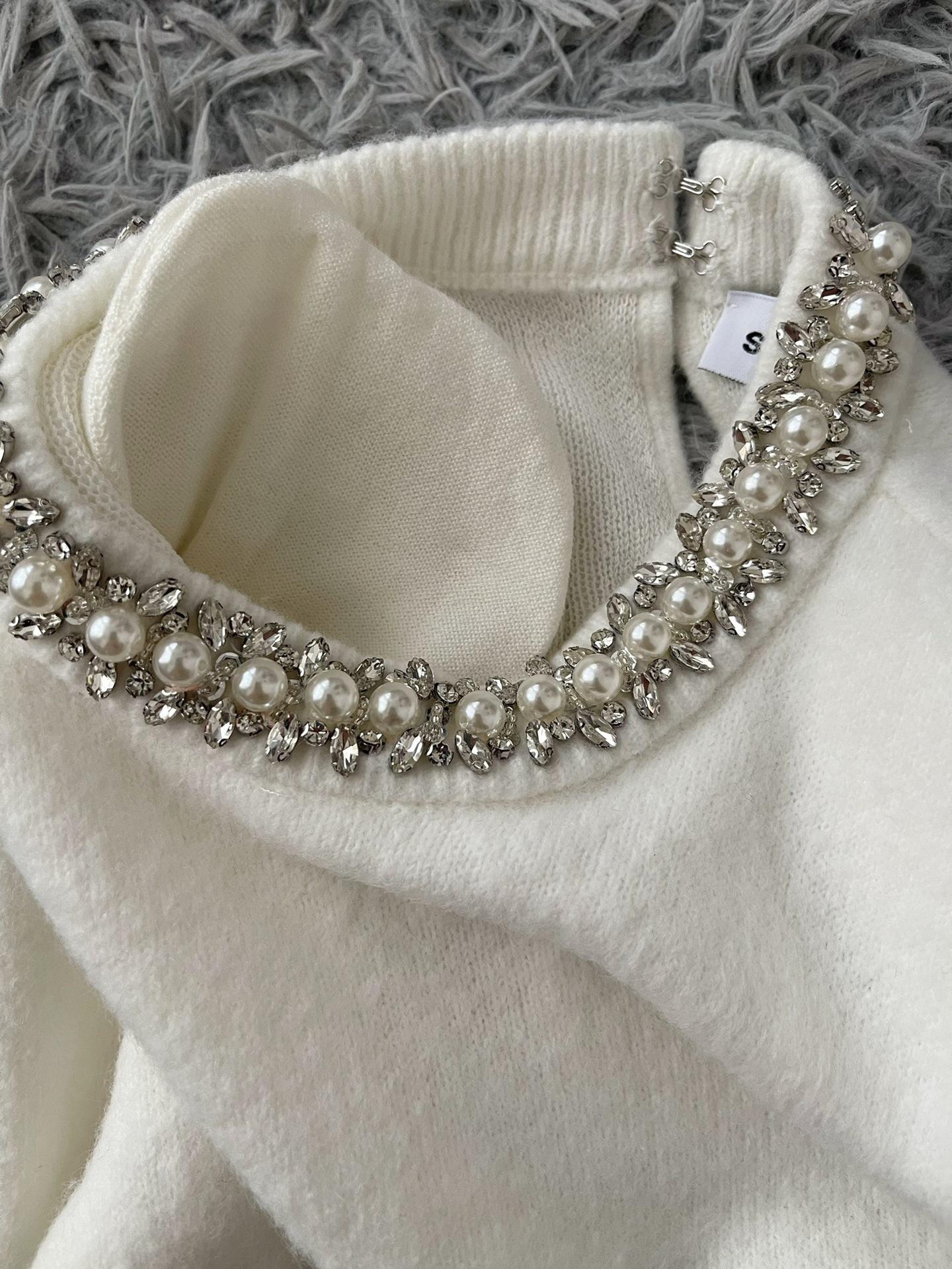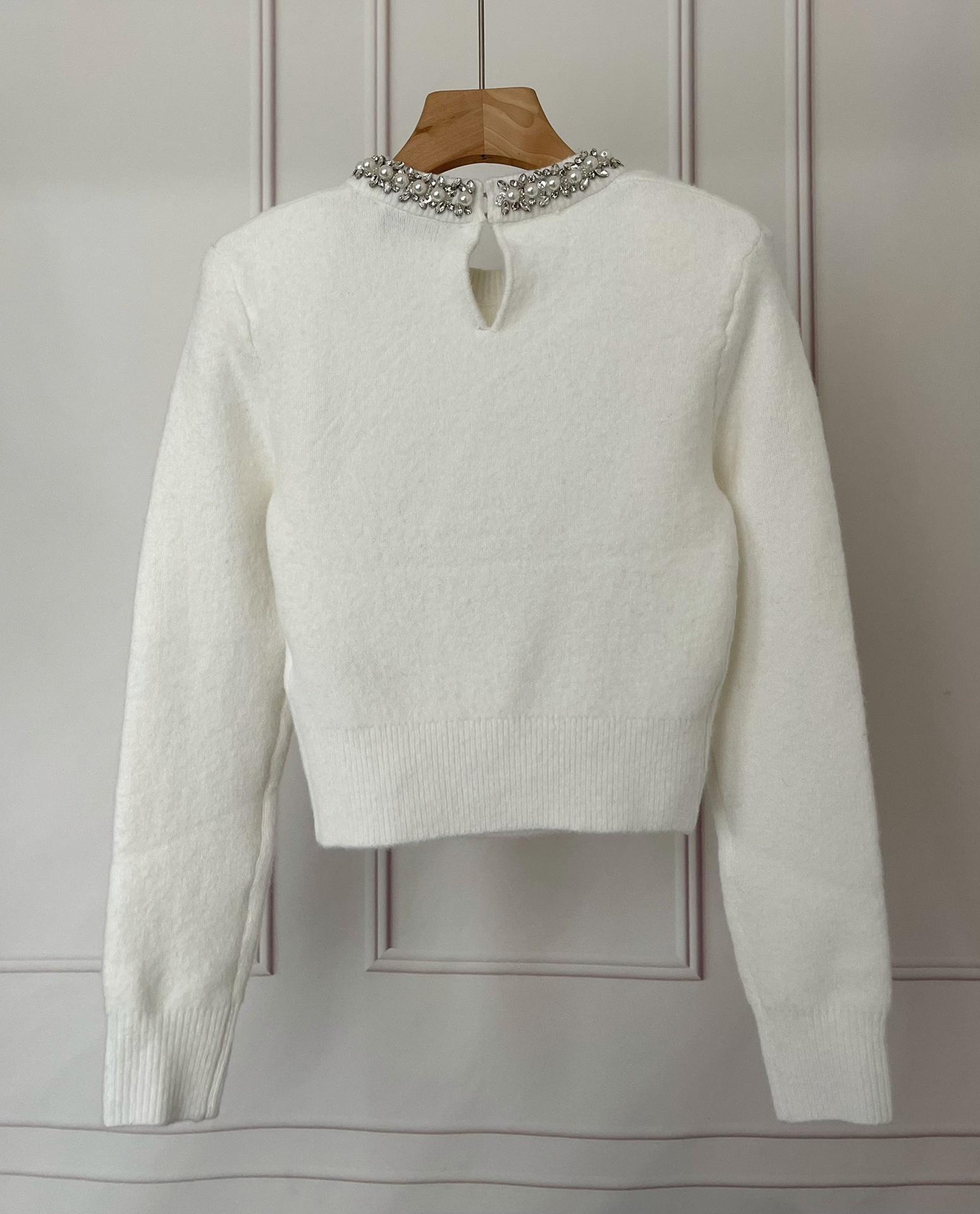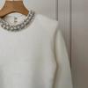 Suéter de Punto de Manga Larga con Cuello Redondo Blanco Dulce Versátil a la Moda con Decoración de Diamantes Estilo Francés 2025 Principios de Primavera Nuevo para Mujer