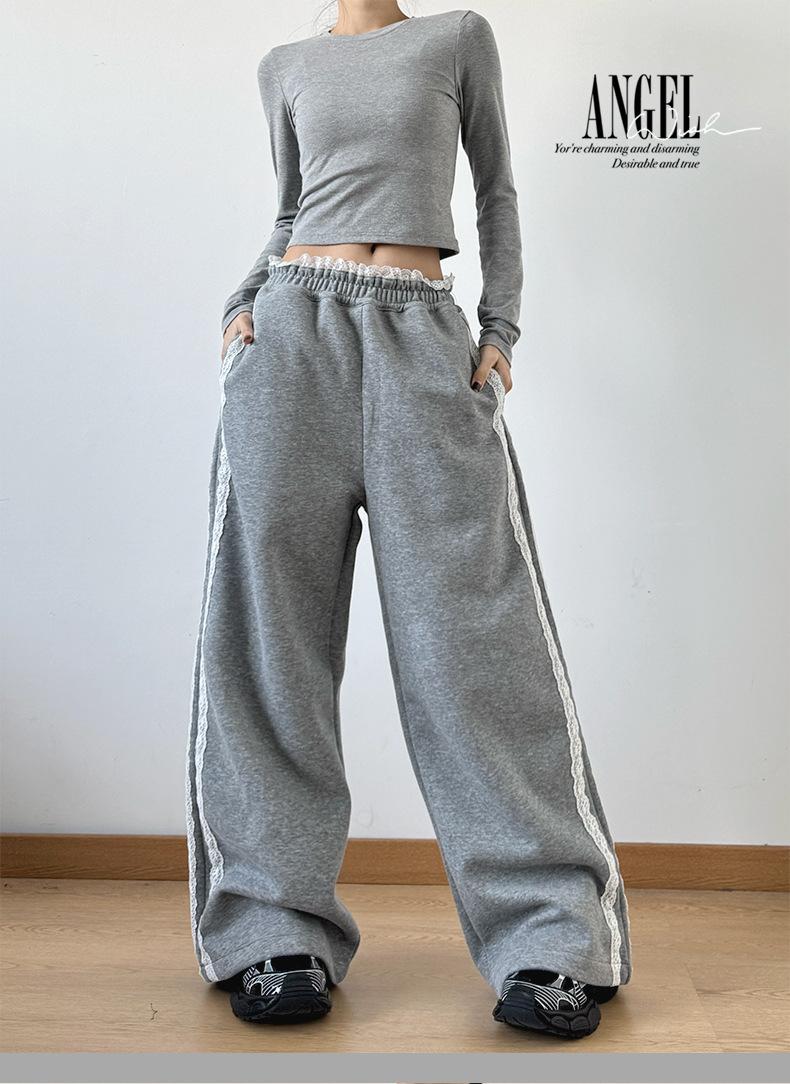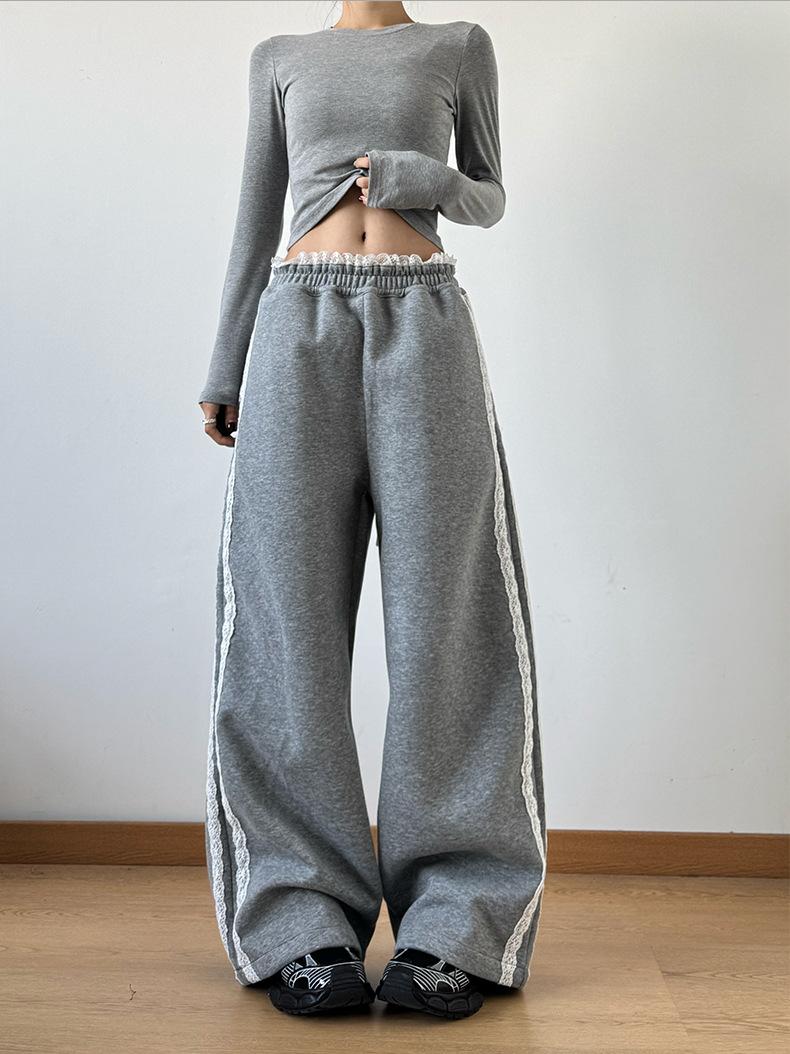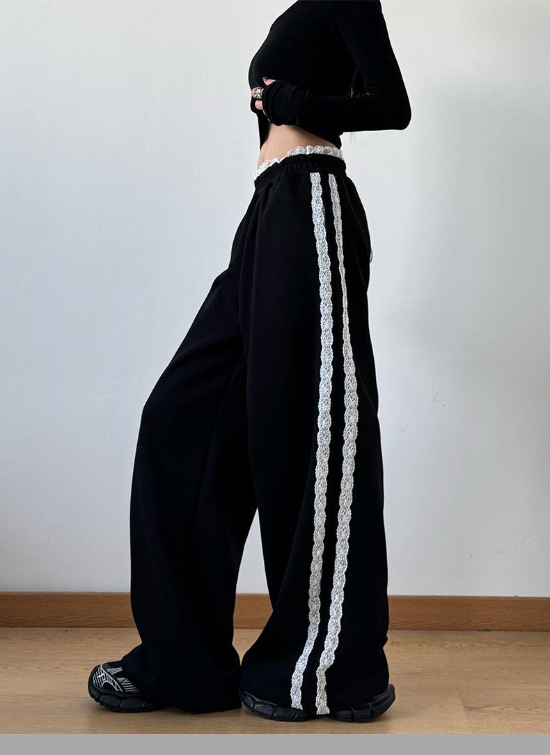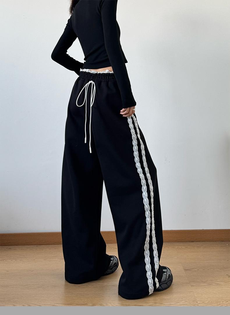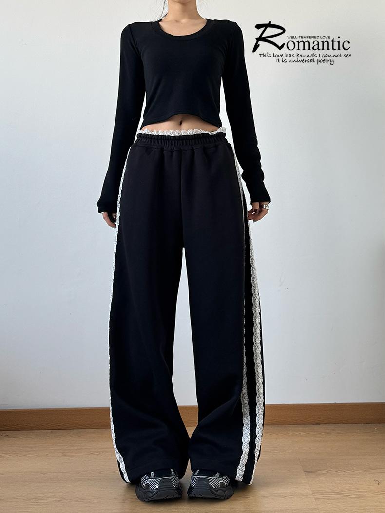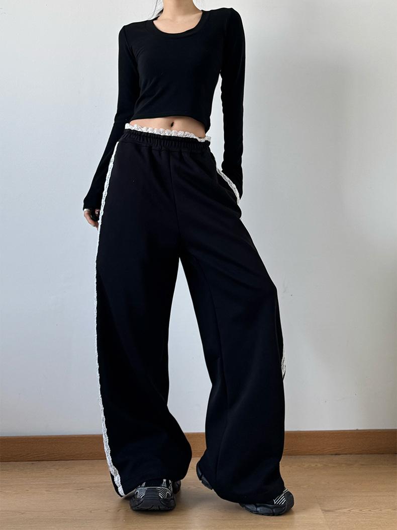 Pantalones casuales frescos y elegantes para mujer, novedad de otoño 2024, con cintura ajustada y costuras de encaje, pantalones altos y elegantes de pierna ancha.