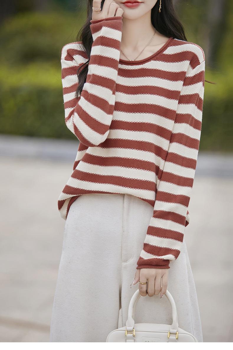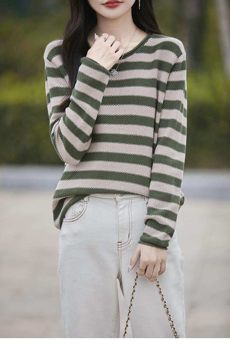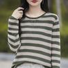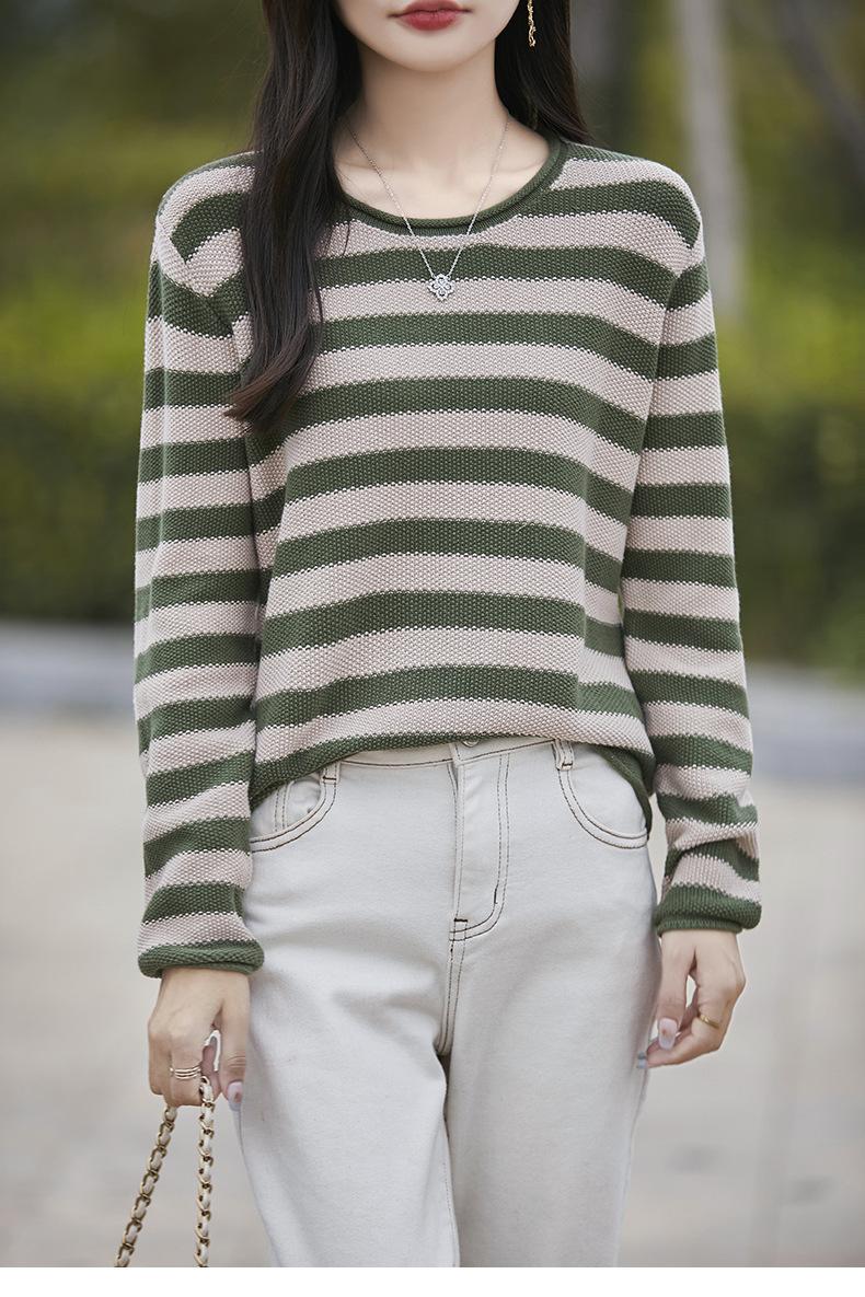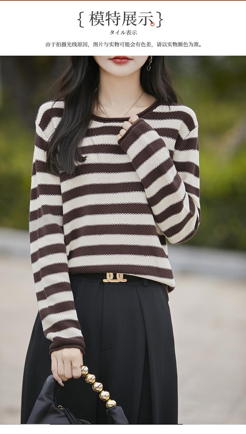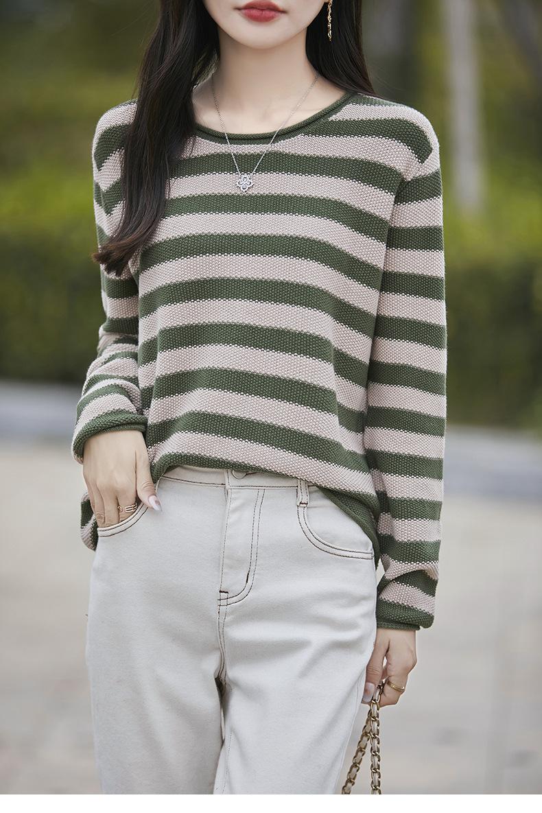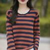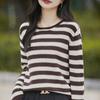 Suéter Grueso de Cuello Redondo a Rayas Suéter de Algodón Tejido Suéter para Mujer Otoño e Invierno Holgado Adelgazante Ropa Exterior Estilo Perezoso Camiseta Básica para Mujer