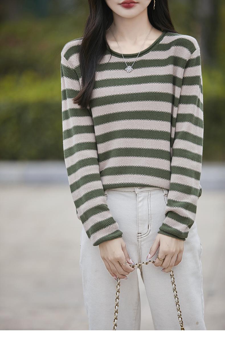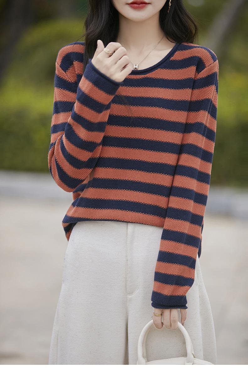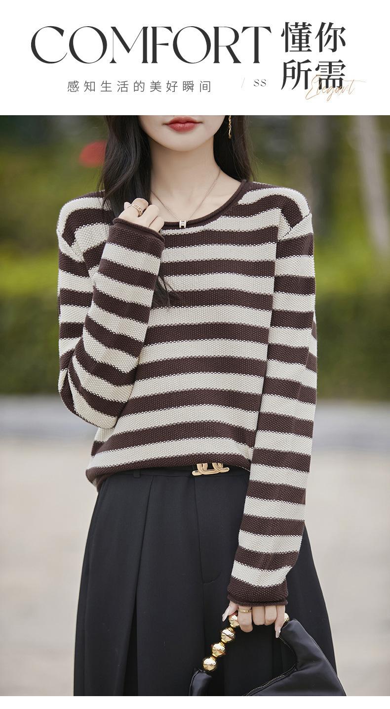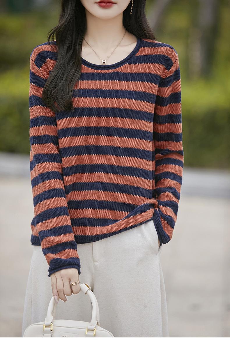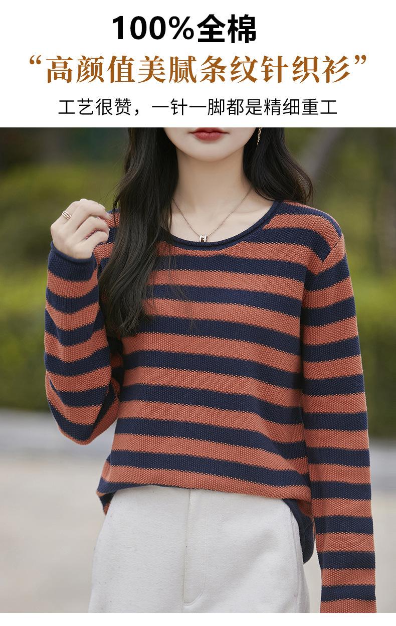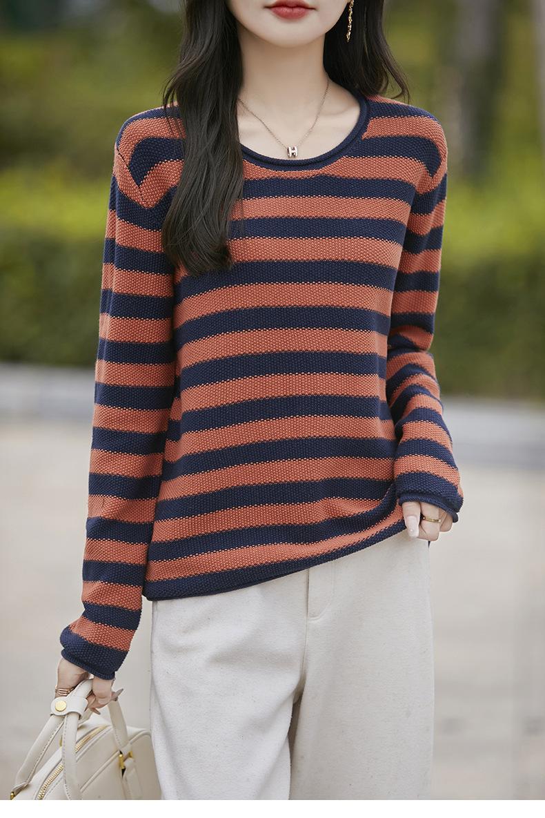 Suéter Grueso de Cuello Redondo a Rayas Suéter de Algodón Tejido Suéter para Mujer Otoño e Invierno Holgado Adelgazante Ropa Exterior Estilo Perezoso Camiseta Básica para Mujer