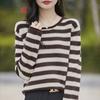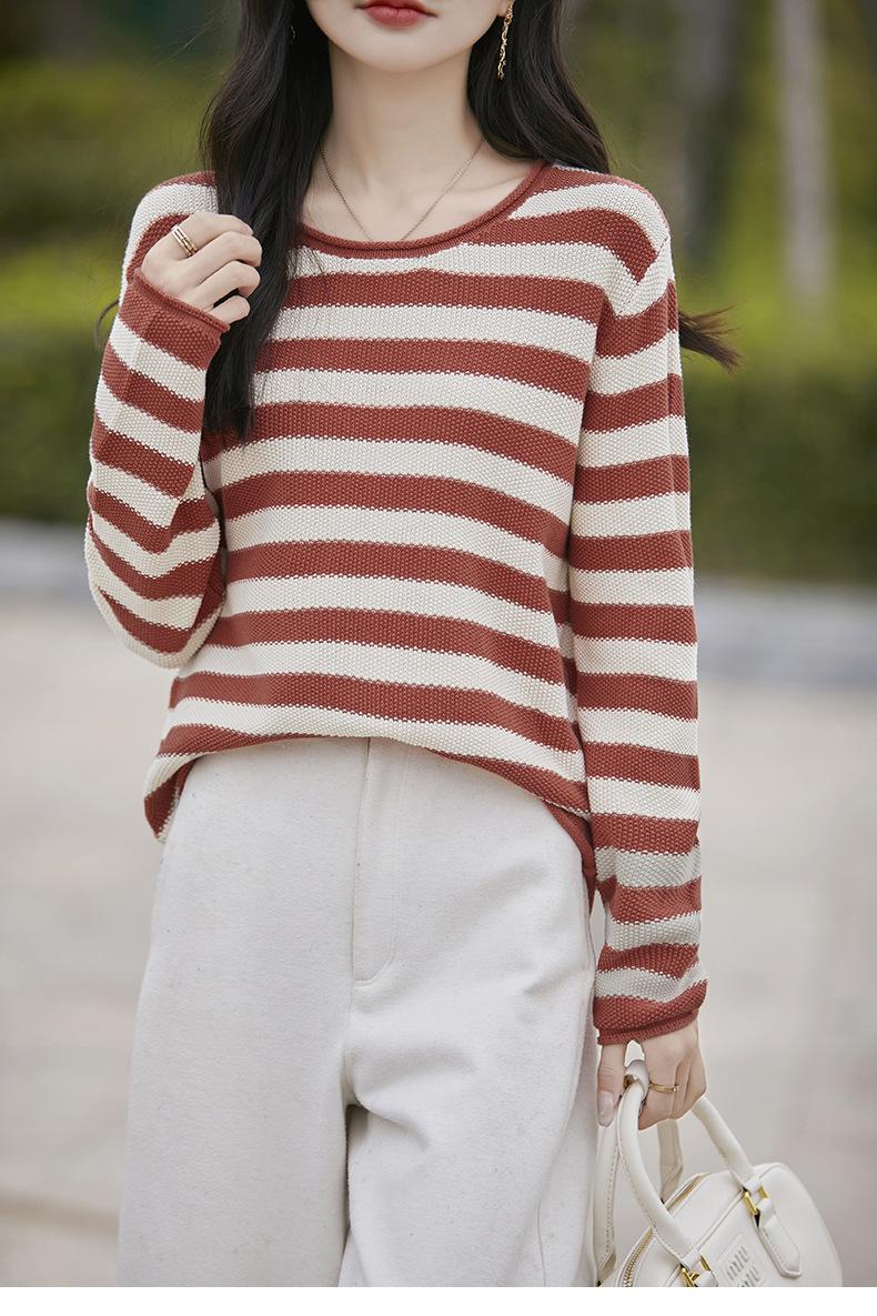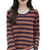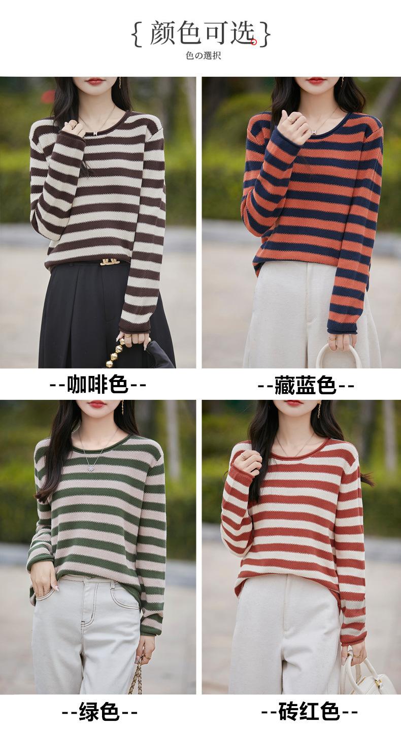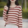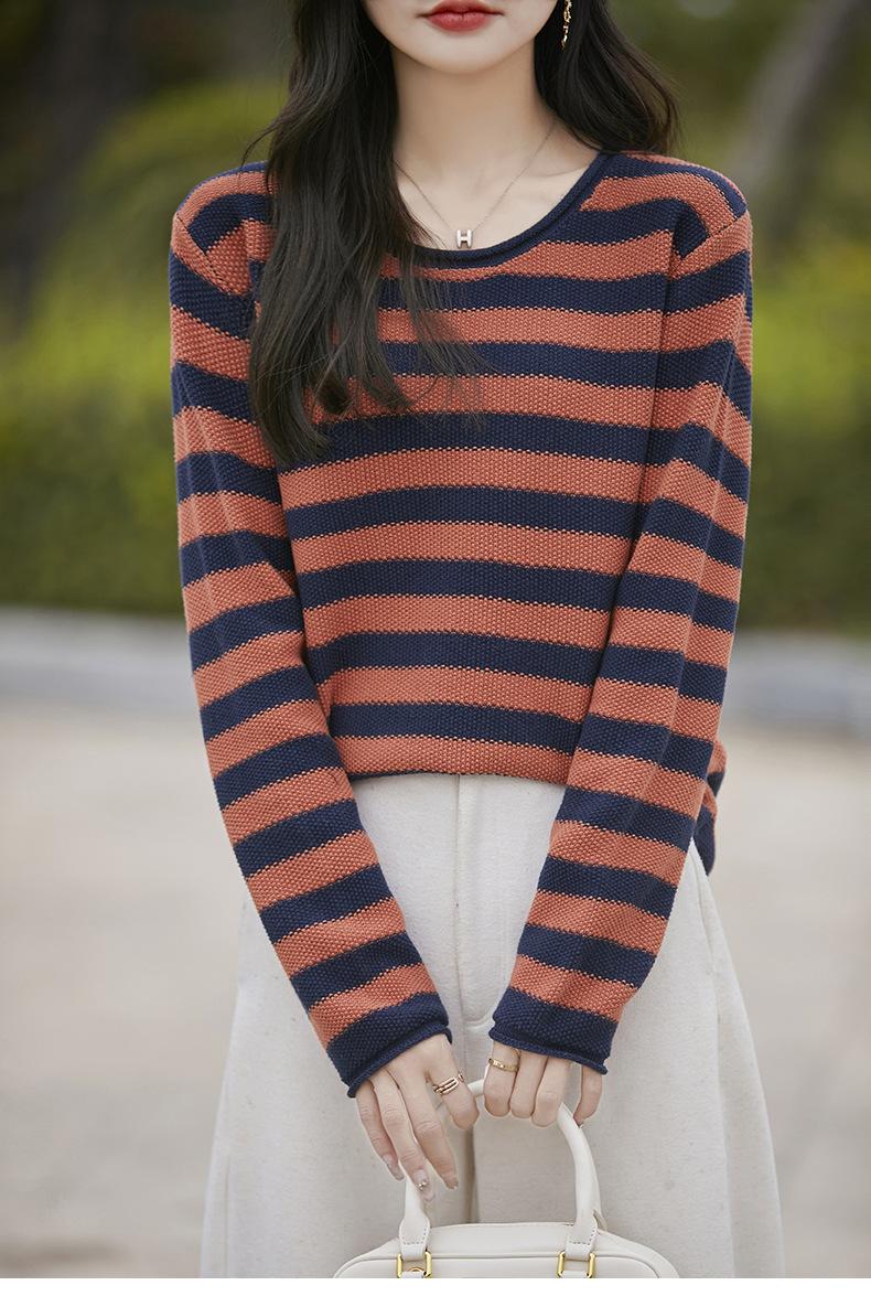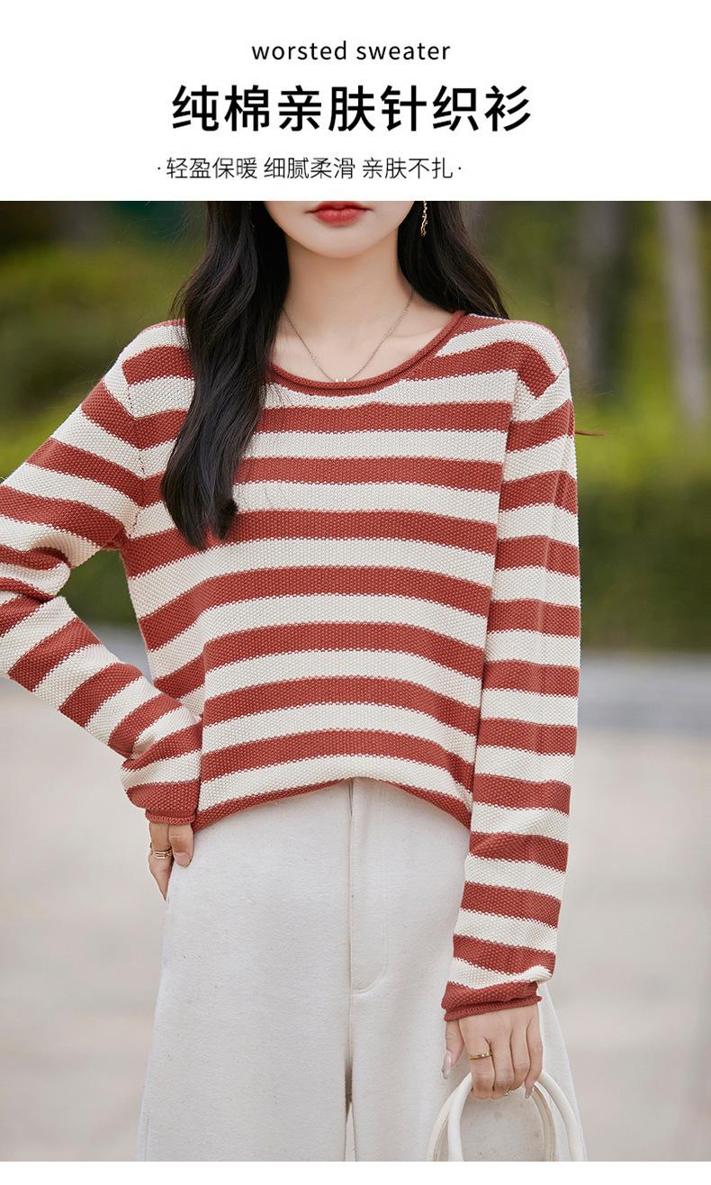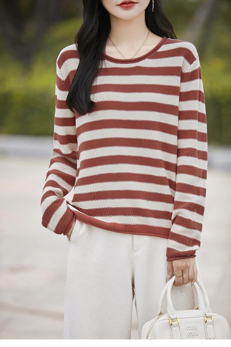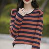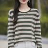 Suéter Grueso de Cuello Redondo a Rayas Suéter de Algodón Tejido Suéter para Mujer Otoño e Invierno Holgado Adelgazante Ropa Exterior Estilo Perezoso Camiseta Básica para Mujer
