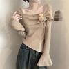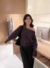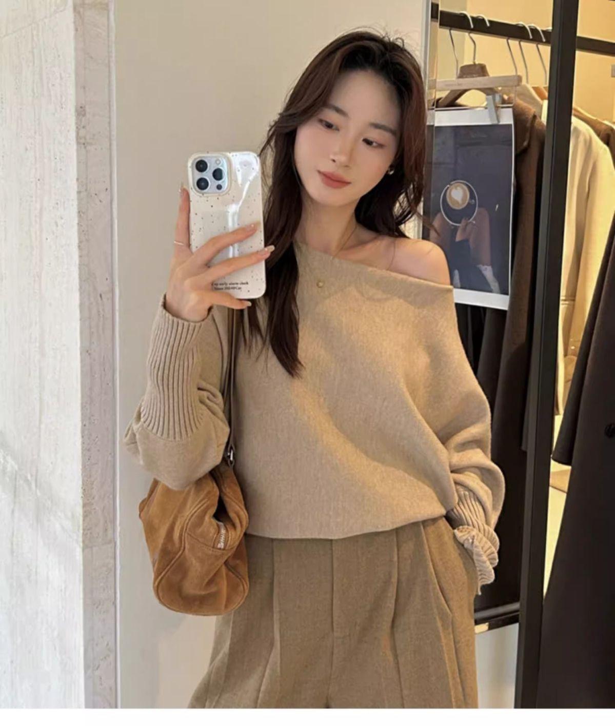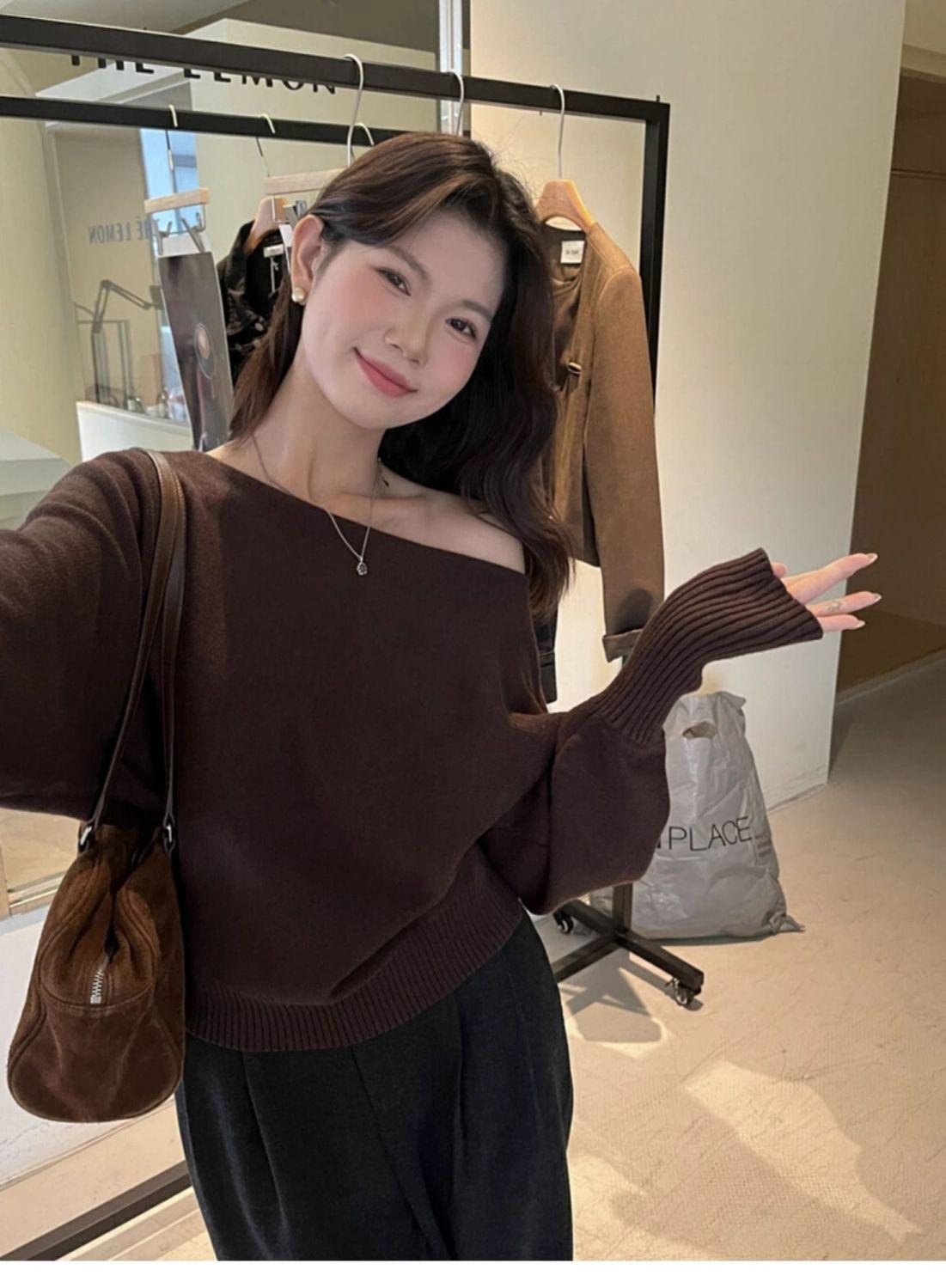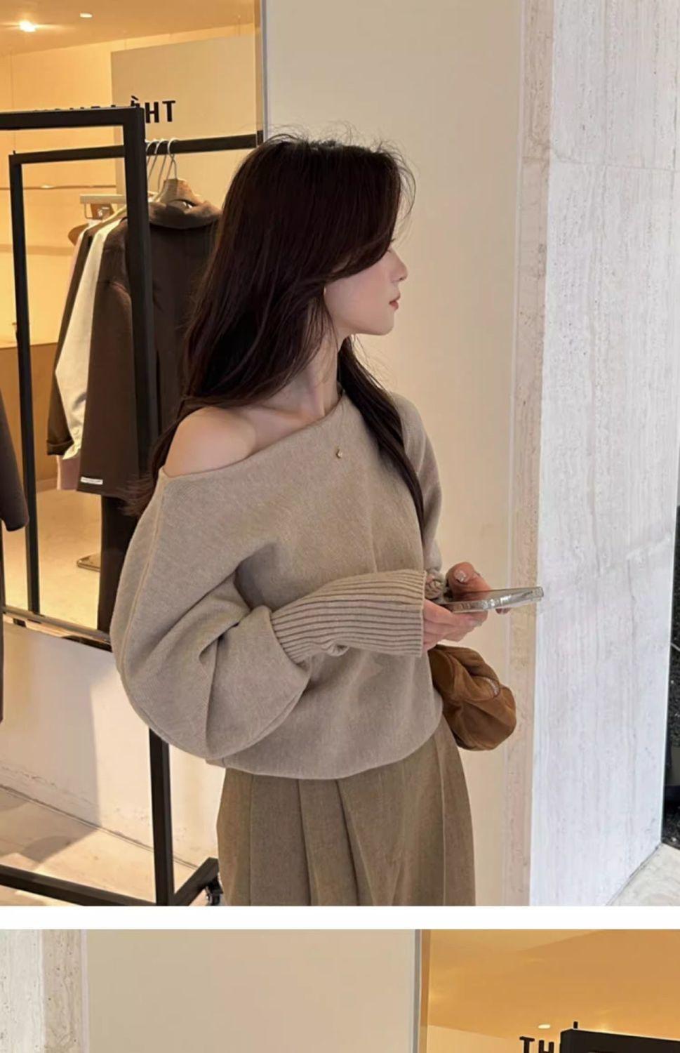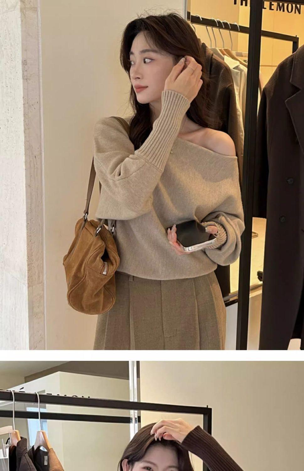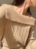 Suéter de punto con hombros descubiertos Chic Pure Desire de color caqui para mujer, suéter holgado de alta gama de otoño, parte superior interior
