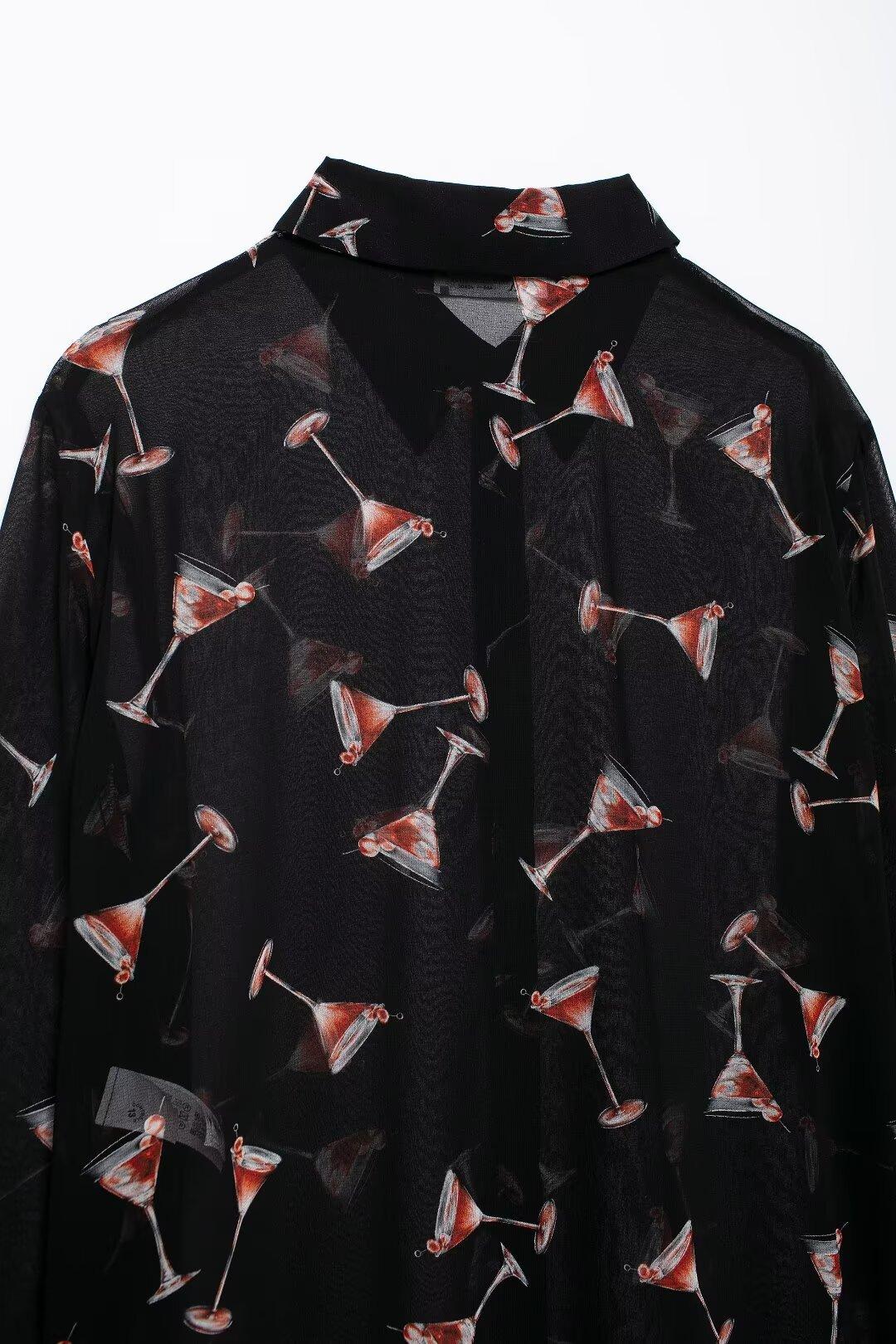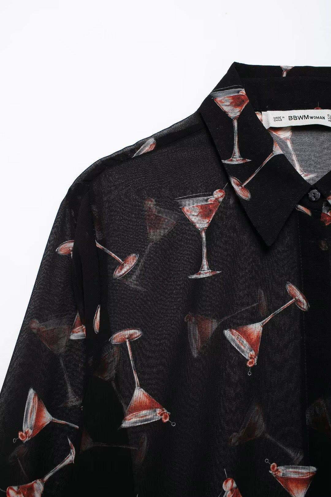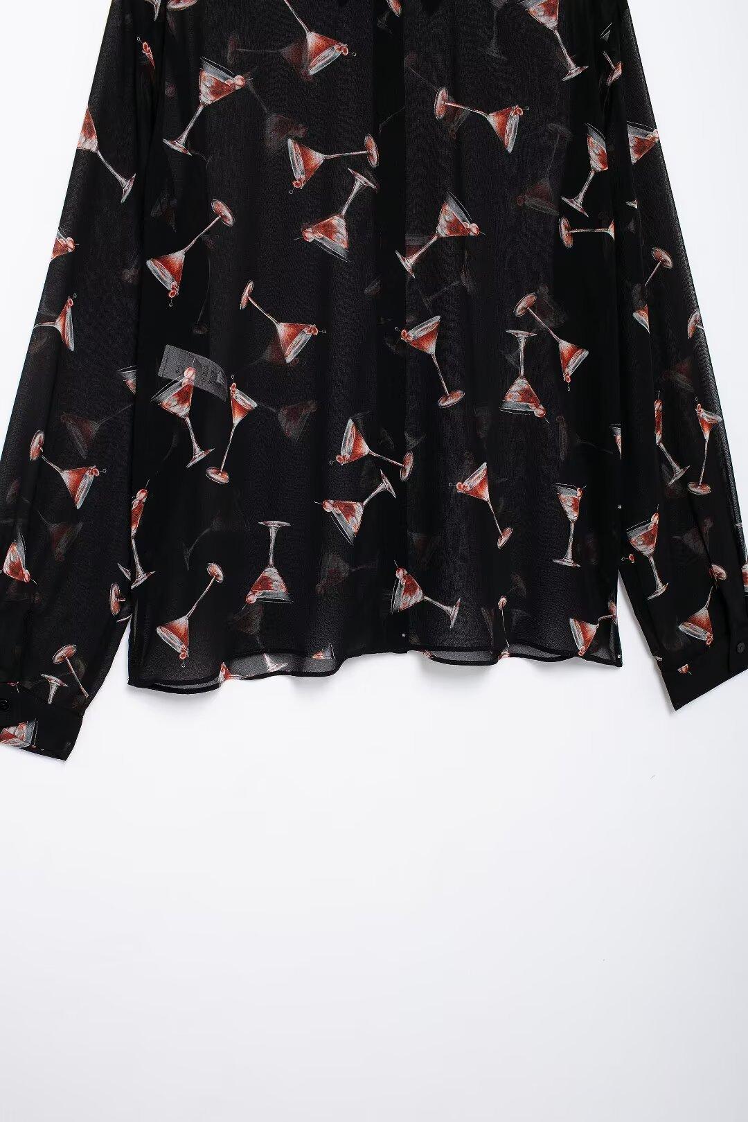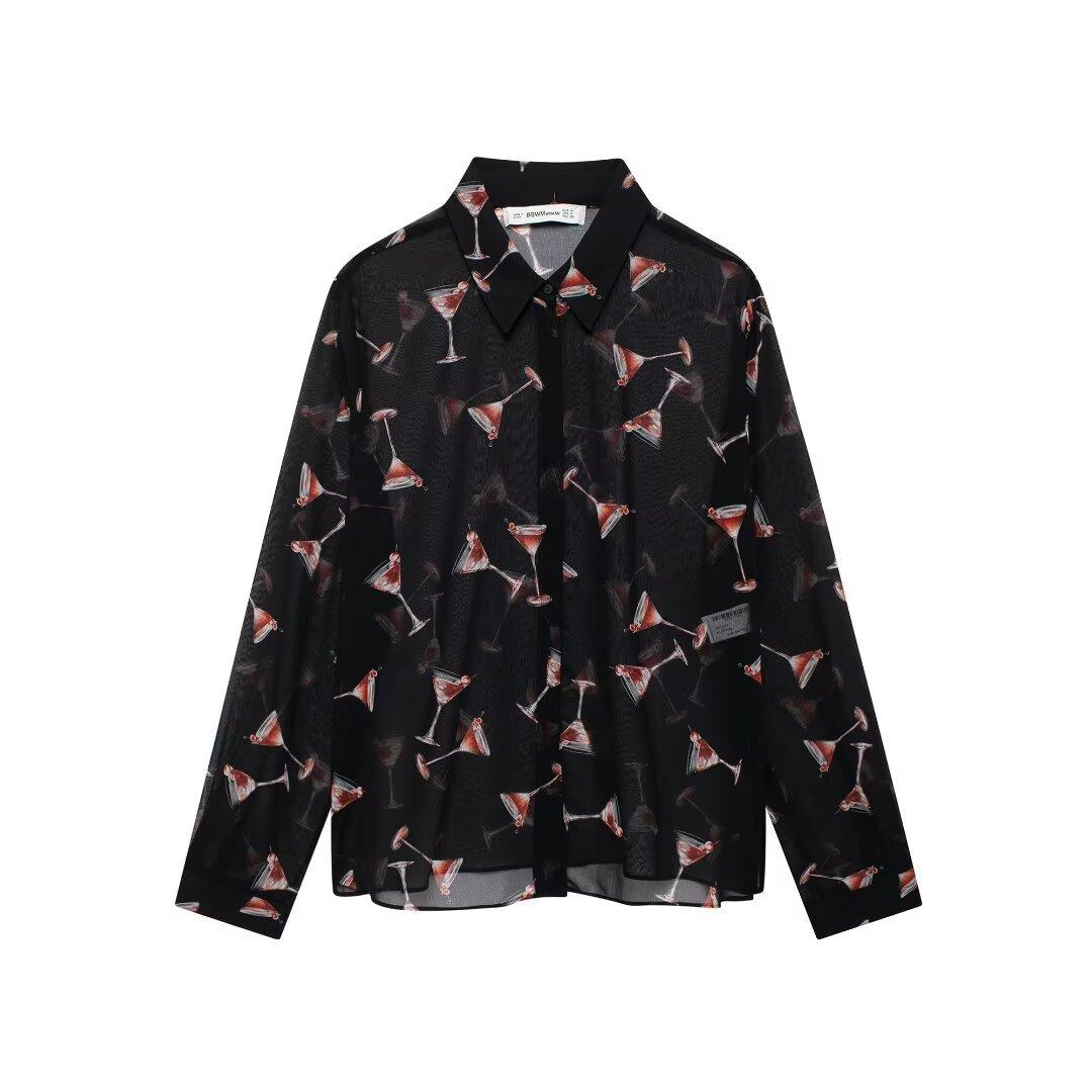 Camisa de manga larga translúcida con estampado de estilo europeo y americano para mujer, estilo casual, elegante y combinable, otoño de 2024
