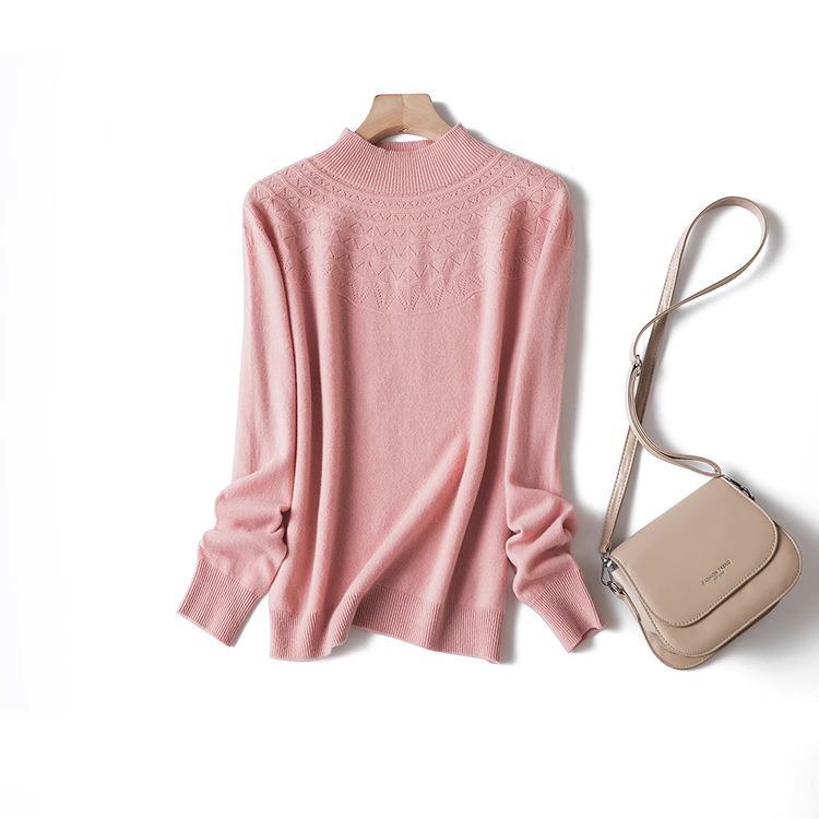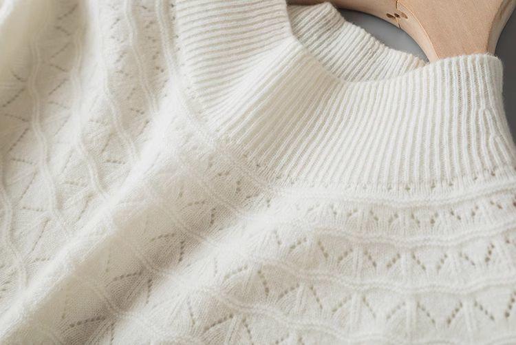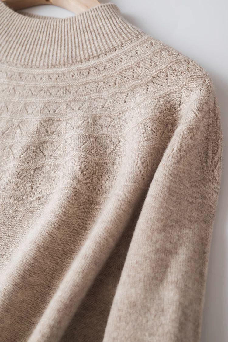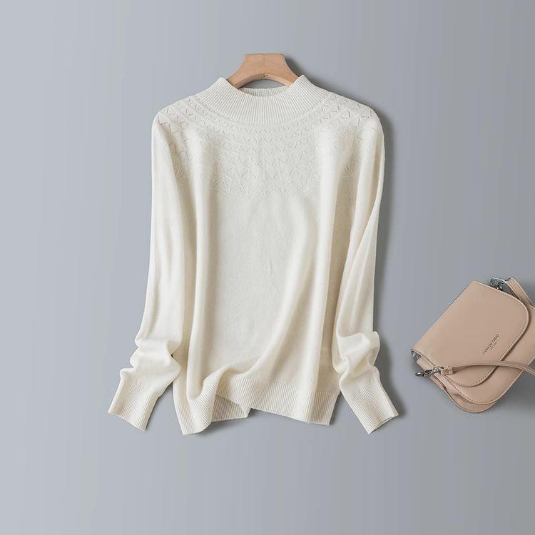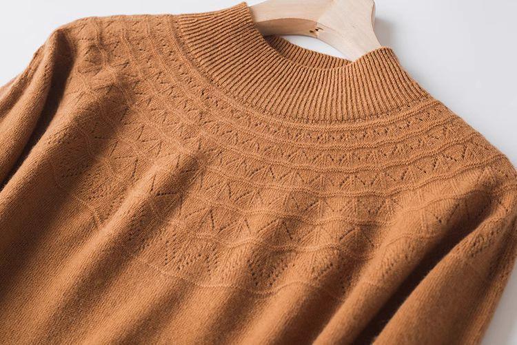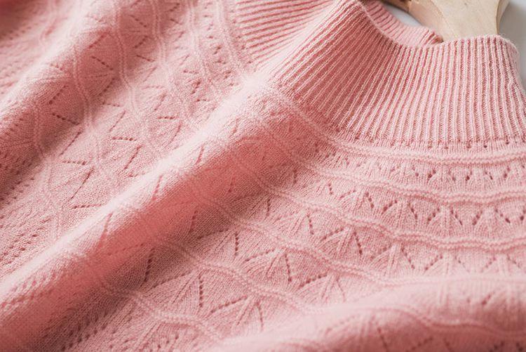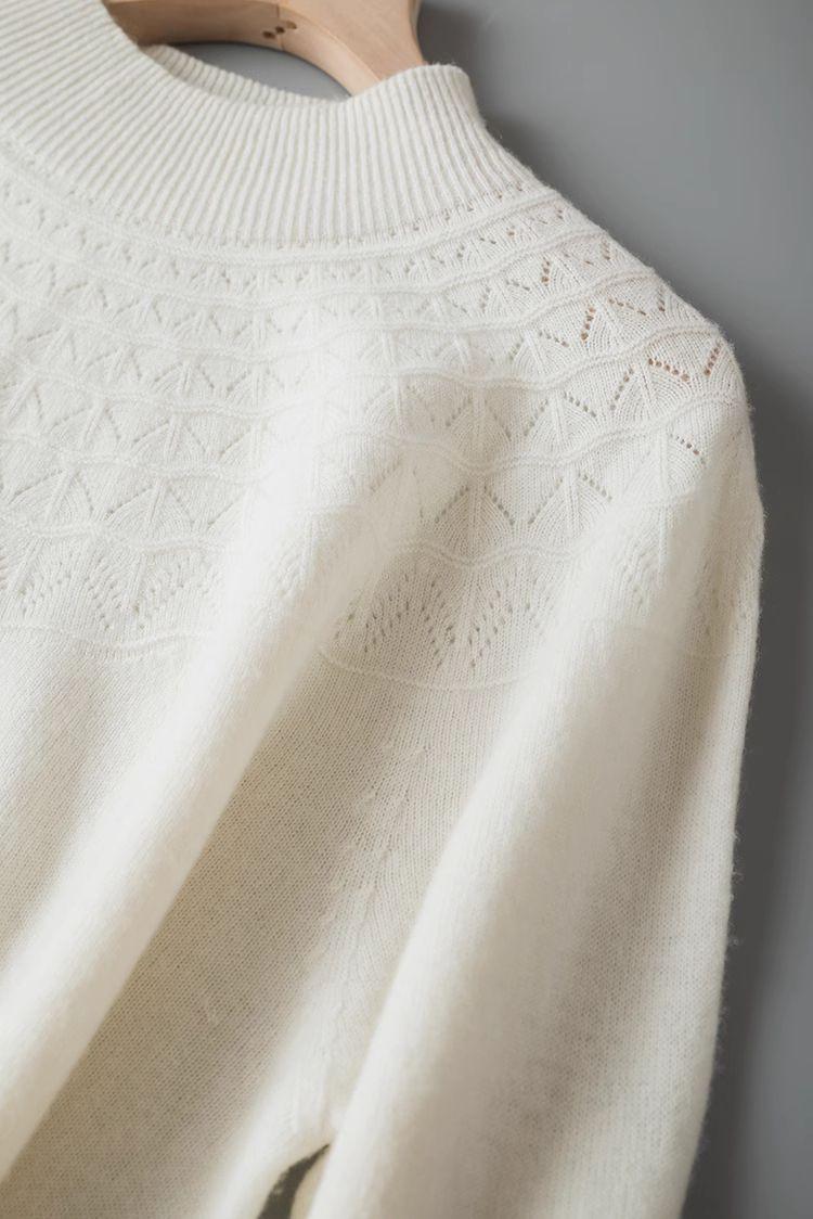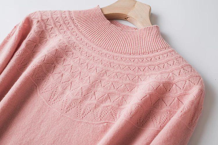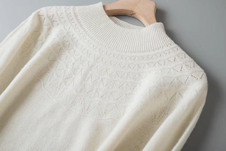 Suéter de una pieza sin costuras de cuello alto medio de lana de cachemira hueca pequeña de ganchillo dulce vintage para mujer otoño e invierno