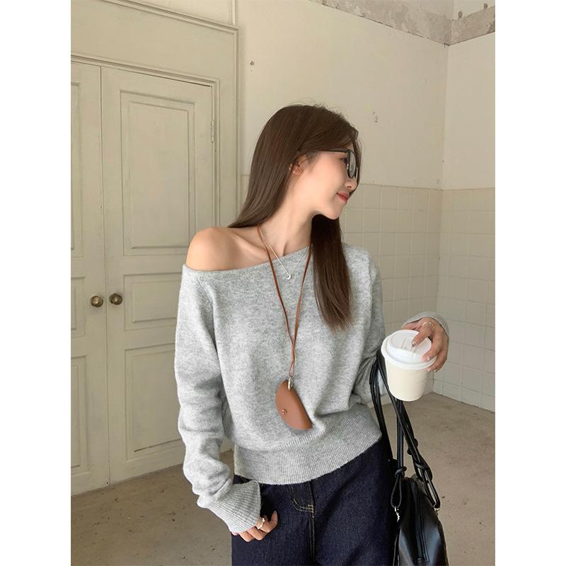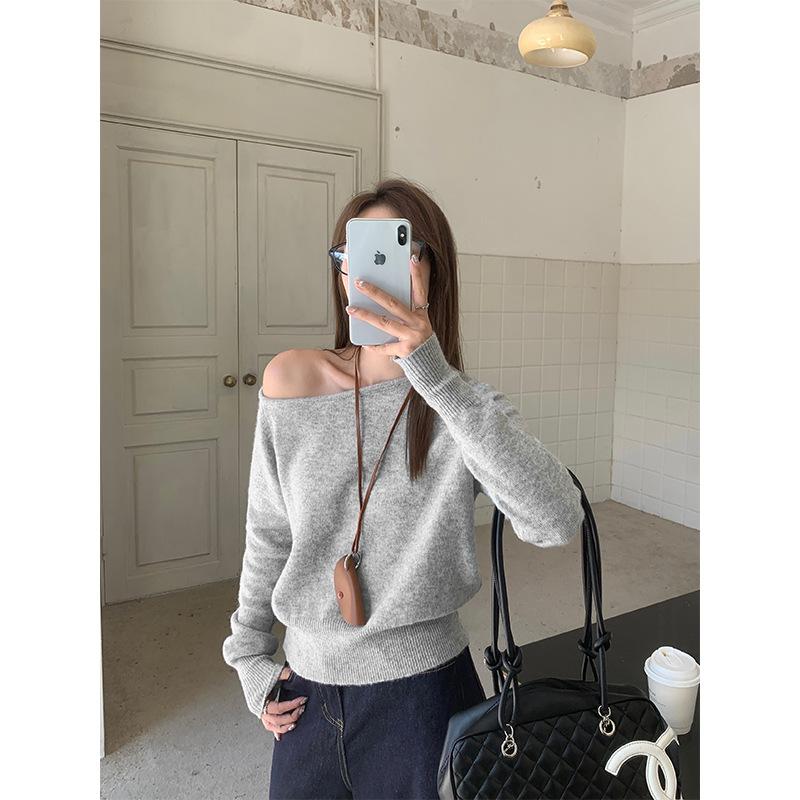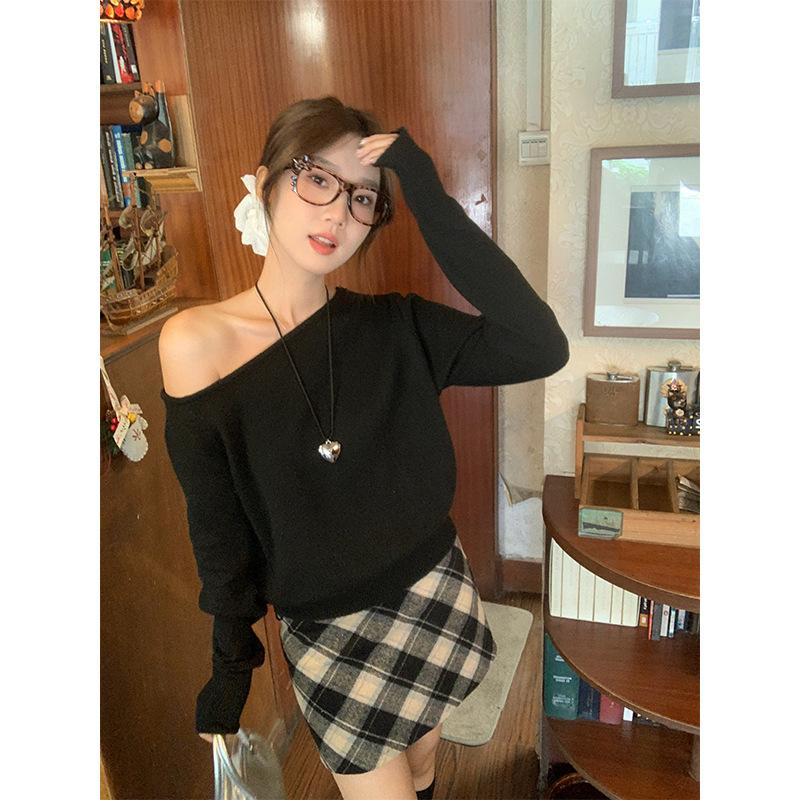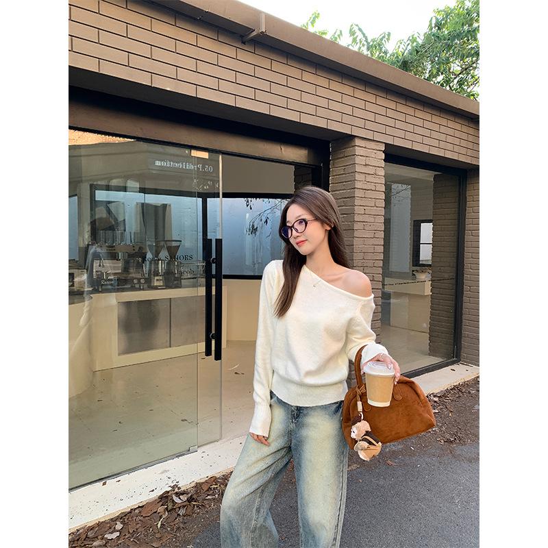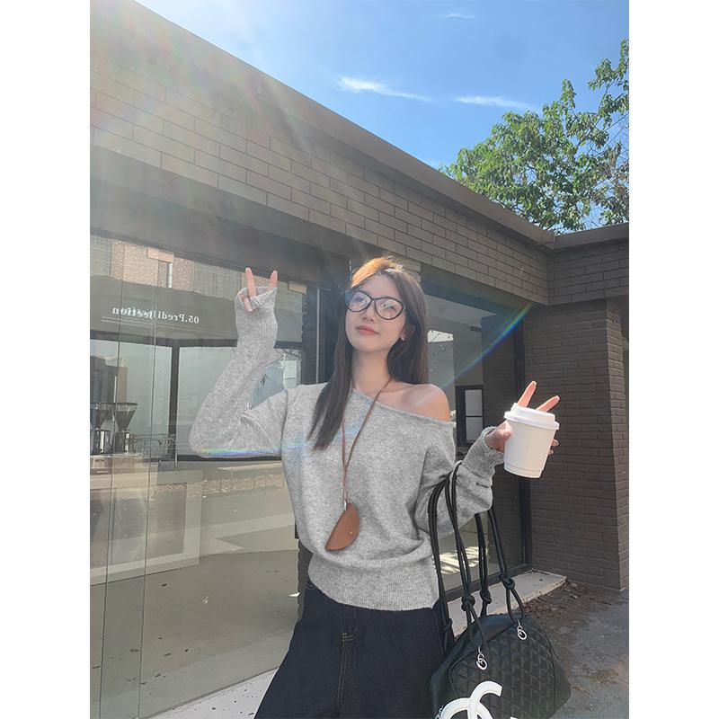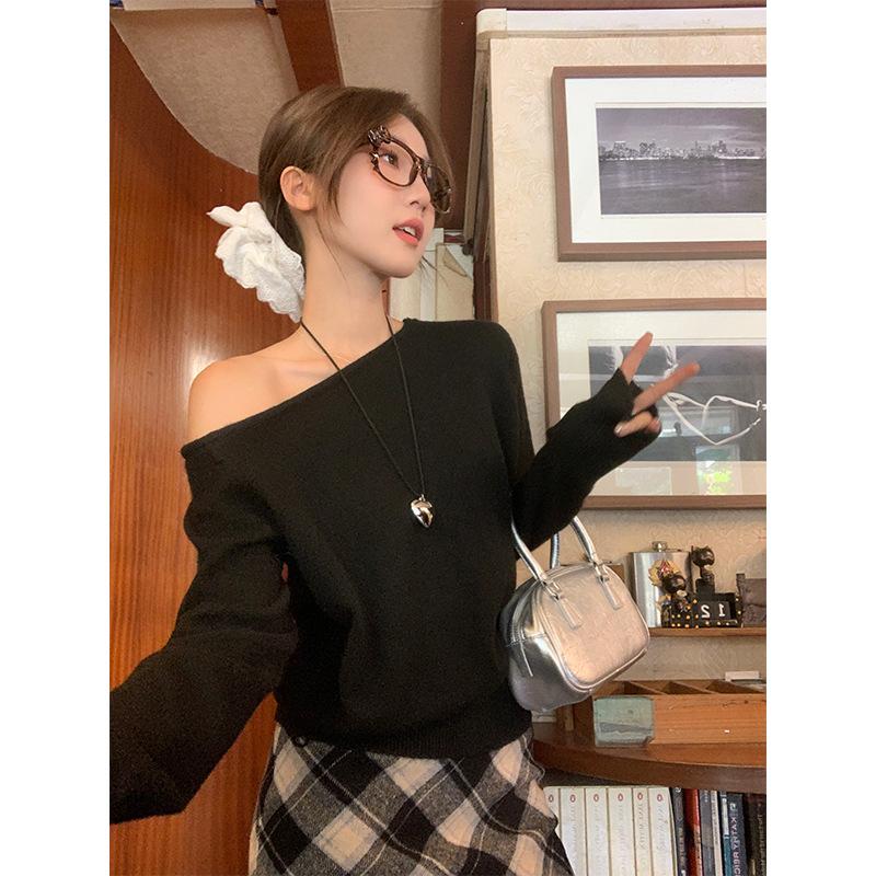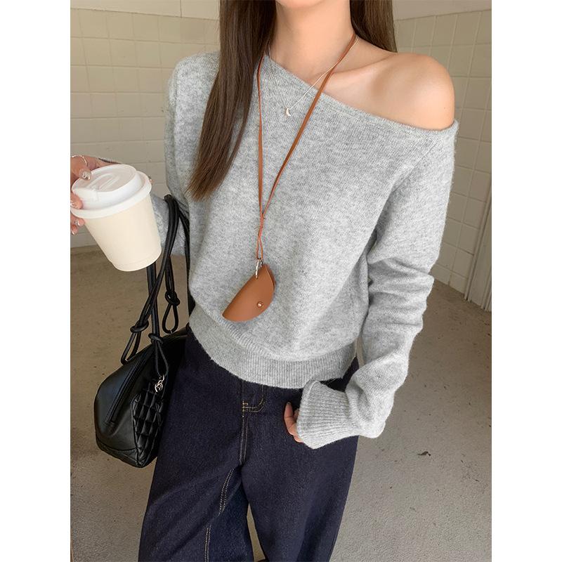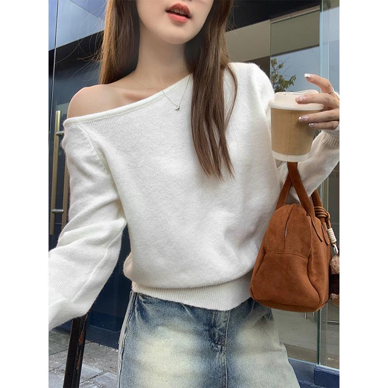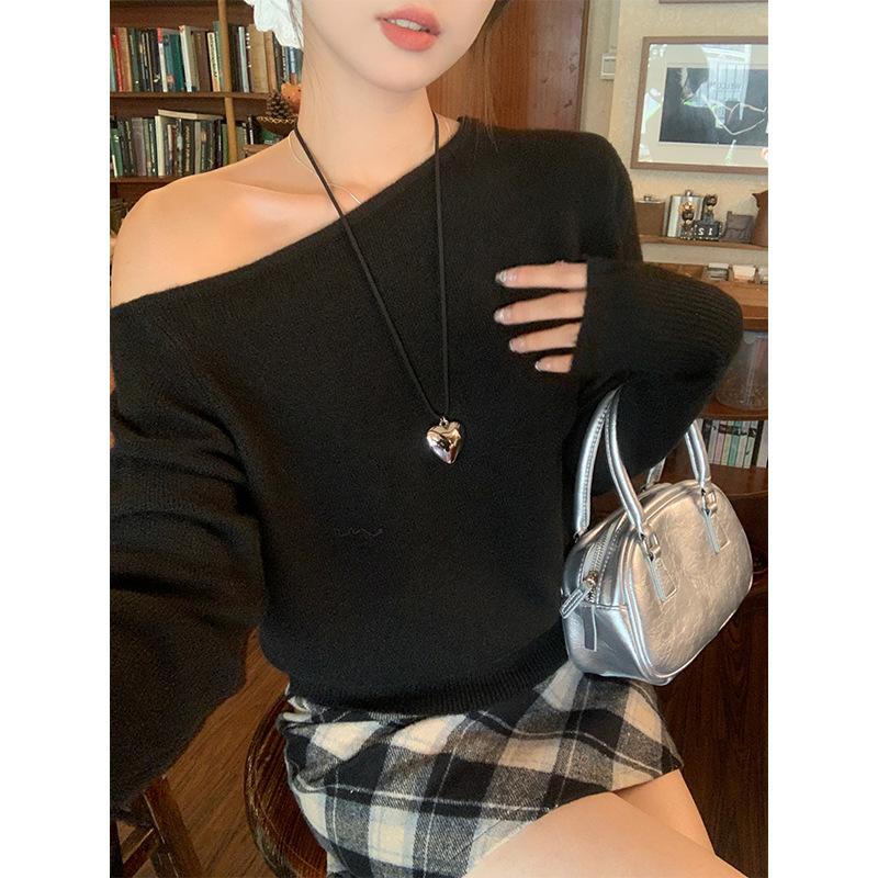 Suéter de manga larga con hombro irregular para mujer 2025 Nuevo Otoño e Invierno Ajustado Hombro Chic Tejido Versátil Top