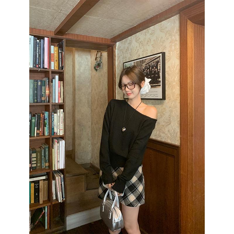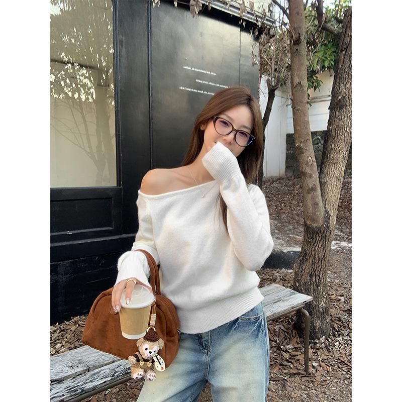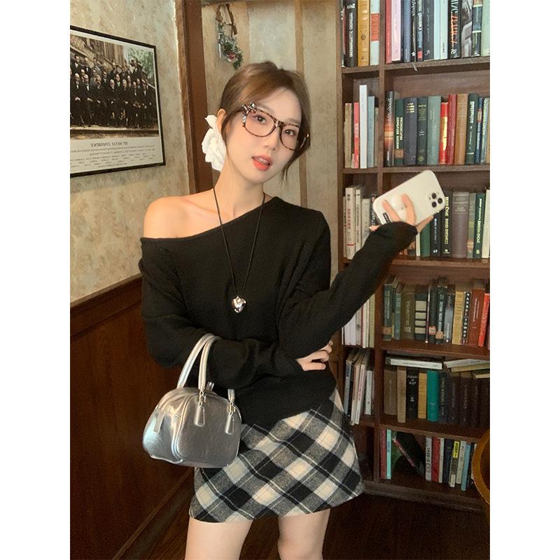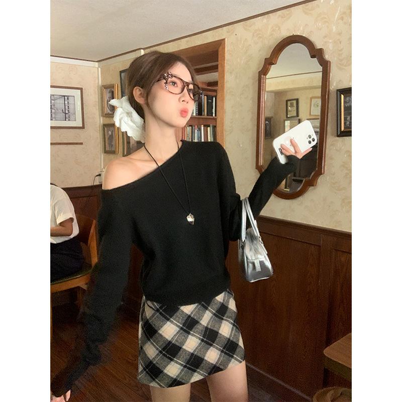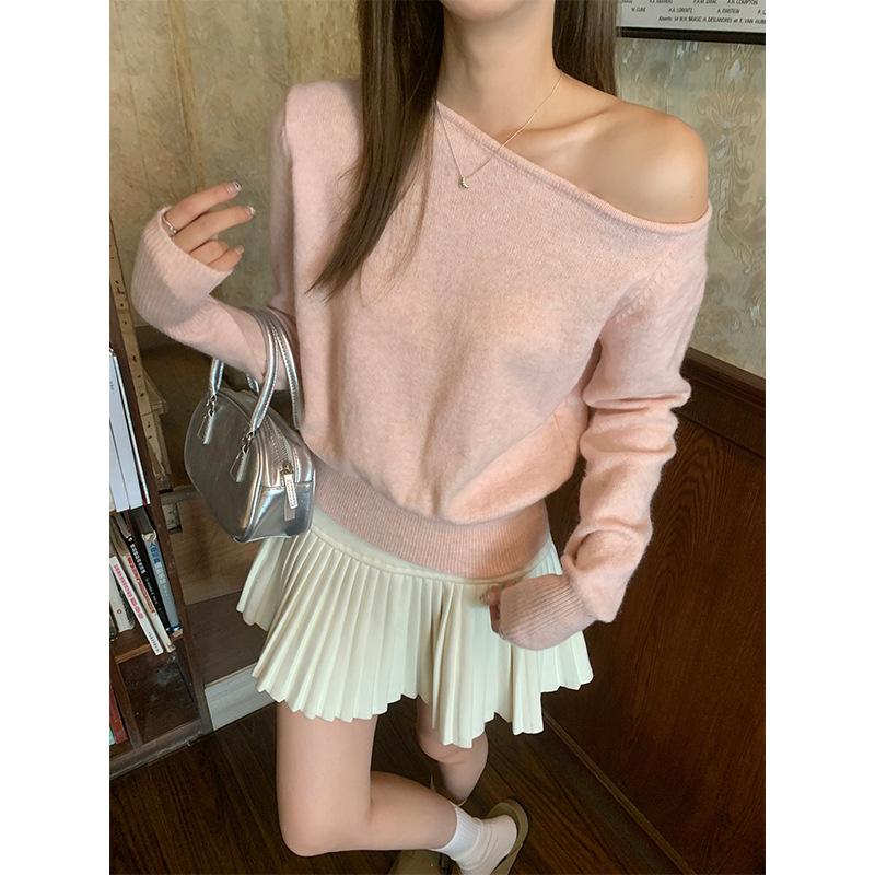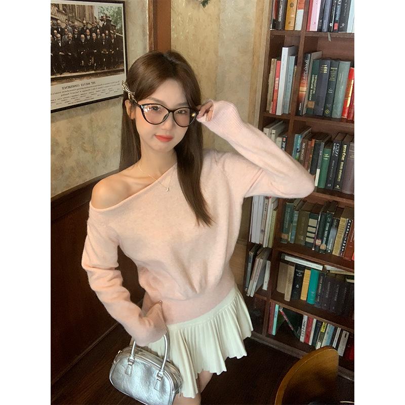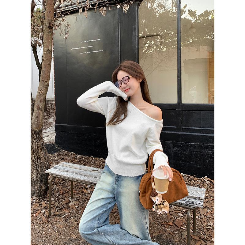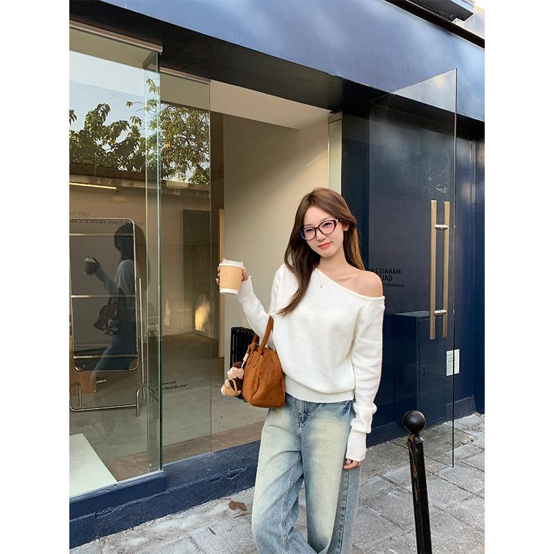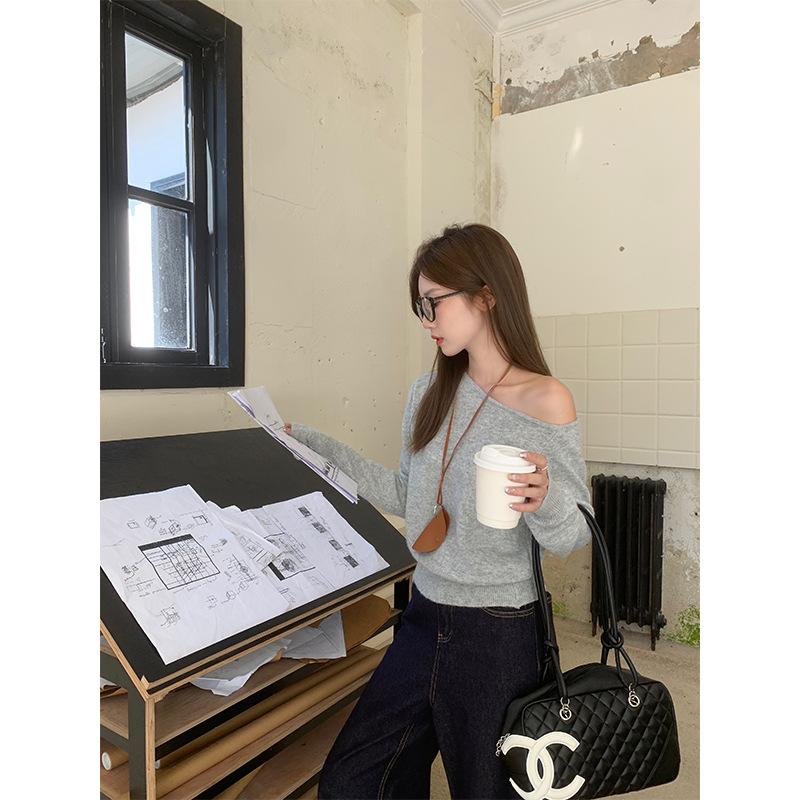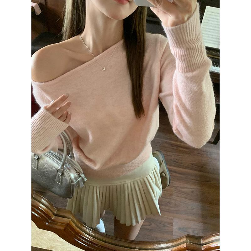 Suéter de manga larga con hombro irregular para mujer 2025 Nuevo Otoño e Invierno Ajustado Hombro Chic Tejido Versátil Top