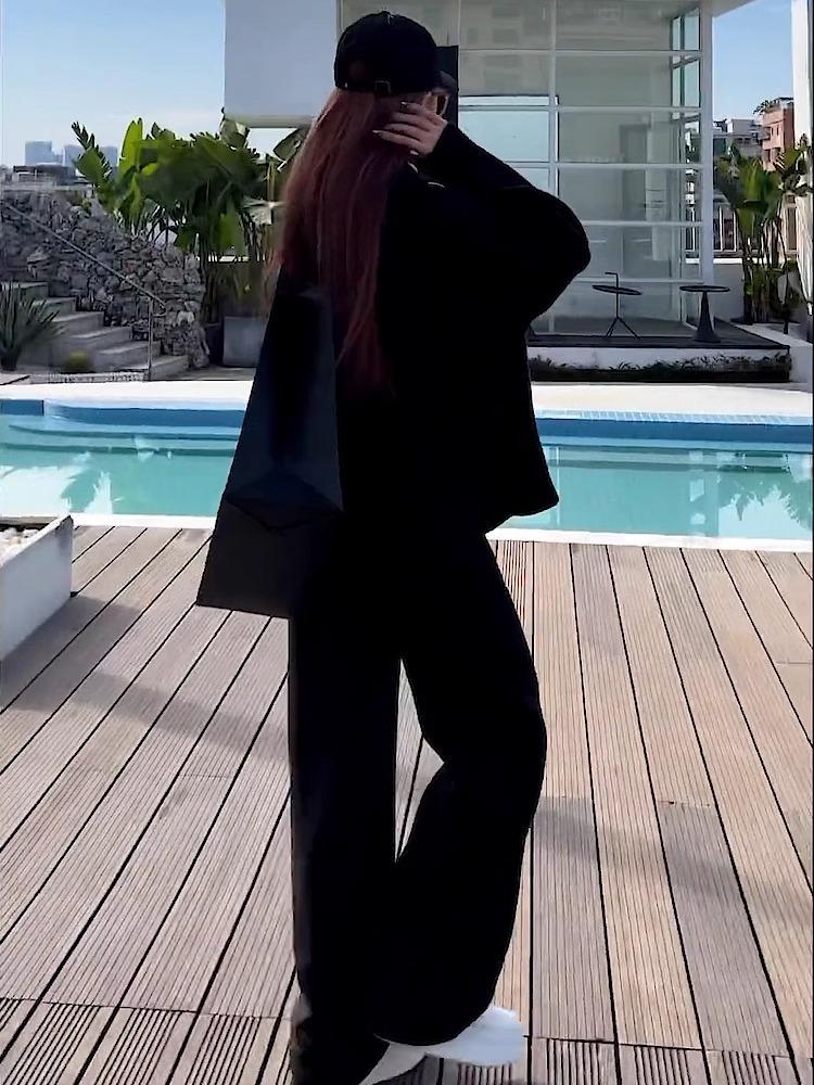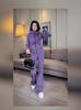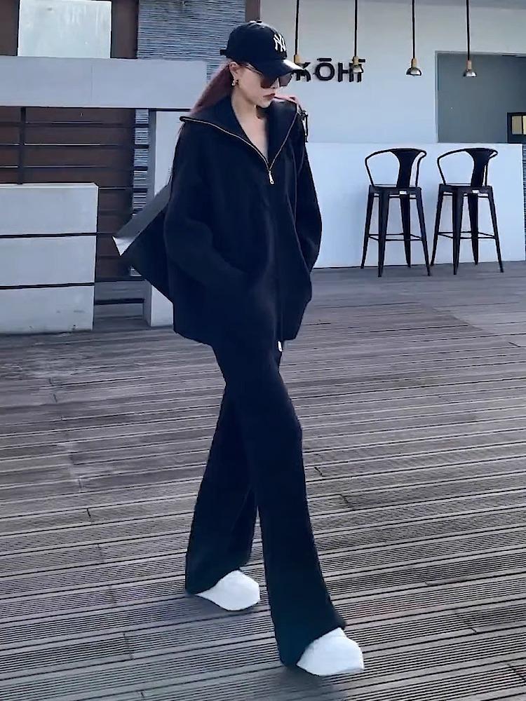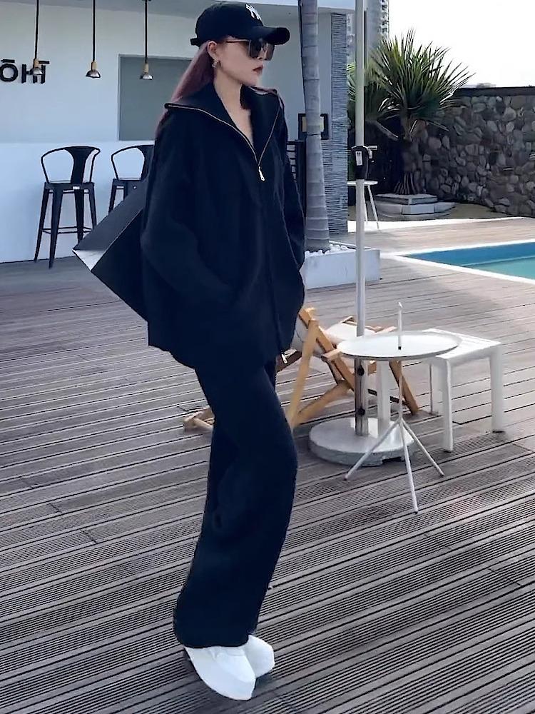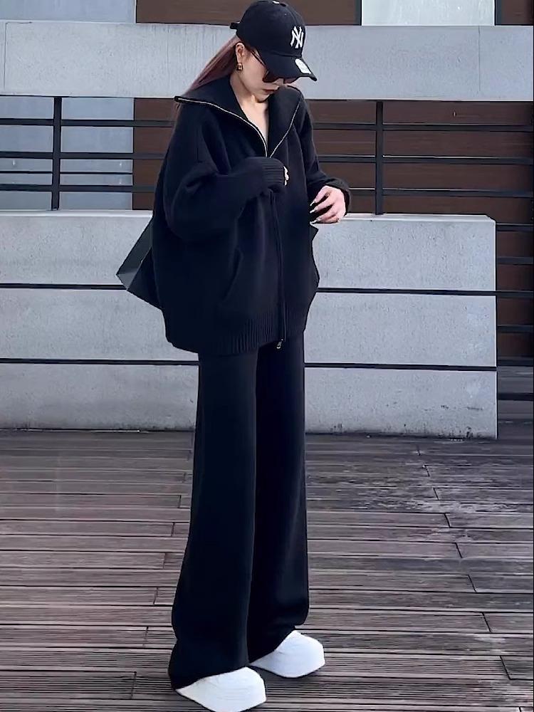 Traje deportivo casual de alta gama, moda de invierno, nuevo, cremallera, negro, holgado, grueso, top de dos piezas, ropa de mujer