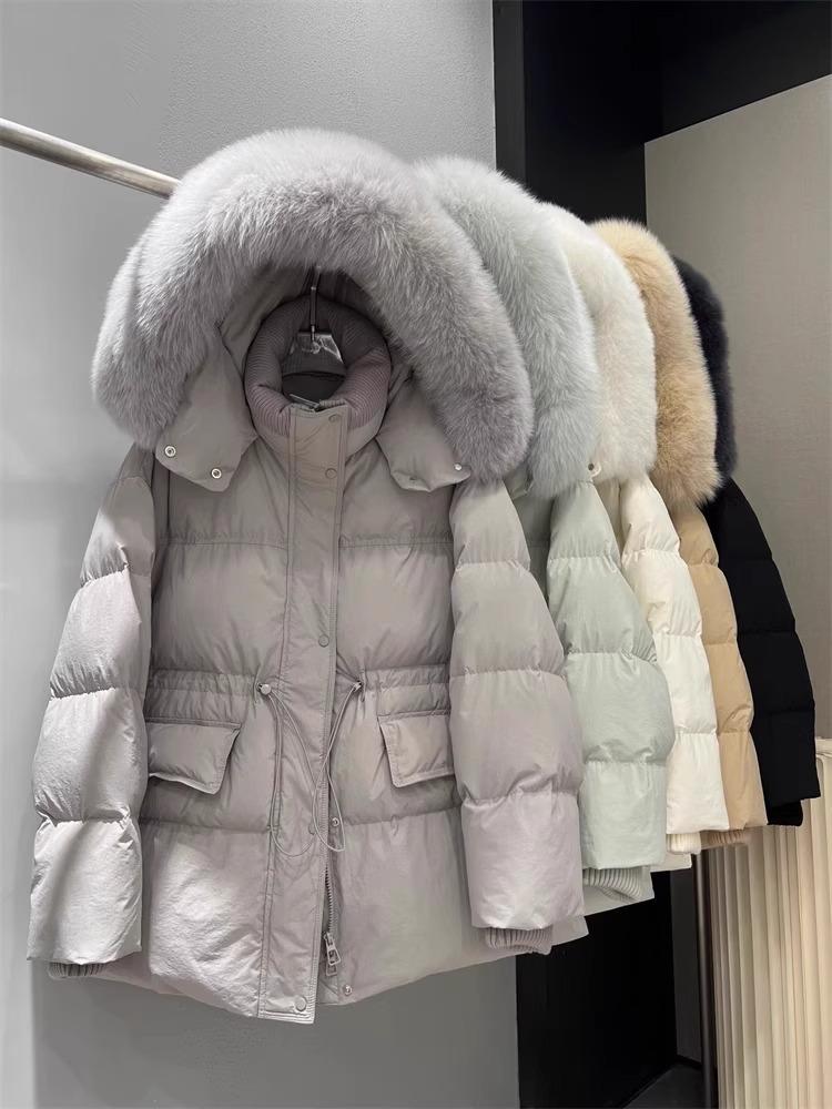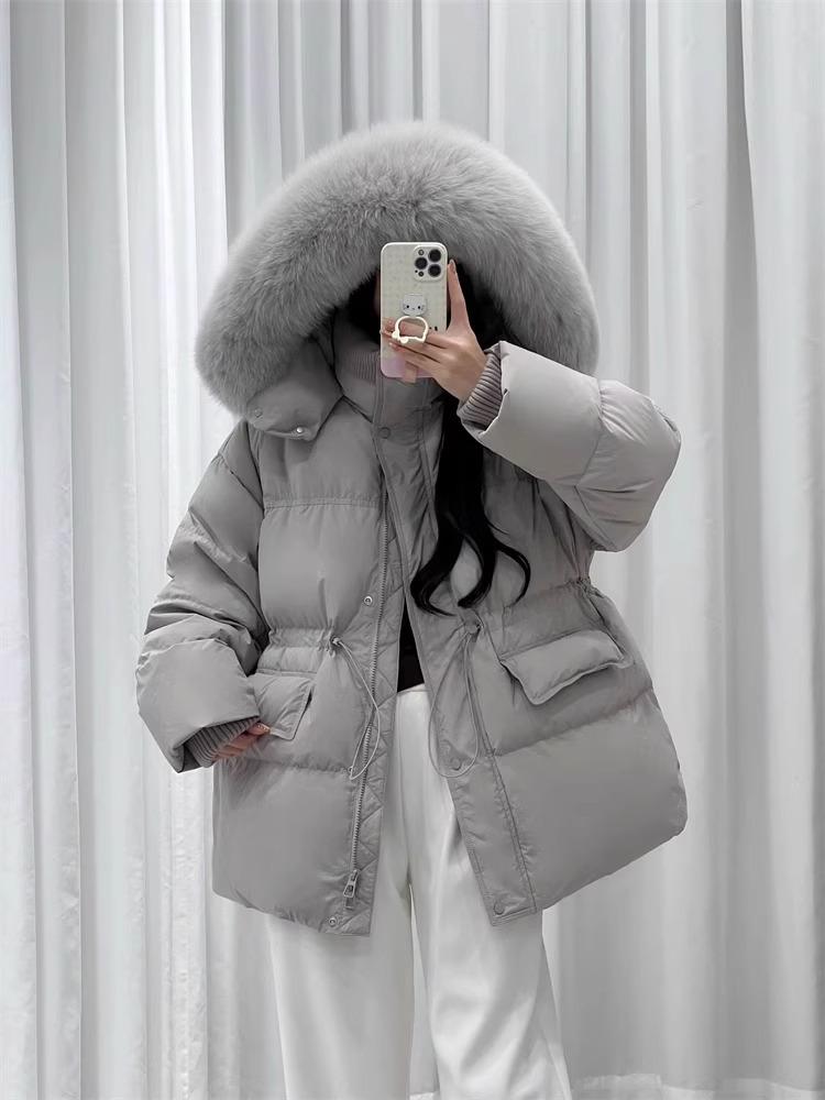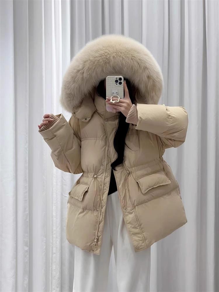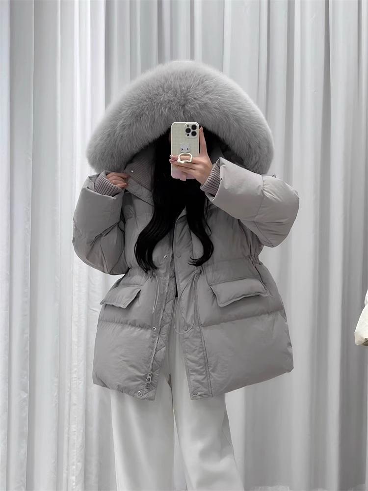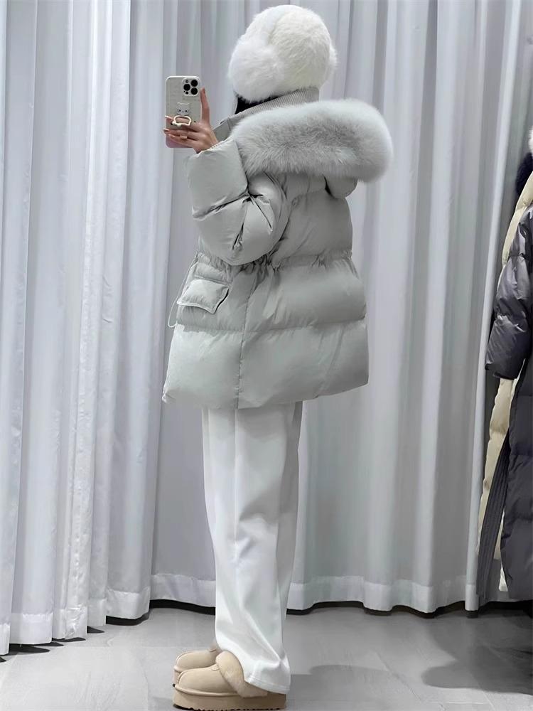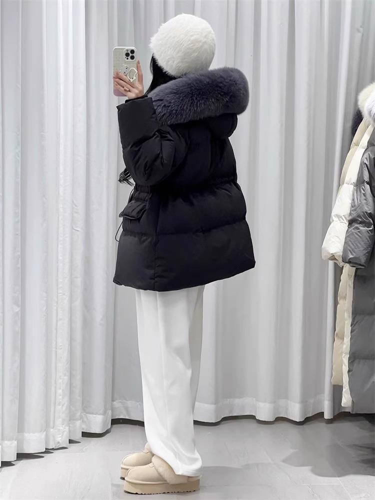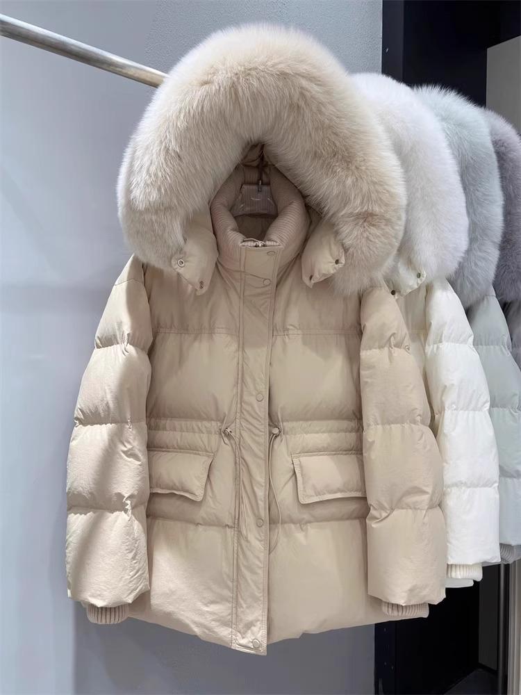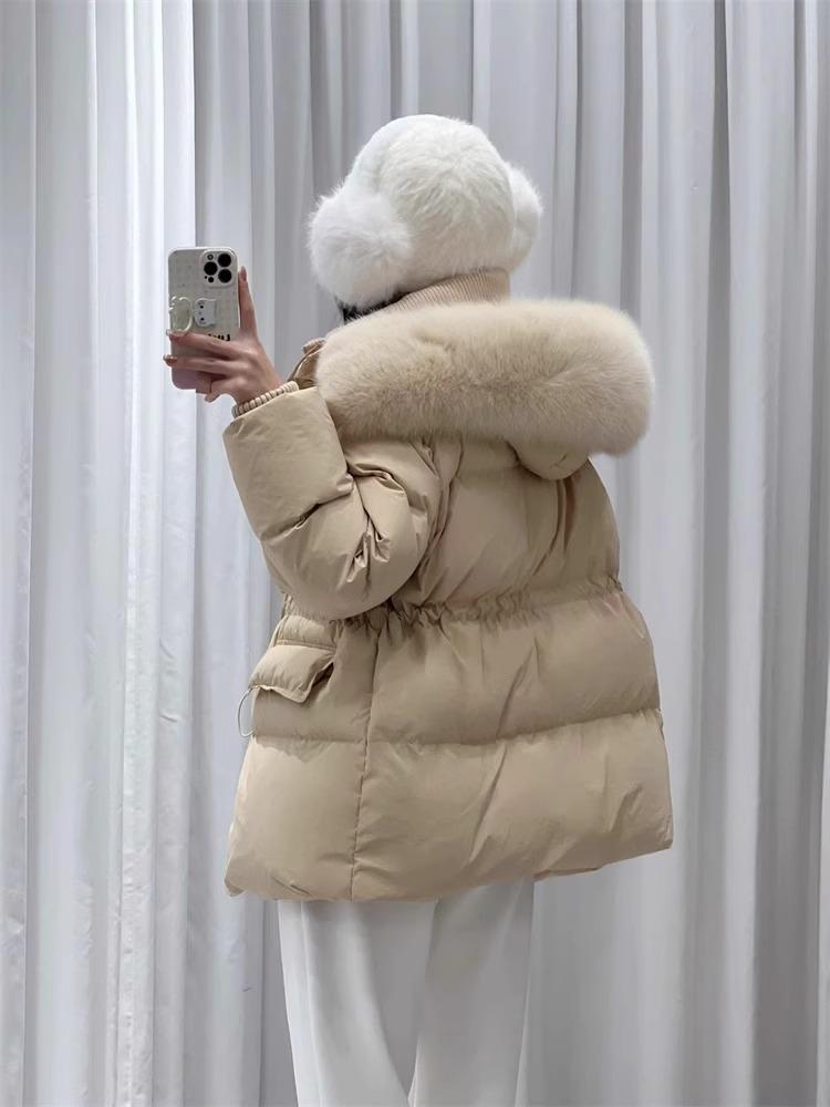 Chamarra de Plumas para Mujer 2025 Invierno Nuevo Diseño Cintura Moda Cuello de Piel Grande Esponjosa Cálida Media Longitud