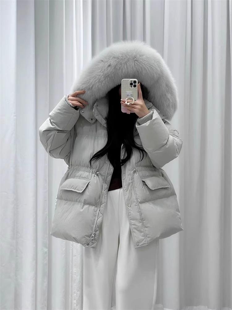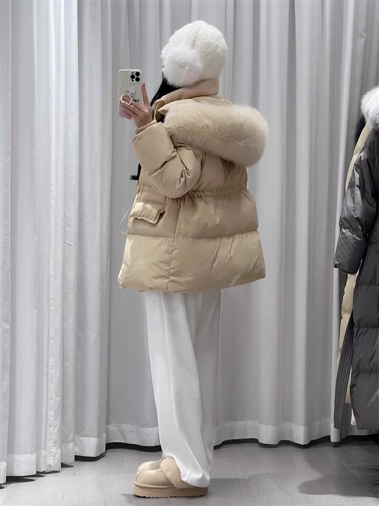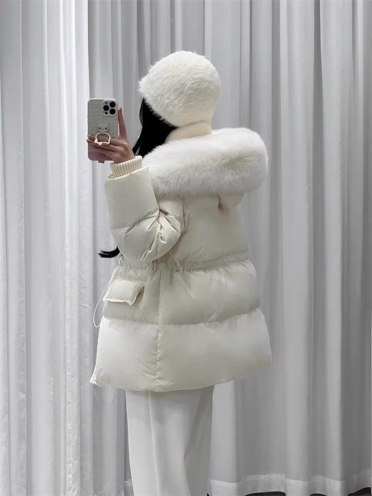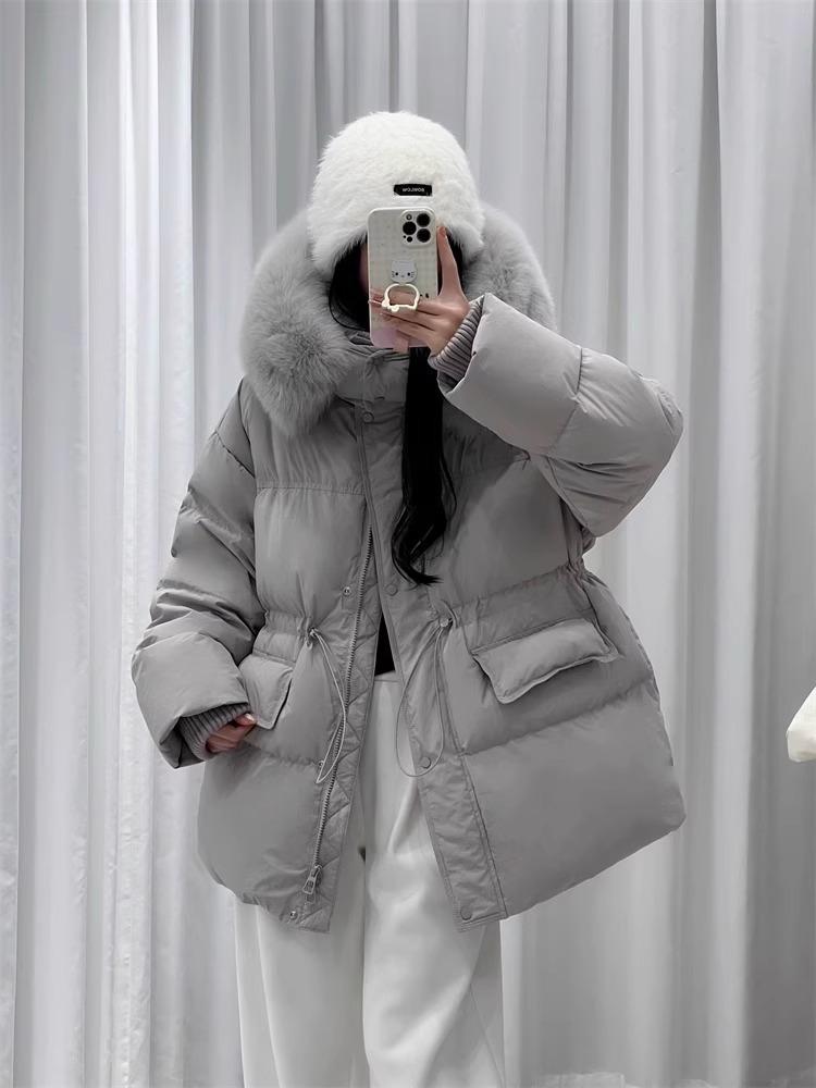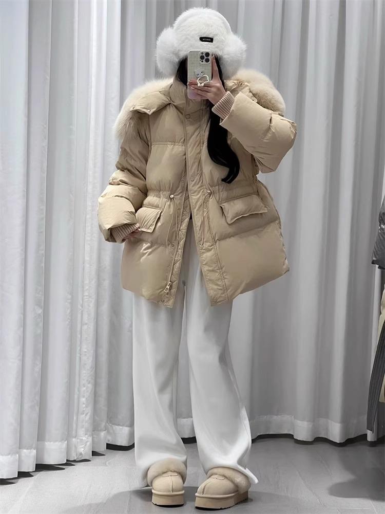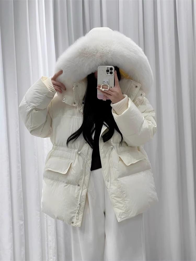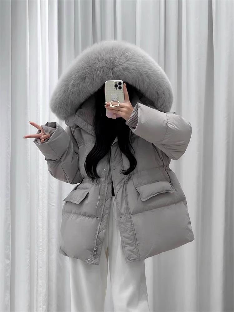 Chamarra de Plumas para Mujer 2025 Invierno Nuevo Diseño Cintura Moda Cuello de Piel Grande Esponjosa Cálida Media Longitud