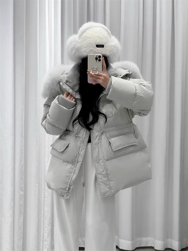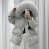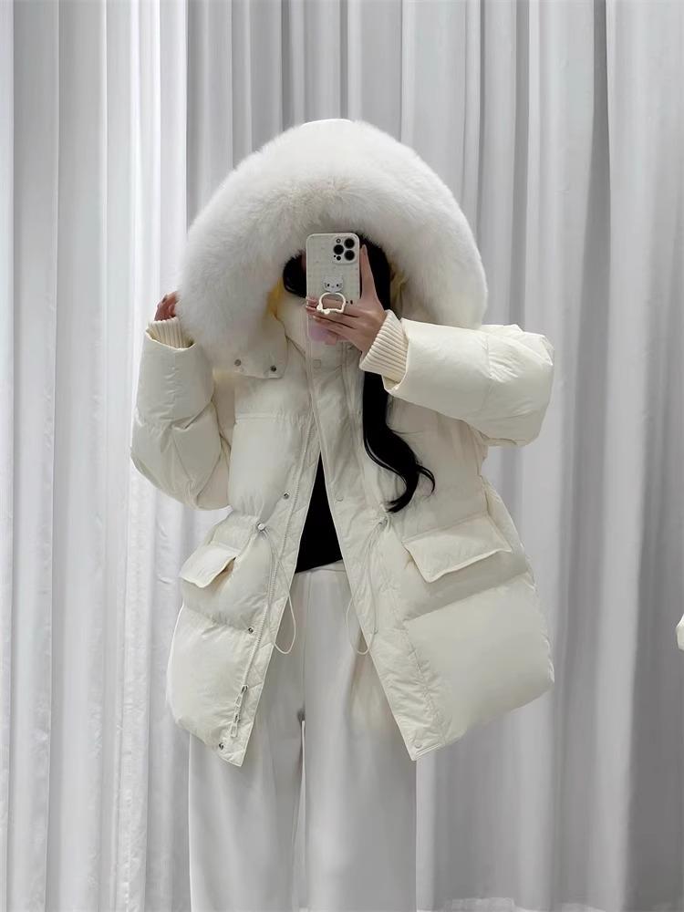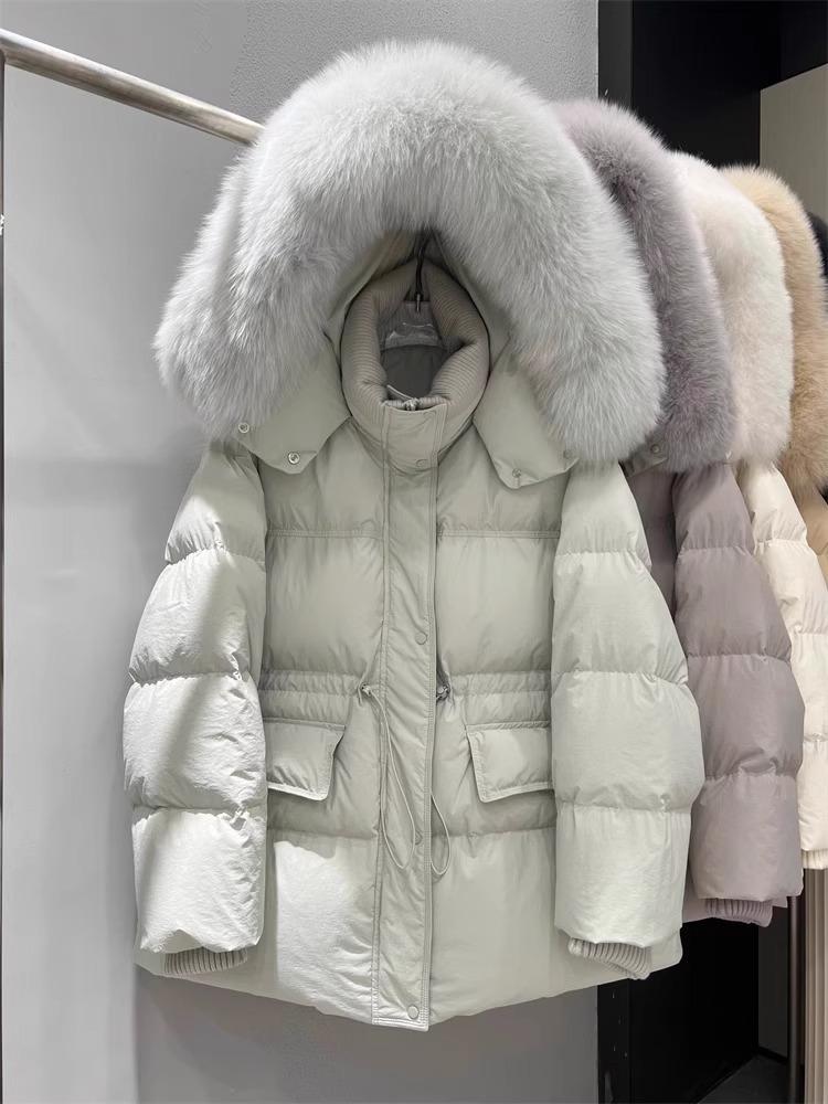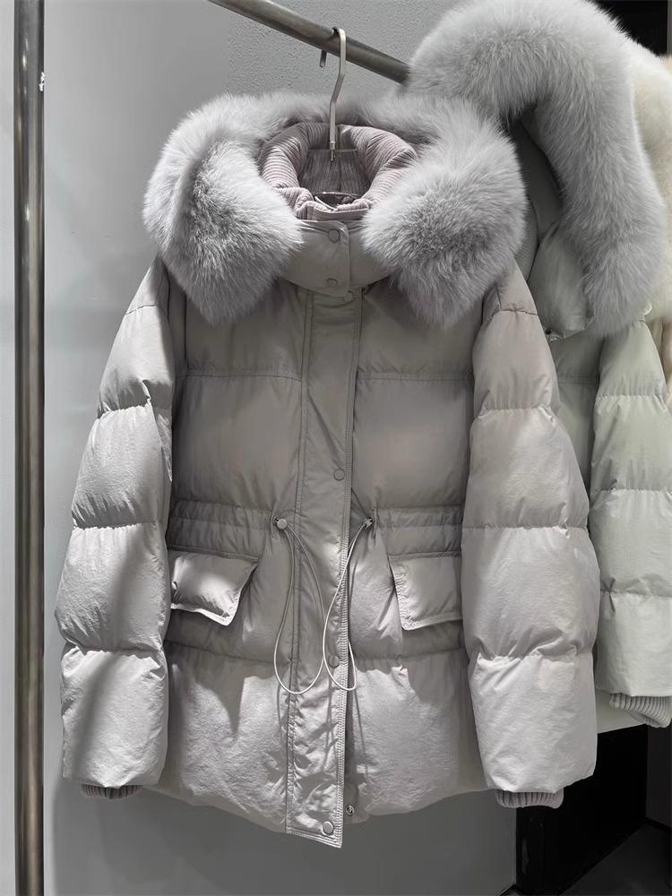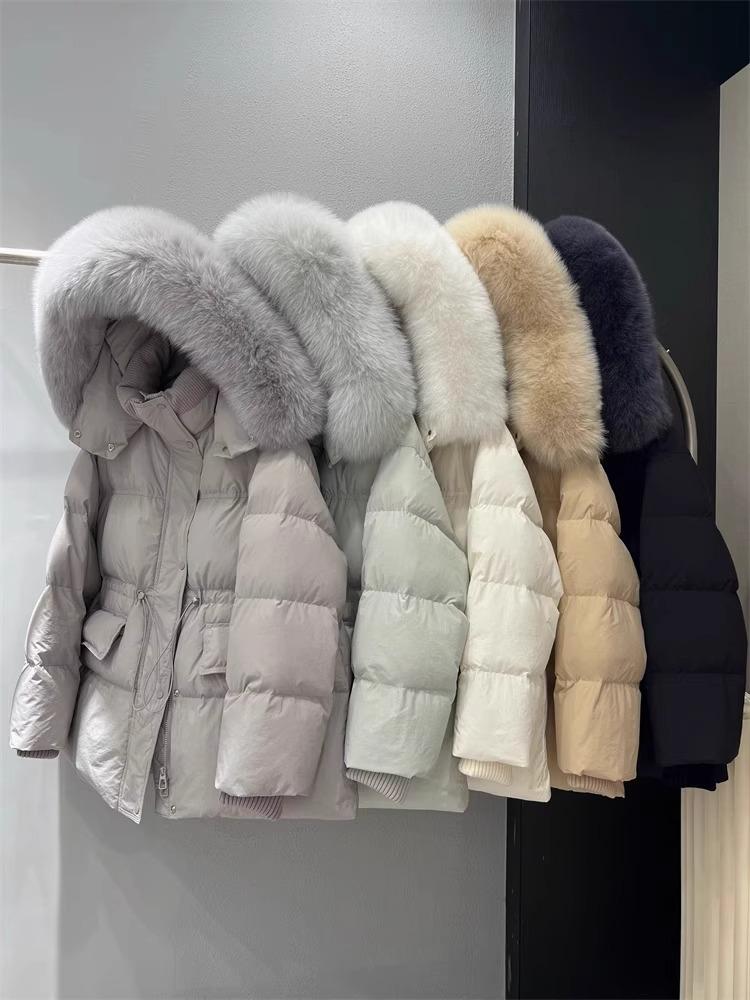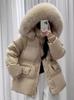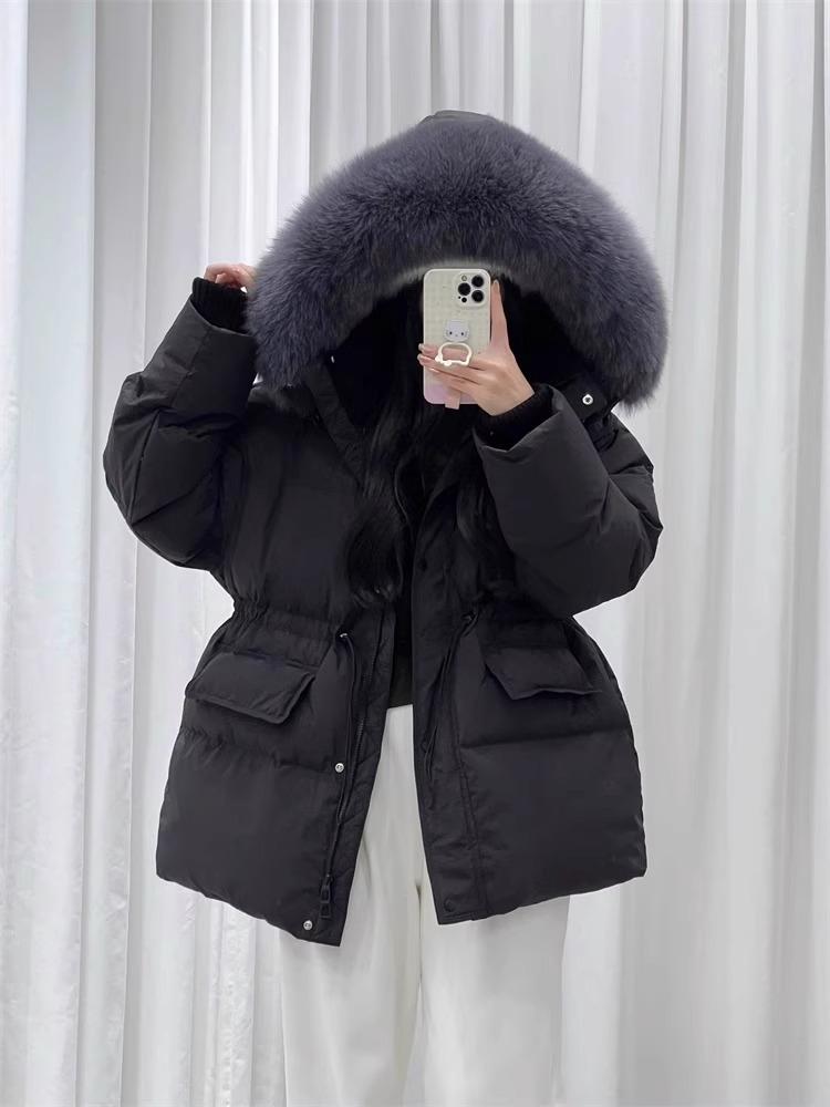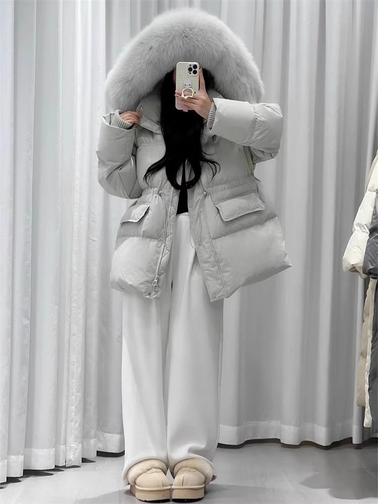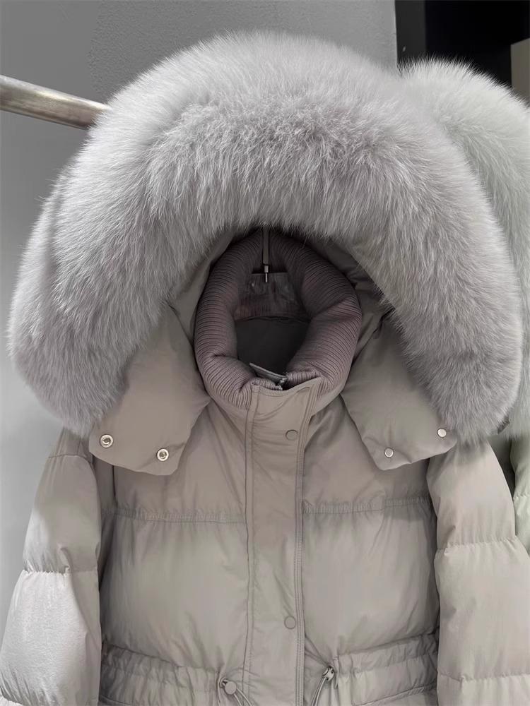 Chamarra de Plumas para Mujer 2025 Invierno Nuevo Diseño Cintura Moda Cuello de Piel Grande Esponjosa Cálida Media Longitud
