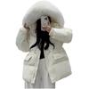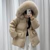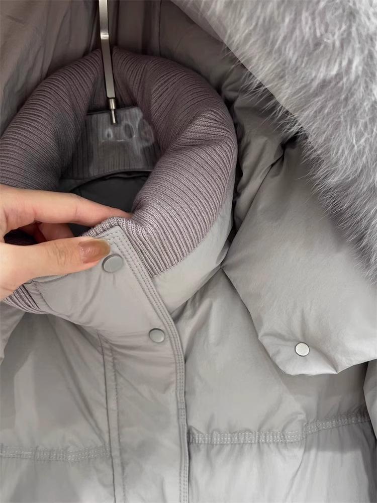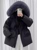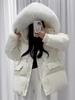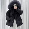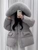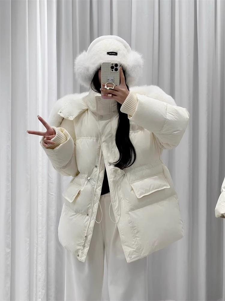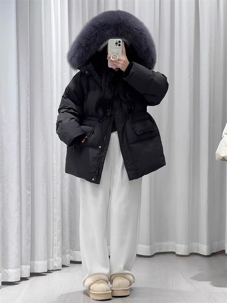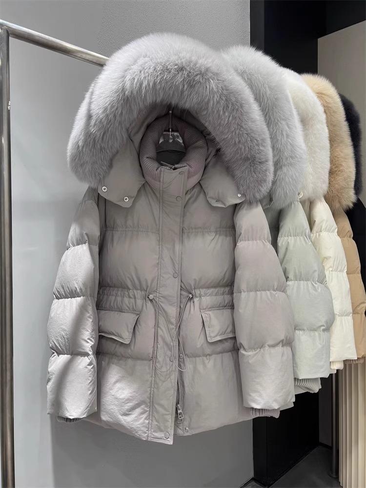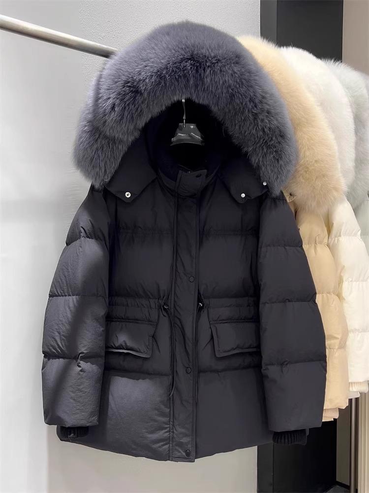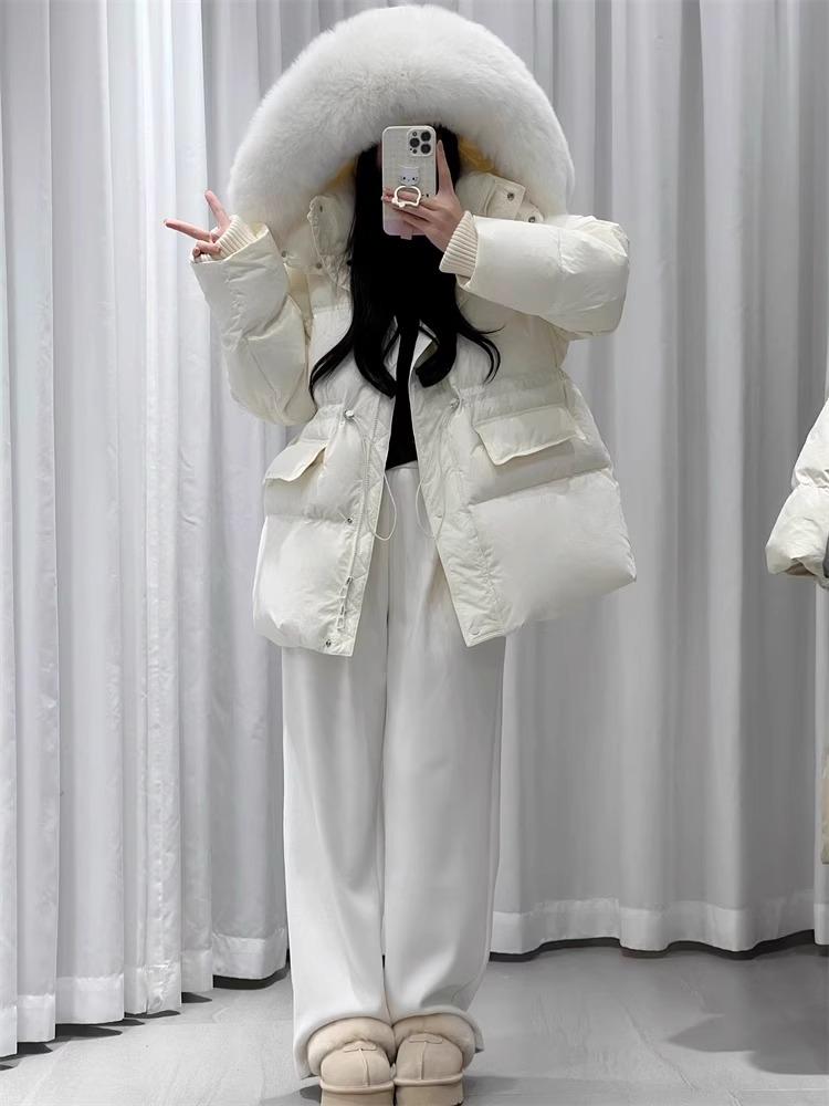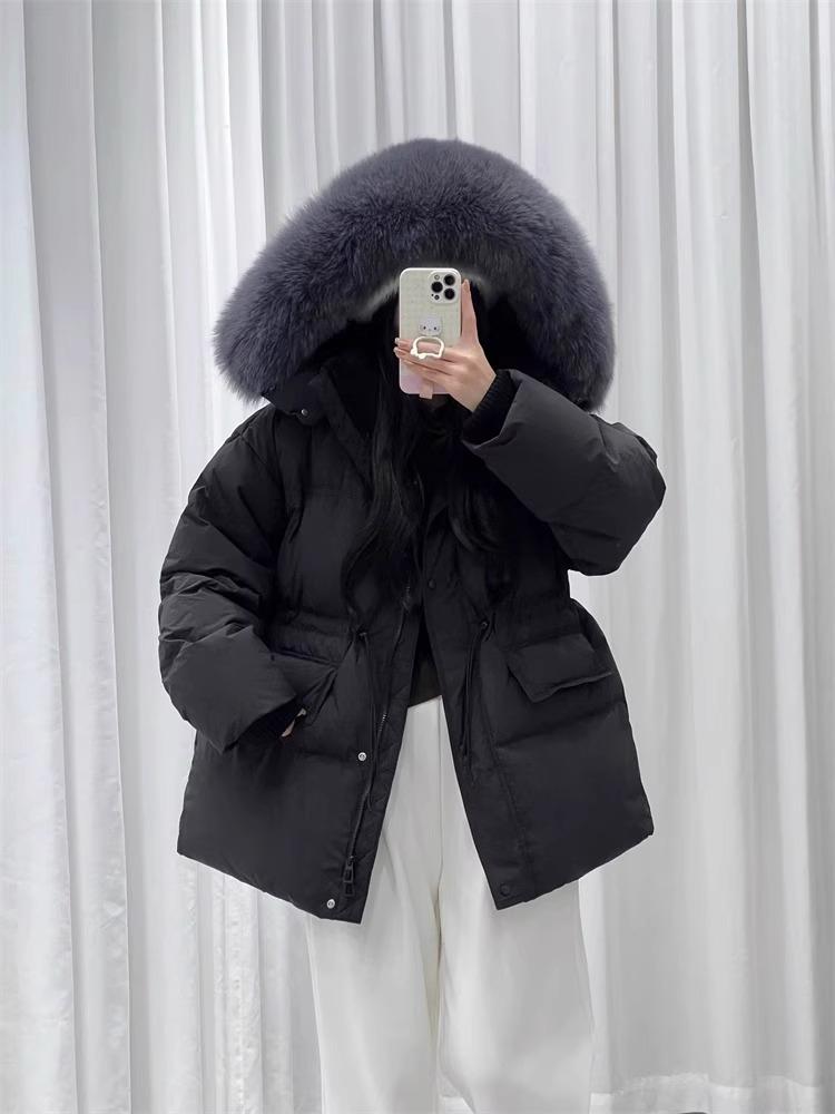 Chamarra de Plumas para Mujer 2025 Invierno Nuevo Diseño Cintura Moda Cuello de Piel Grande Esponjosa Cálida Media Longitud