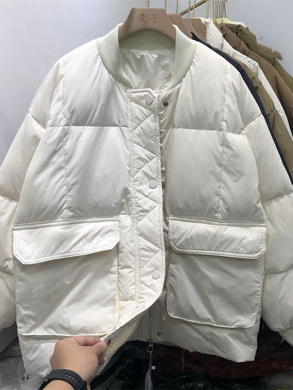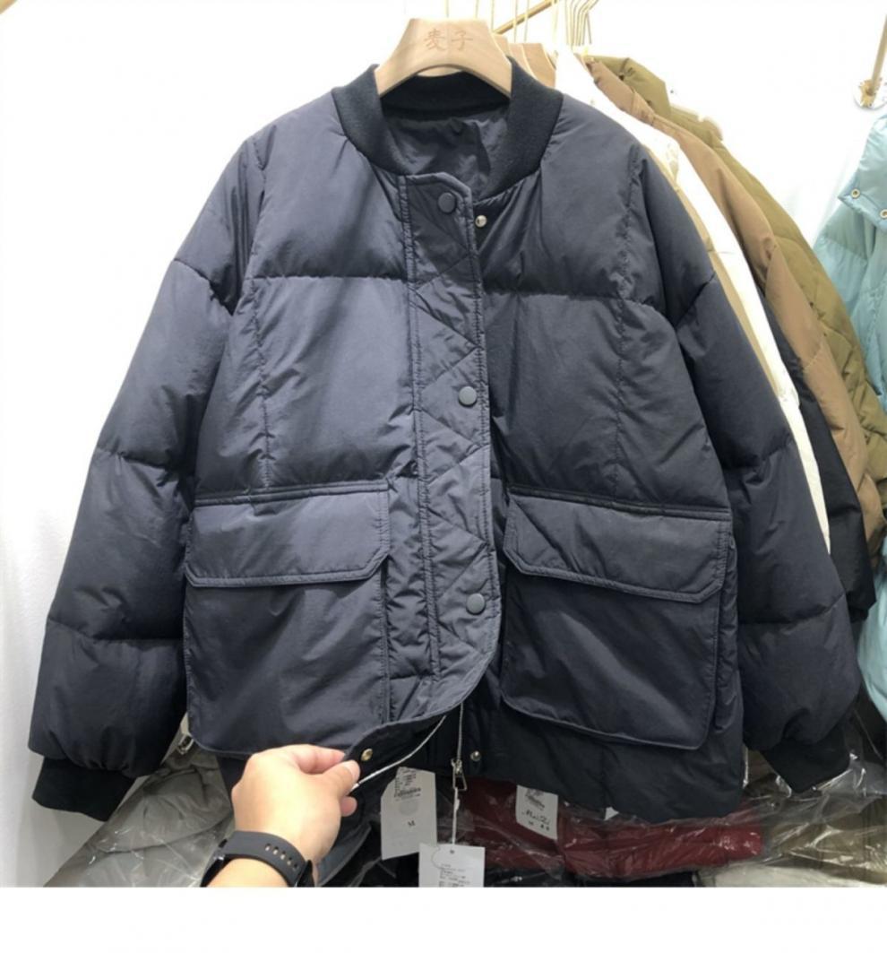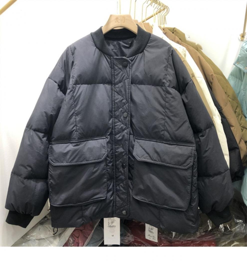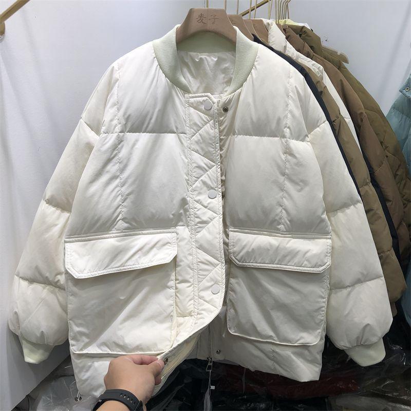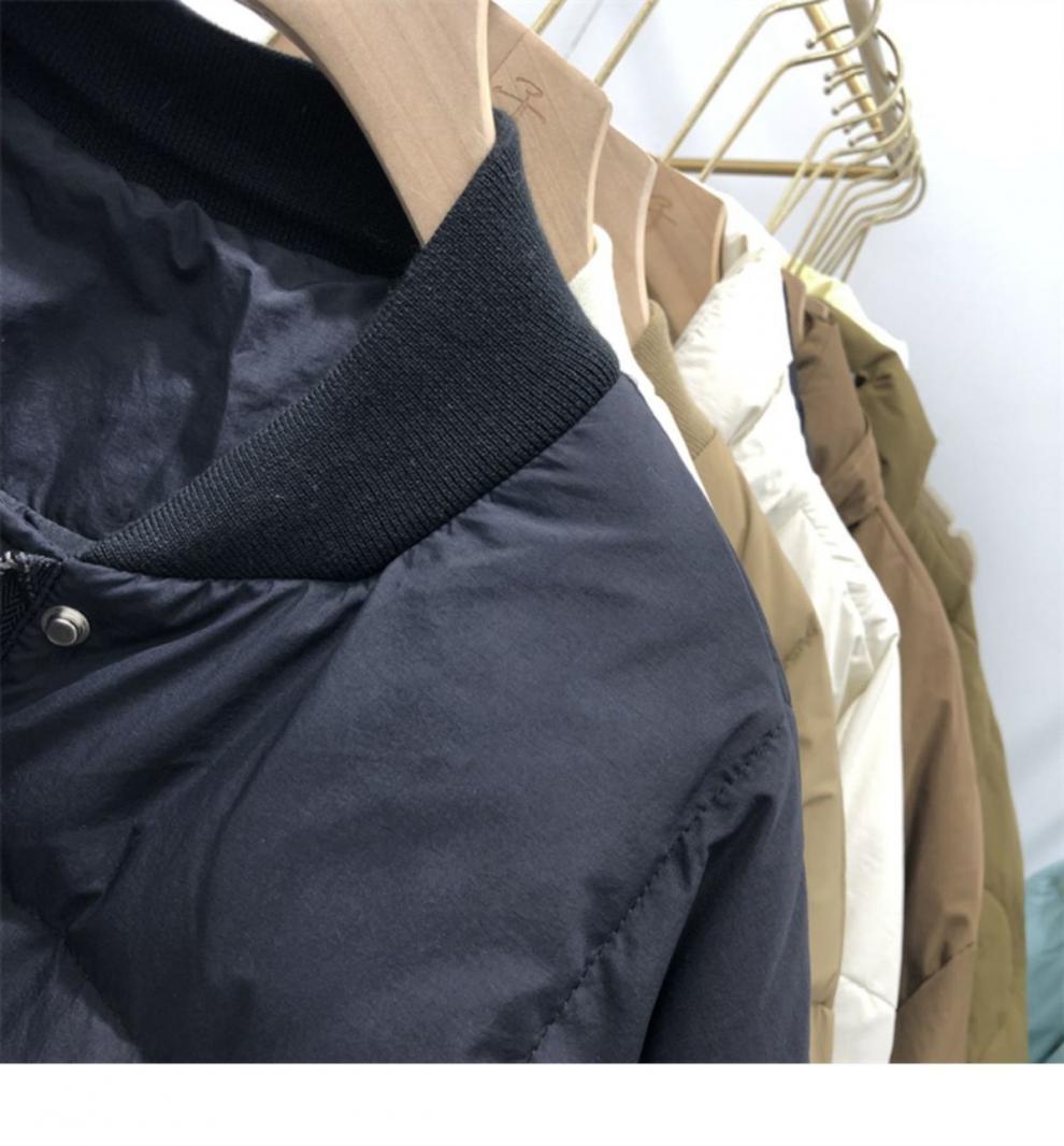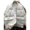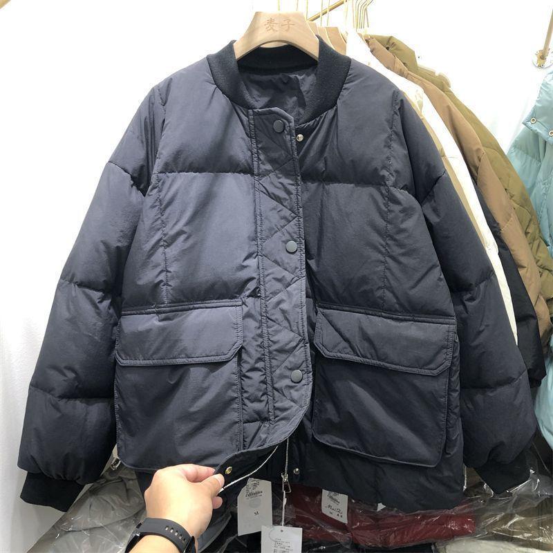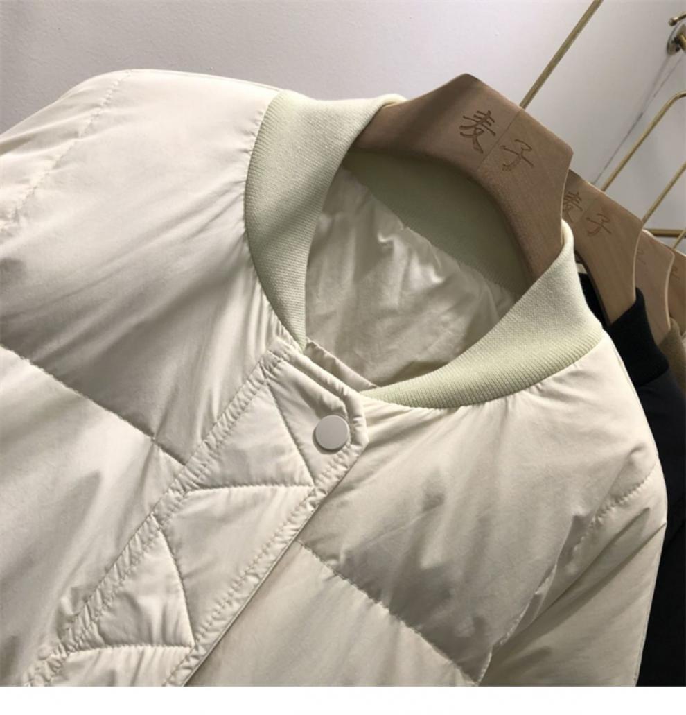 Chaqueta acolchada de algodón con cuello vertical y bolsillos grandes para mujer, diseño novedoso de invierno 2024, estilo béisbol de nicho