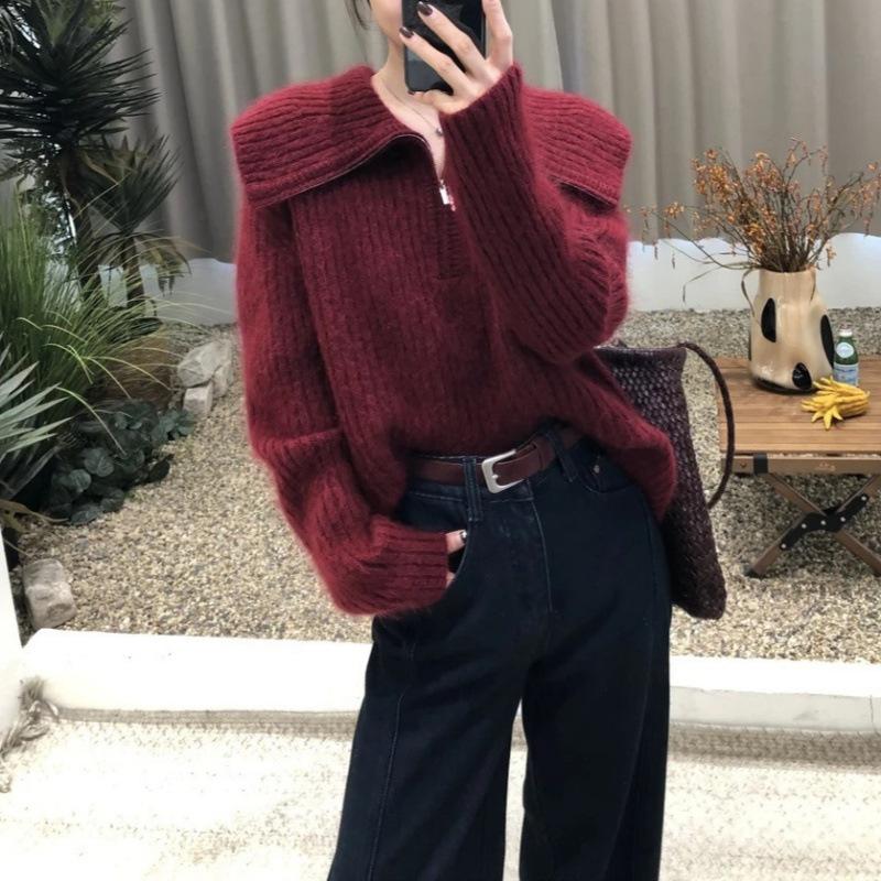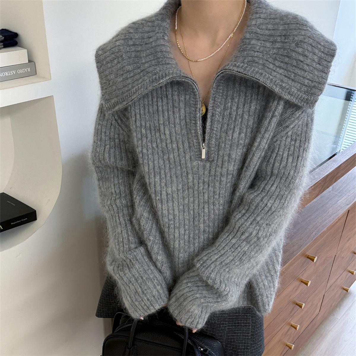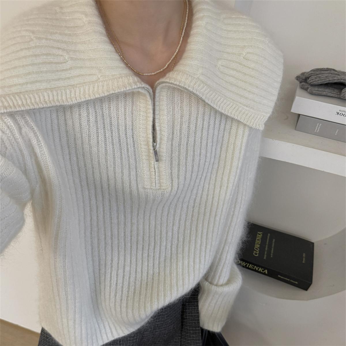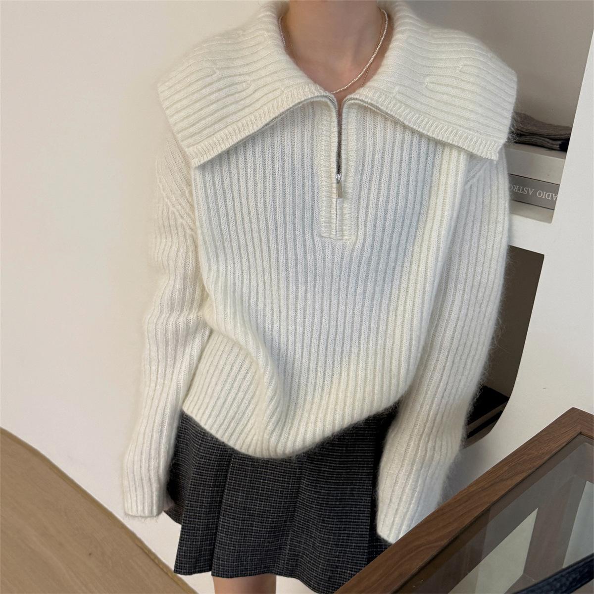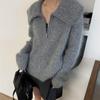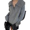 Top tipo jersey de solapa grande estilo coreano para mujer, suéter de punto con media cremallera, suave, ceroso, de canalé, nuevo para otoño e invierno, suéter para exterior de mujer