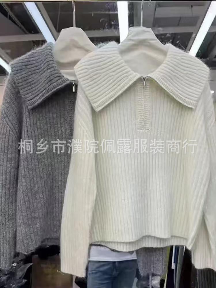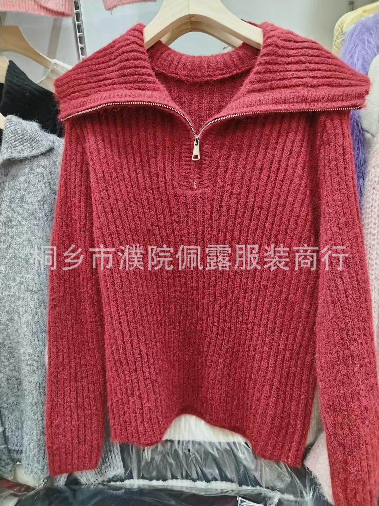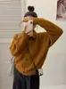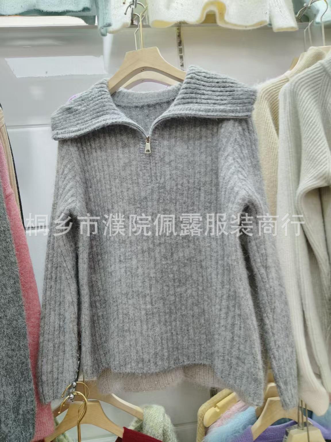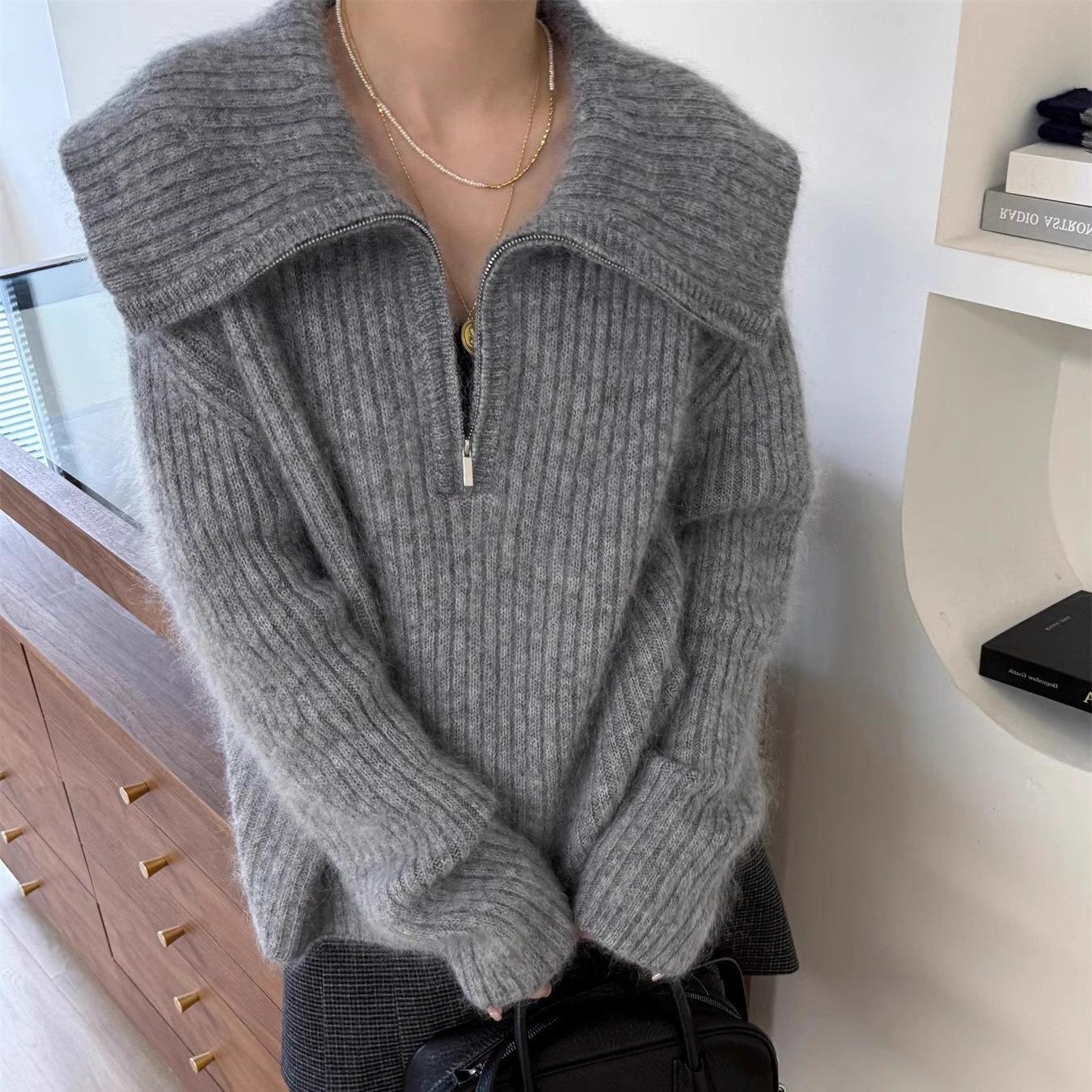 Top tipo jersey de solapa grande estilo coreano para mujer, suéter de punto con media cremallera, suave, ceroso, de canalé, nuevo para otoño e invierno, suéter para exterior de mujer