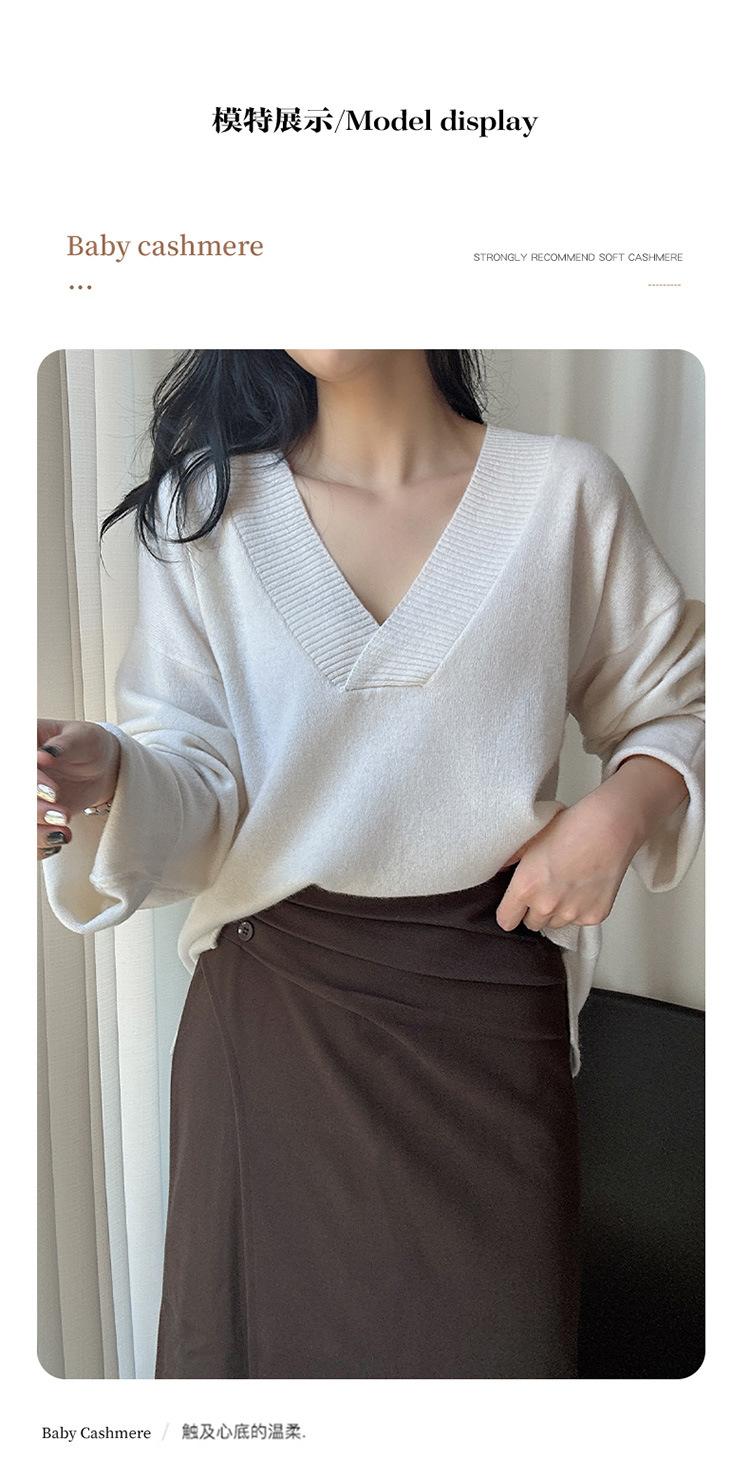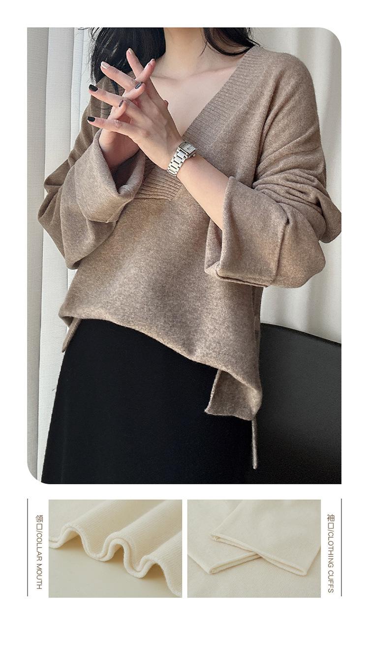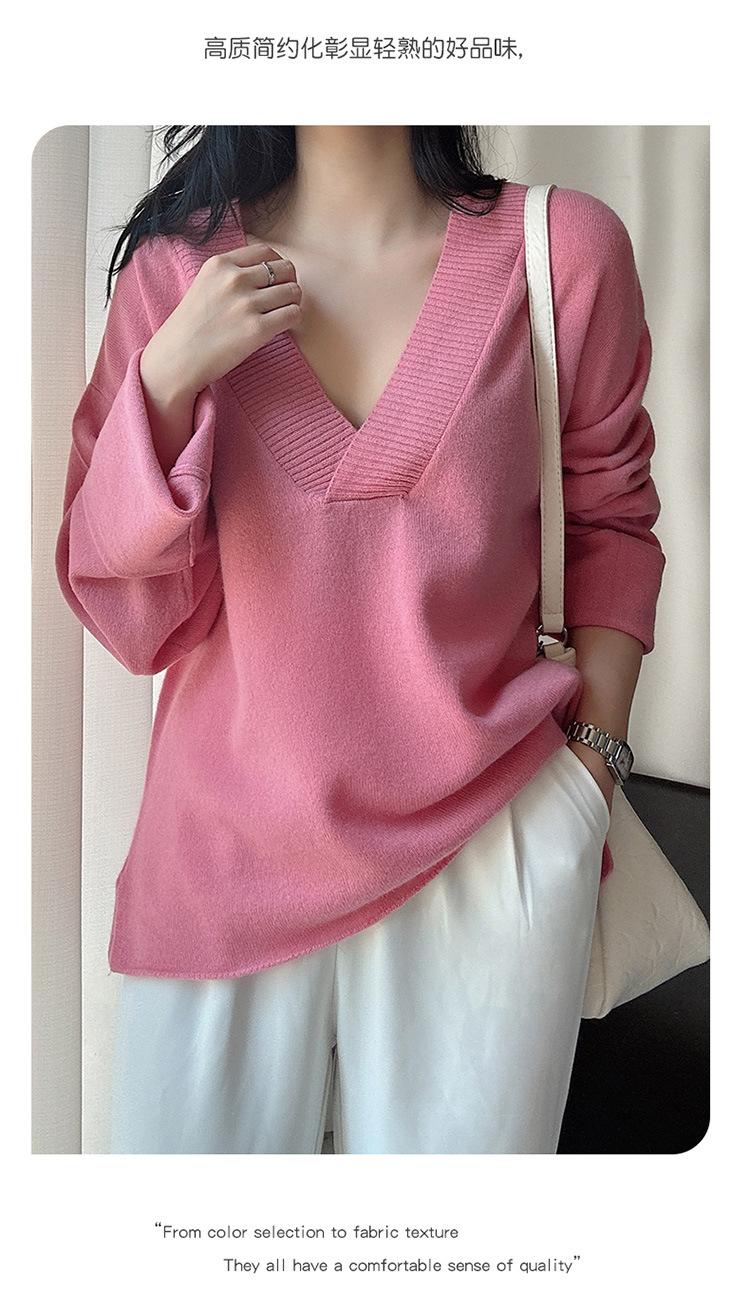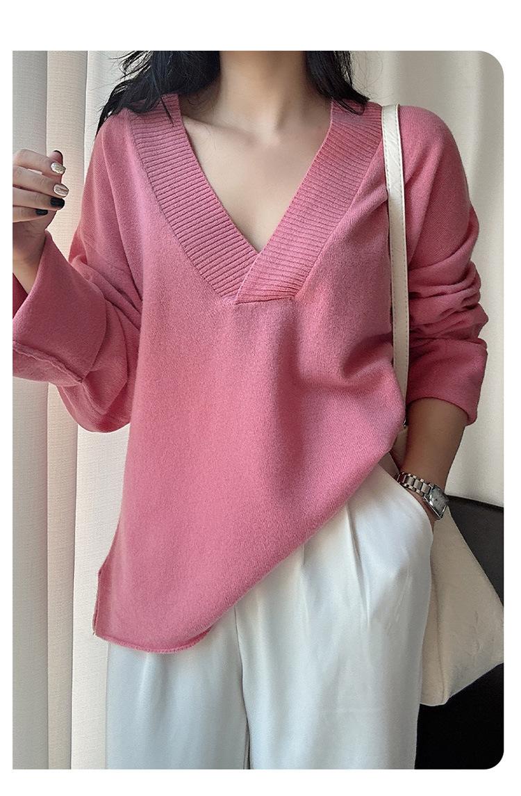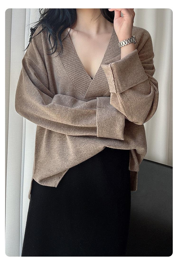 Top coreano holgado de lana 100% pura con cuello en V para mujer, 24 nuevos tops de punto de lana de invierno de alta gama apilados