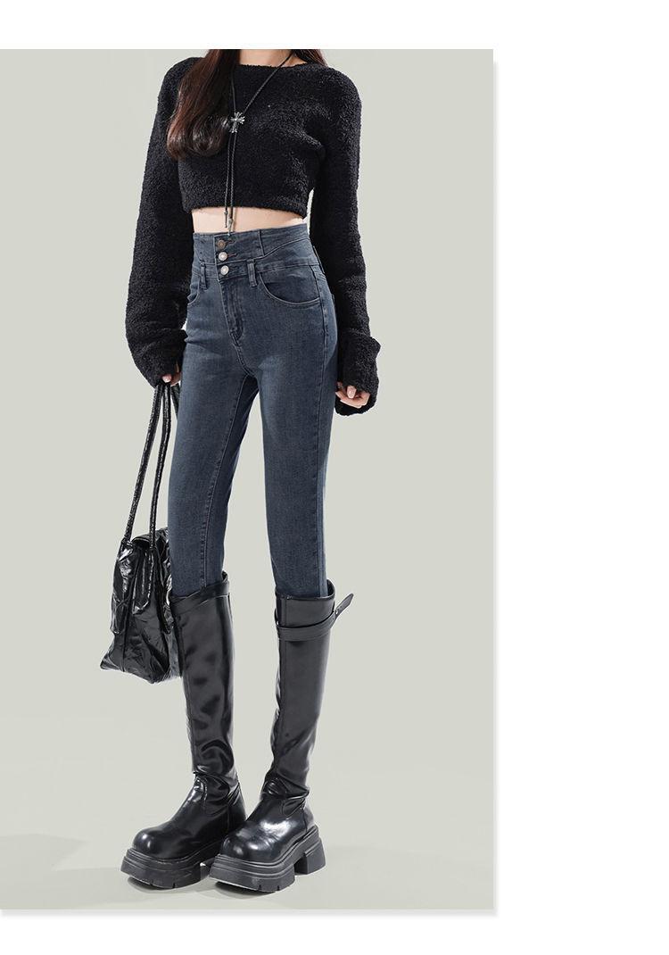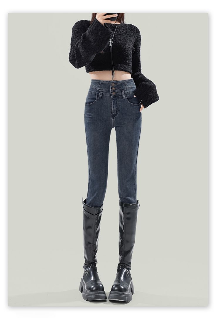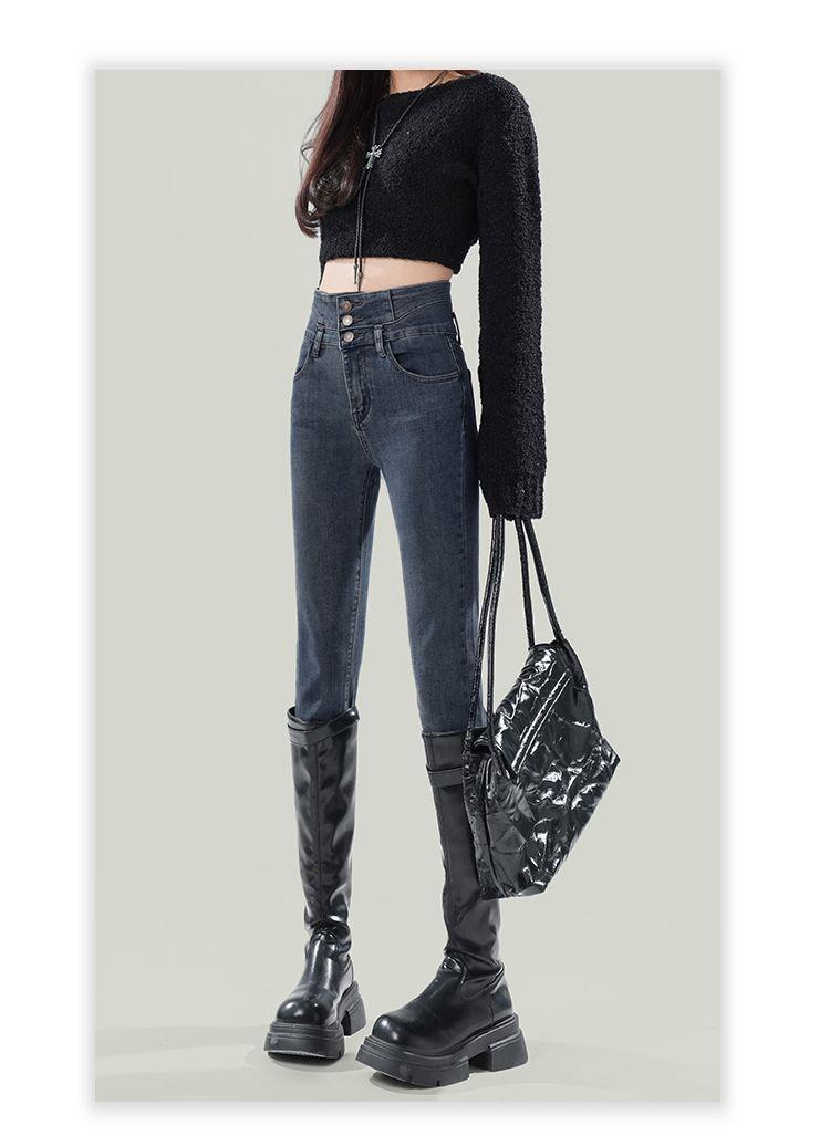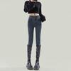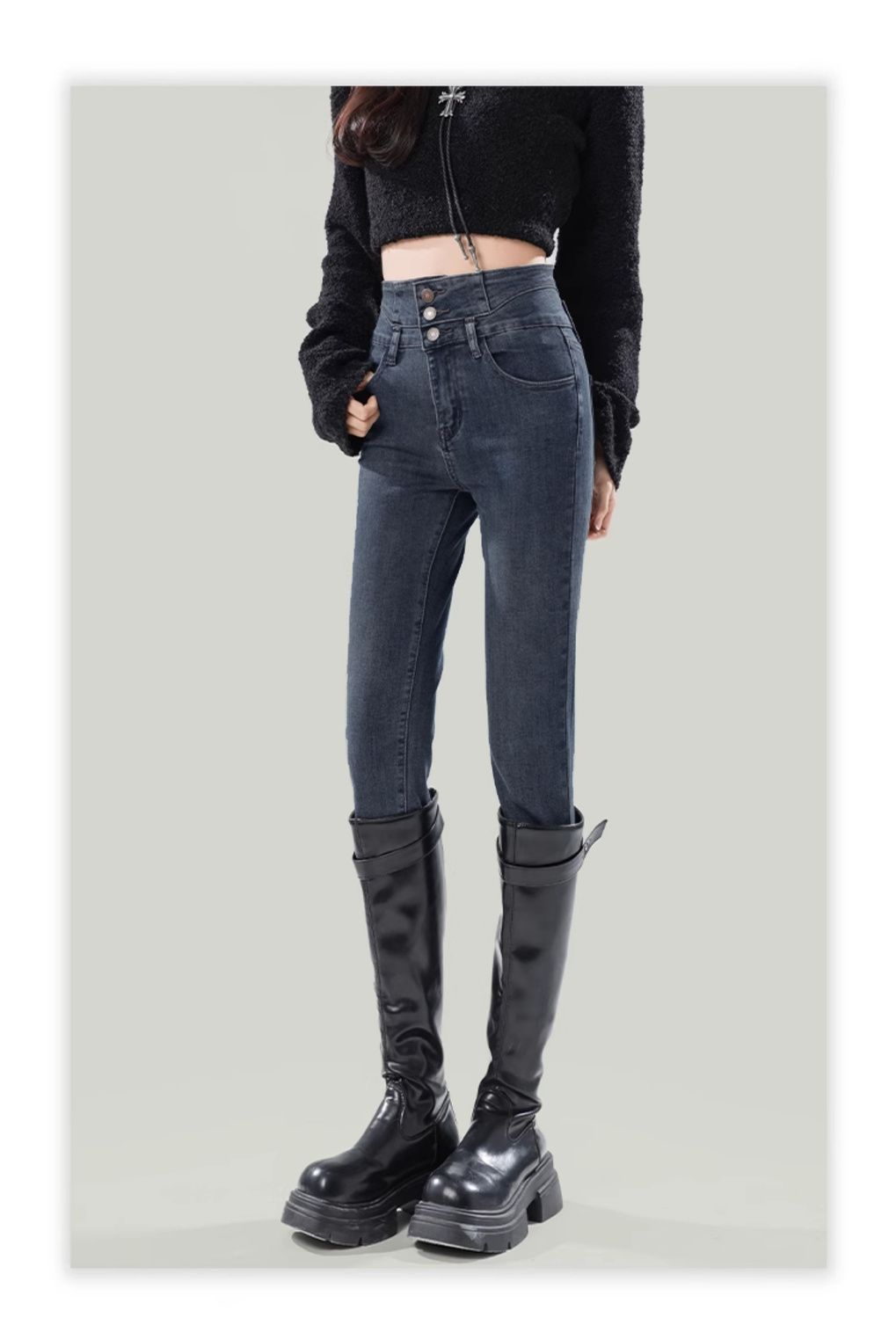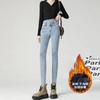 Pantalones vaqueros ajustados con forro polar para mujer, otoño e invierno 2024, nuevos pantalones ajustados de cintura alta, pequeños, retro, para primavera y otoño.