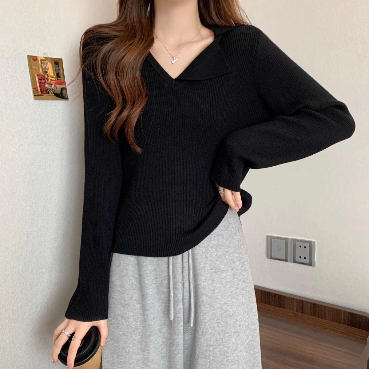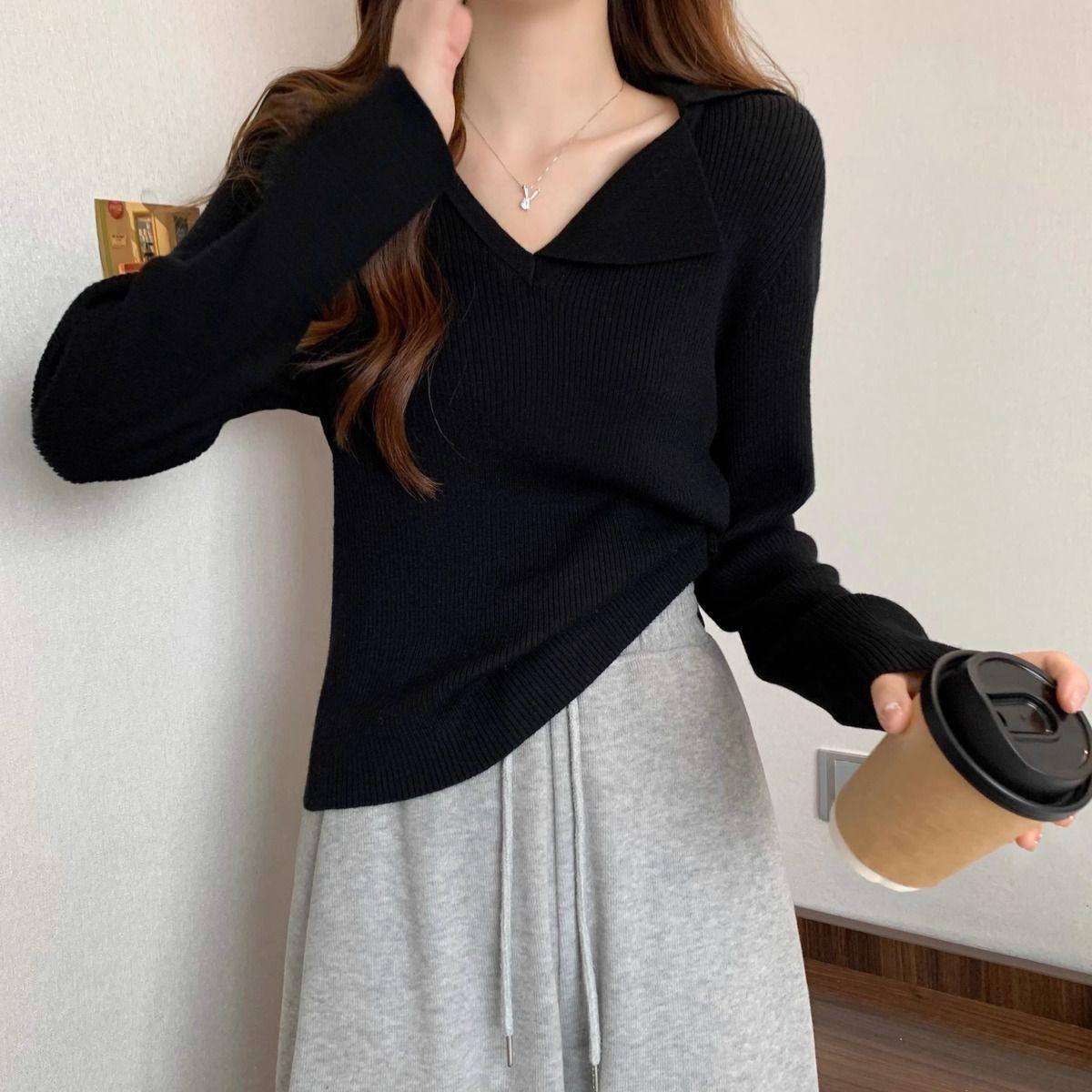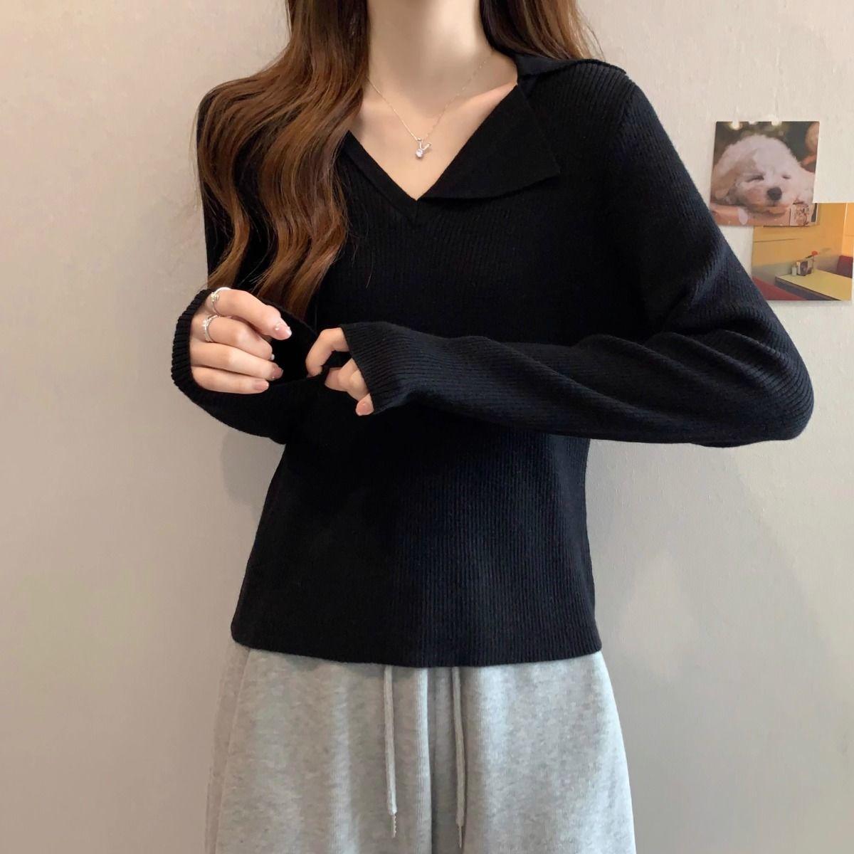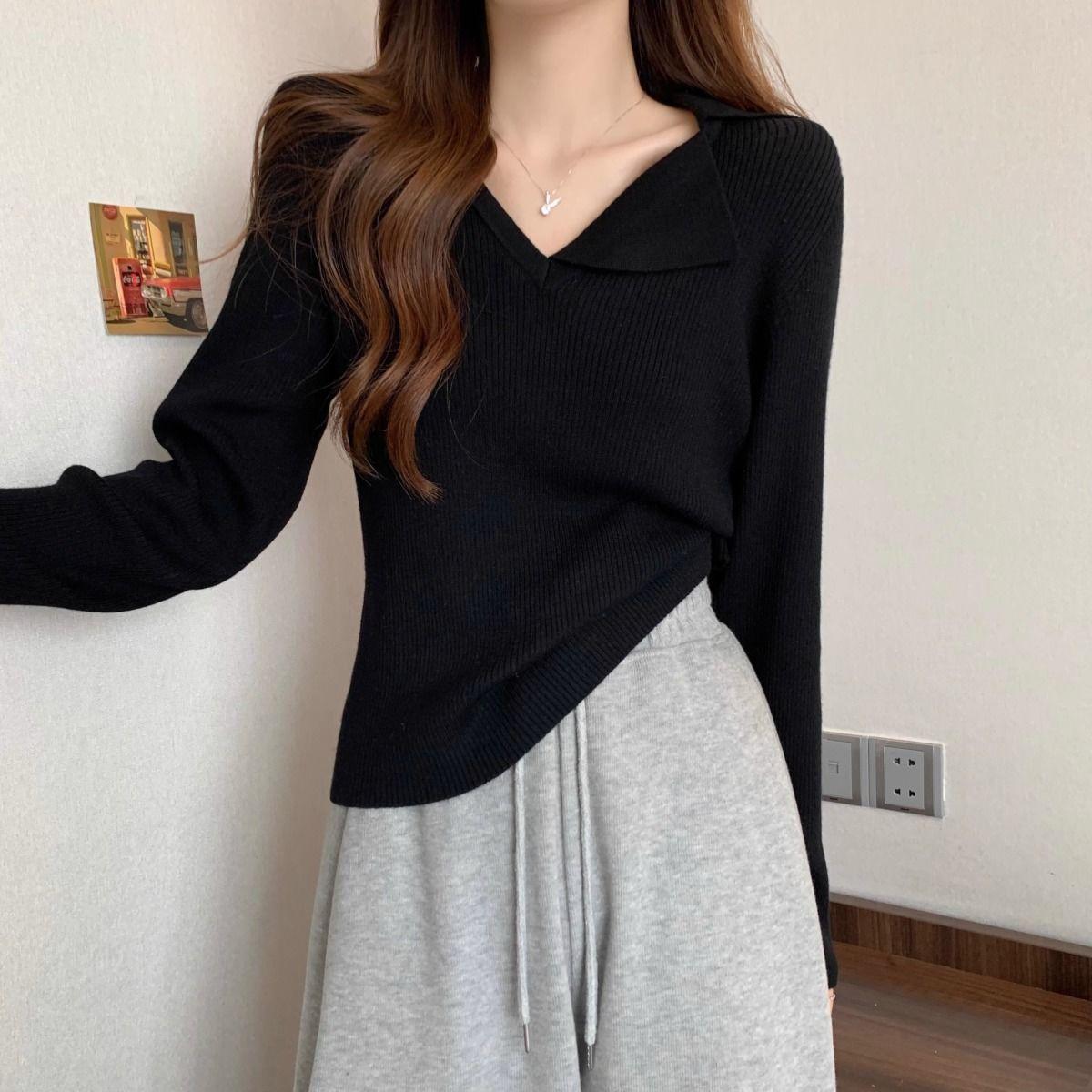 Suéter de punto de nicho con cuello en V y manga larga de otoño para mujer, dulce, de color sólido, ajustado, diseño de camisa básica, top Sense
