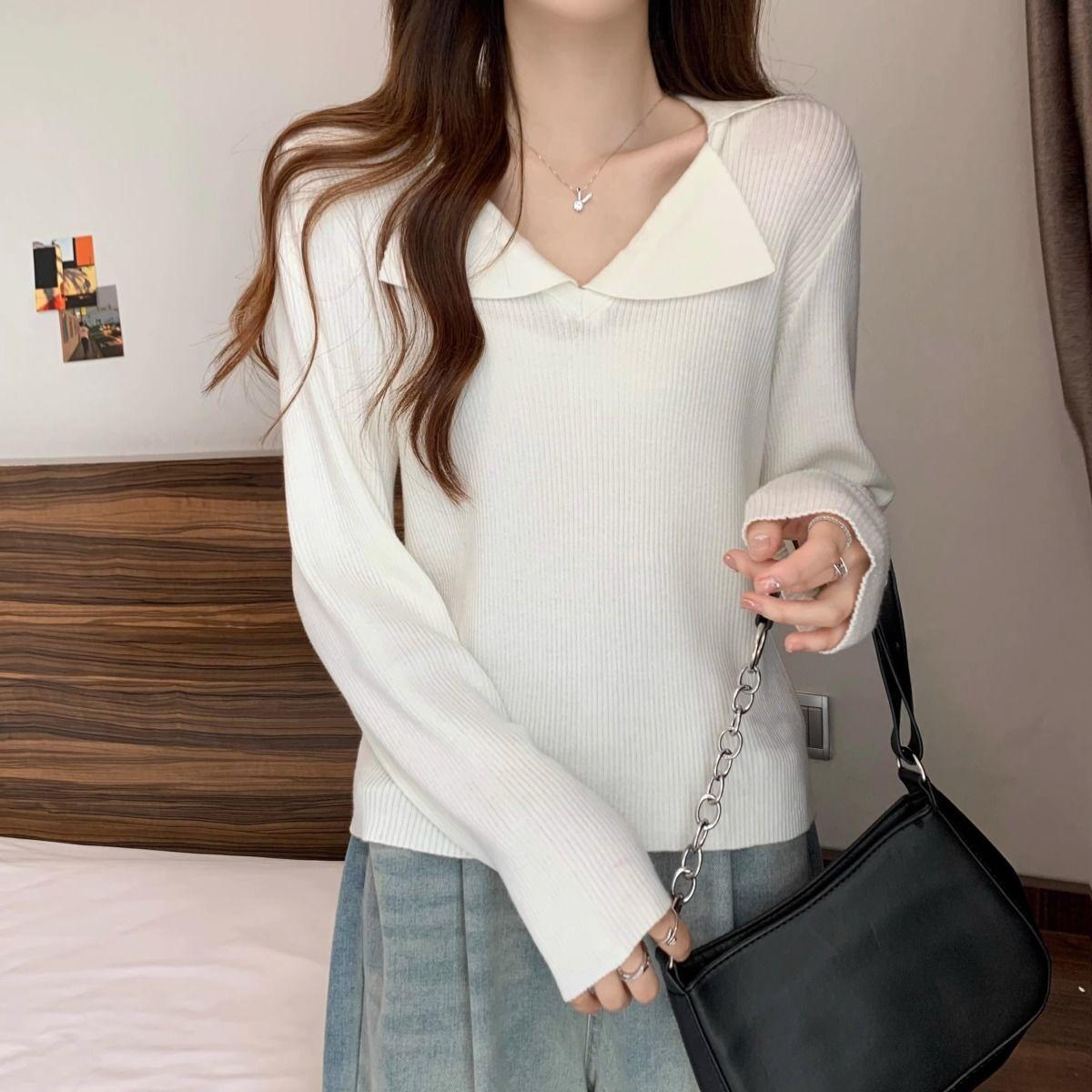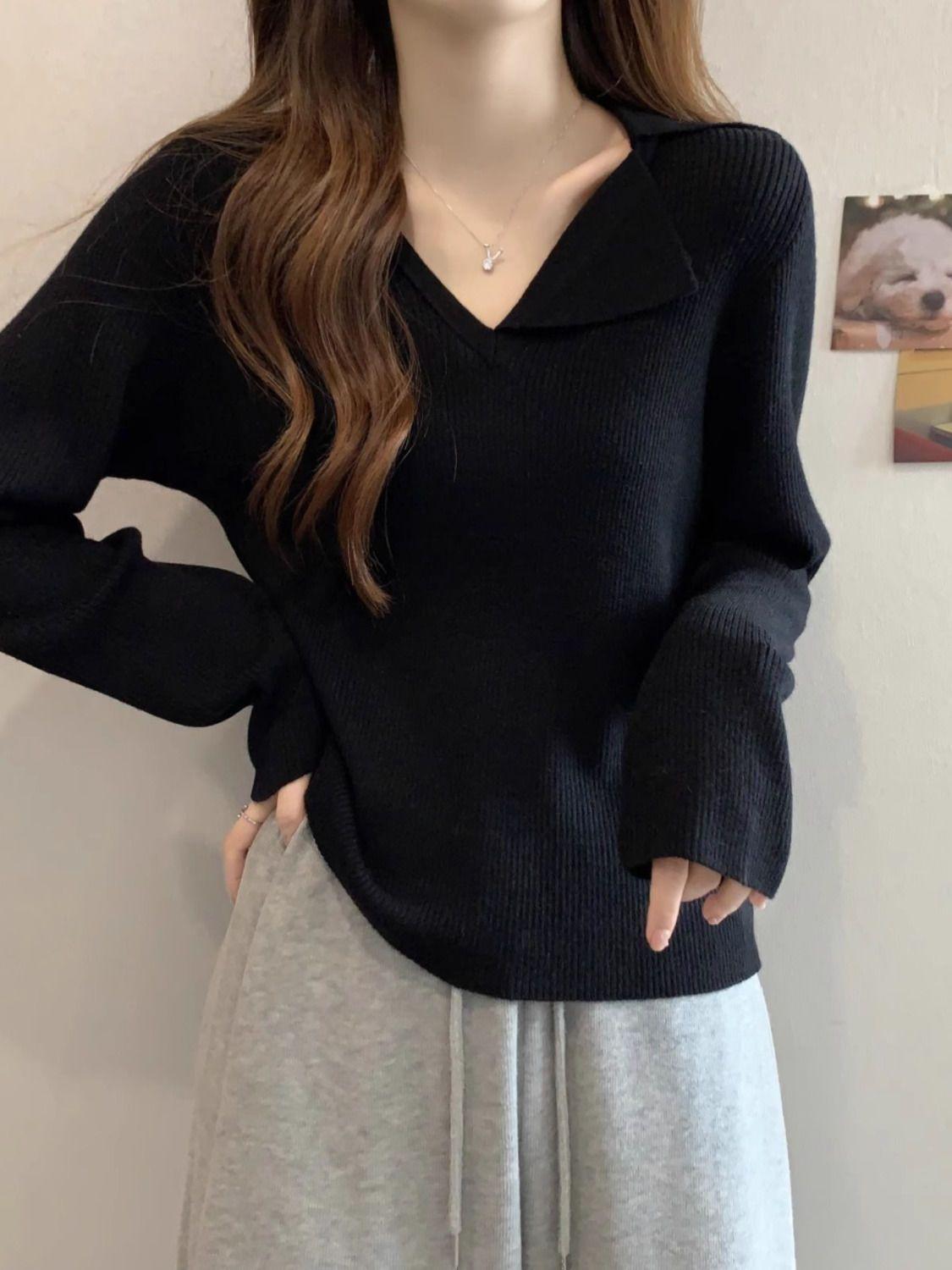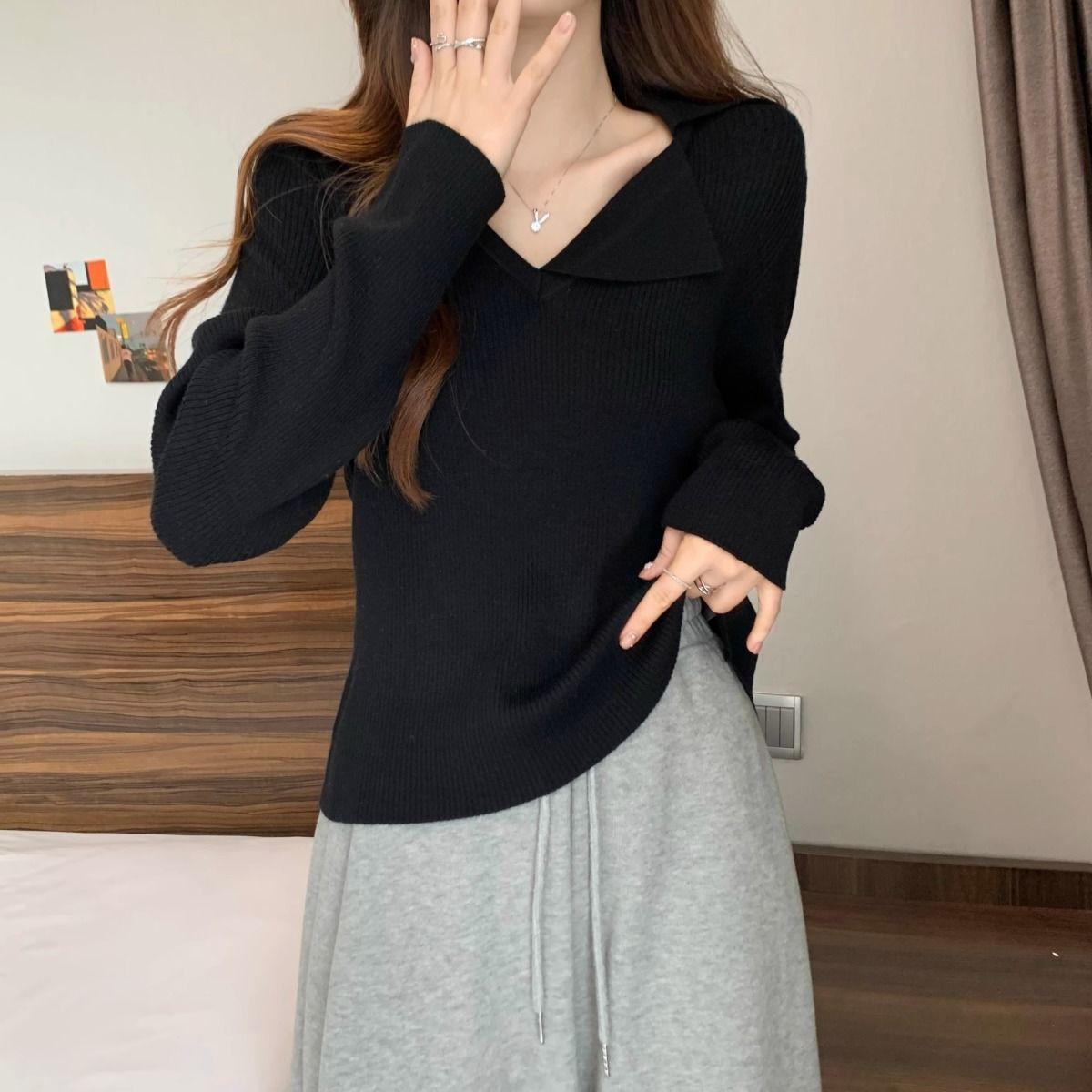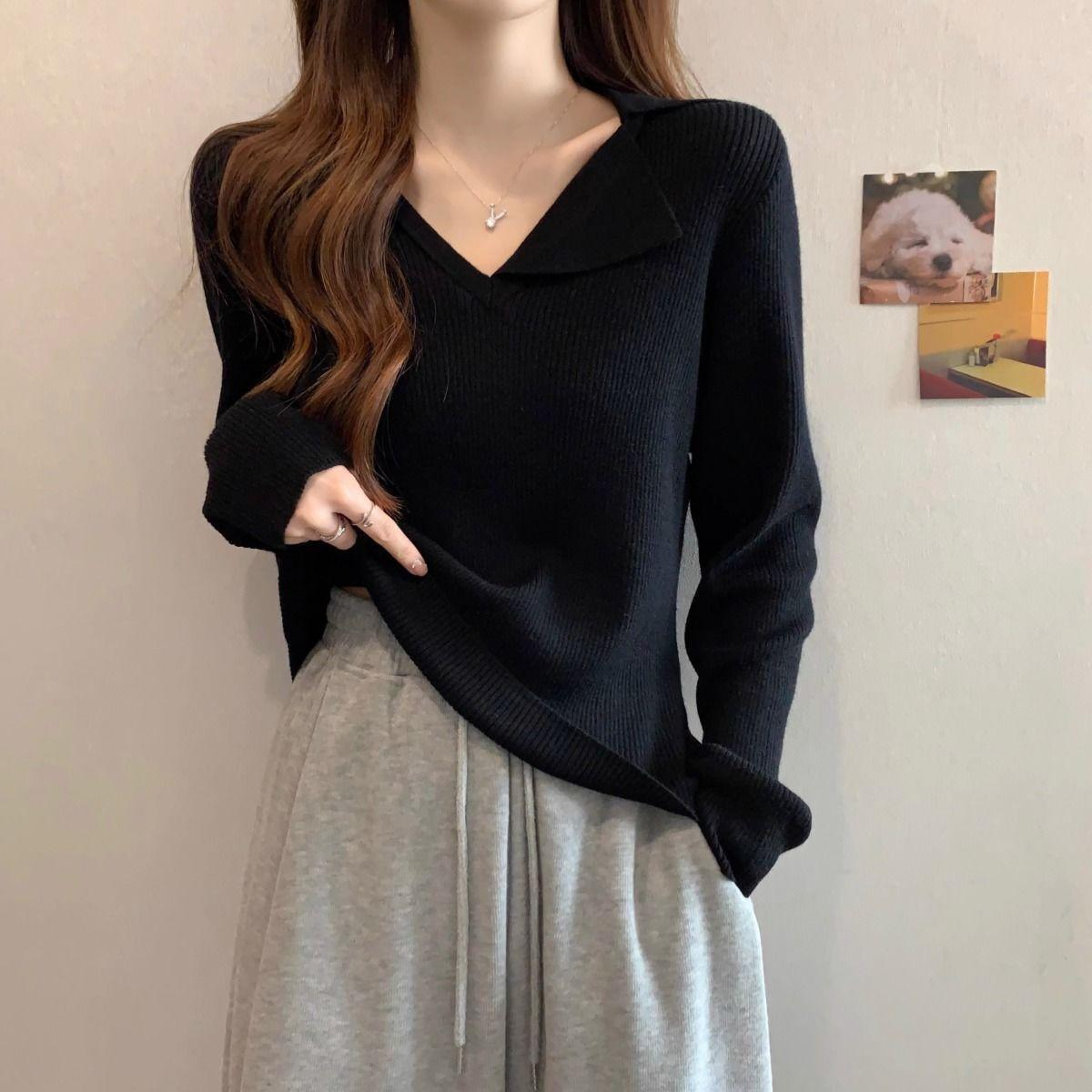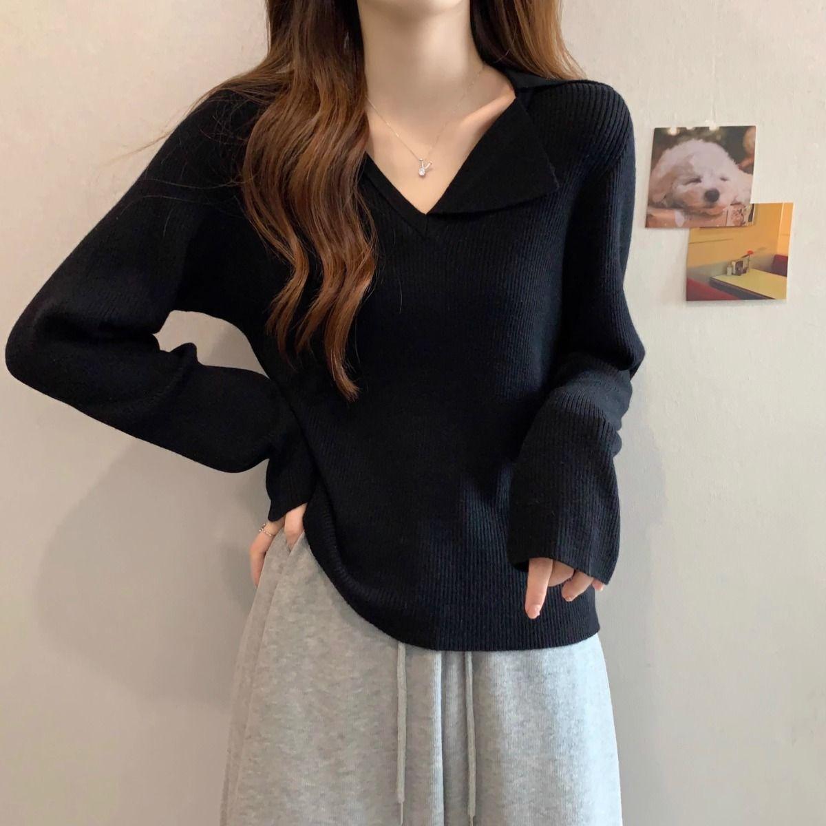 Suéter de punto de nicho con cuello en V y manga larga de otoño para mujer, dulce, de color sólido, ajustado, diseño de camisa básica, top Sense