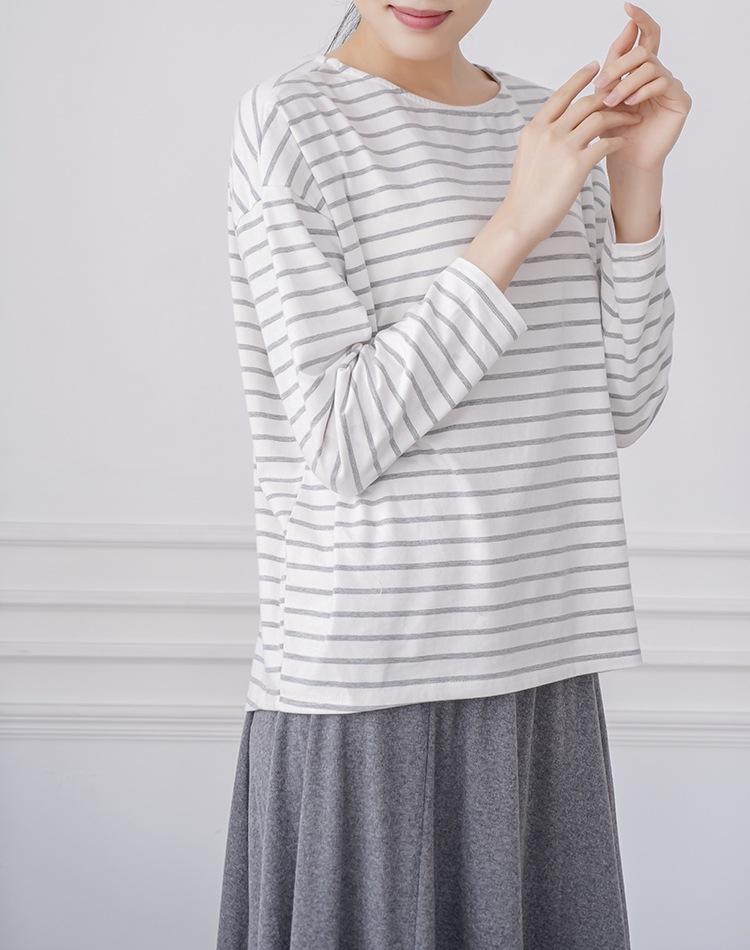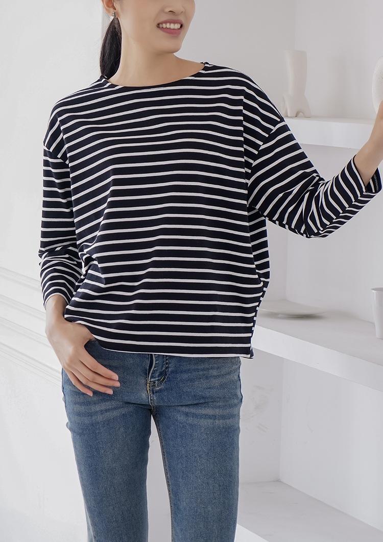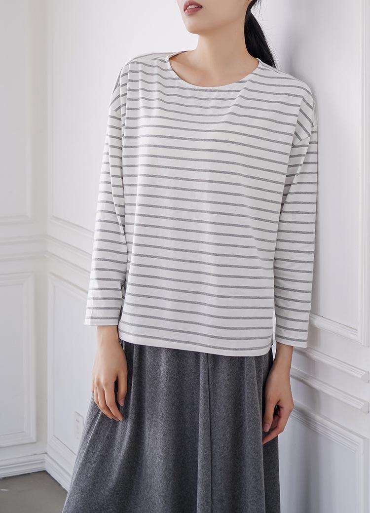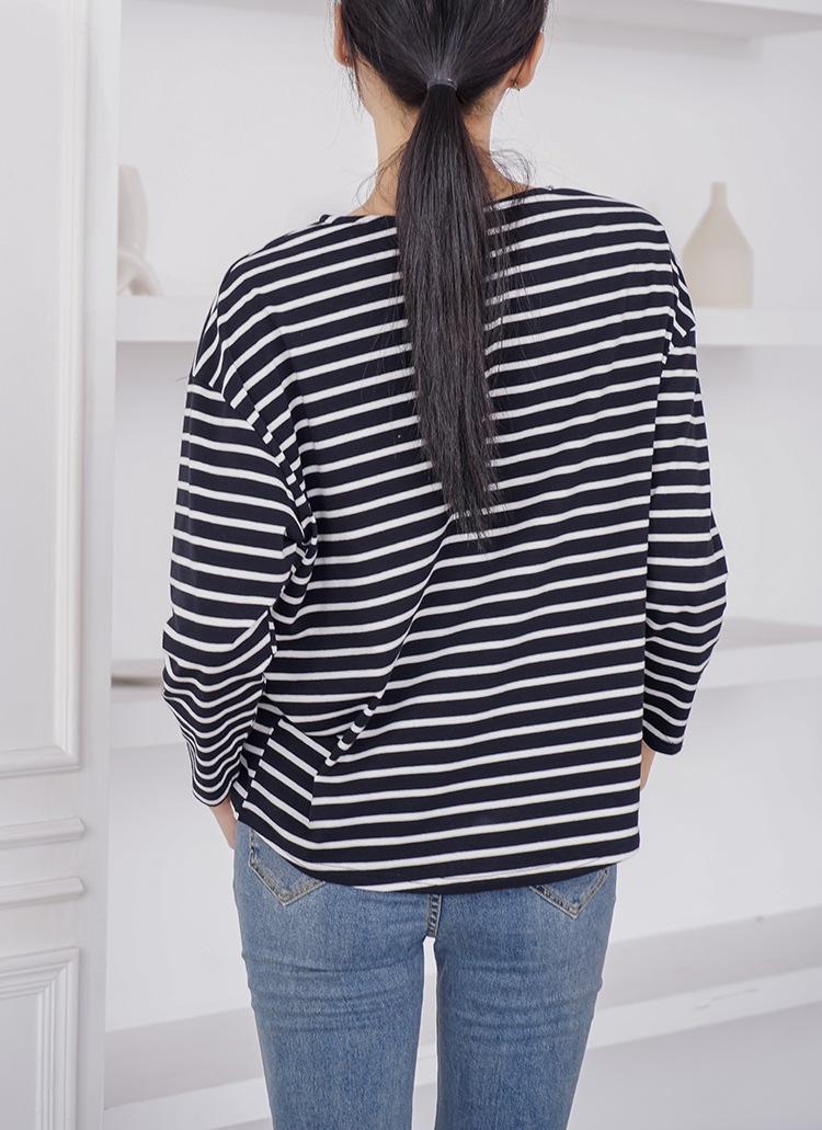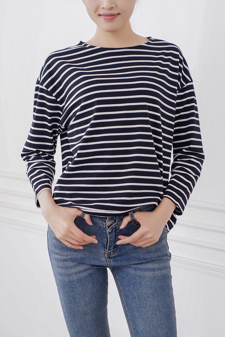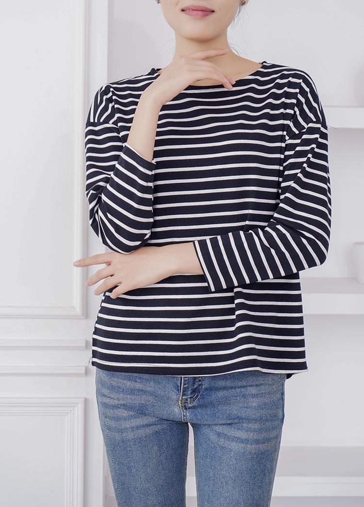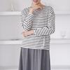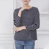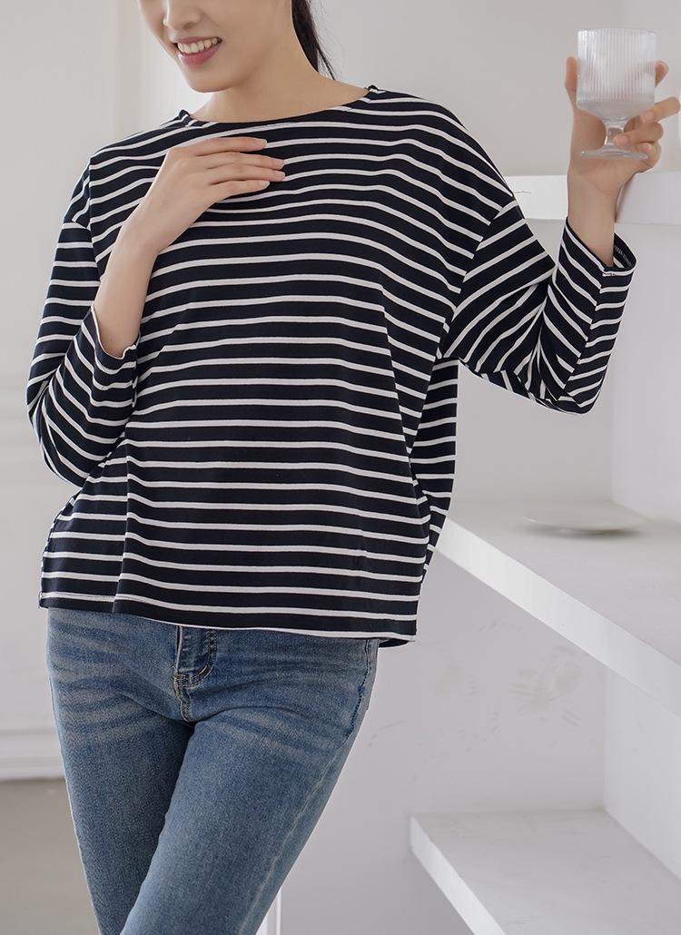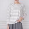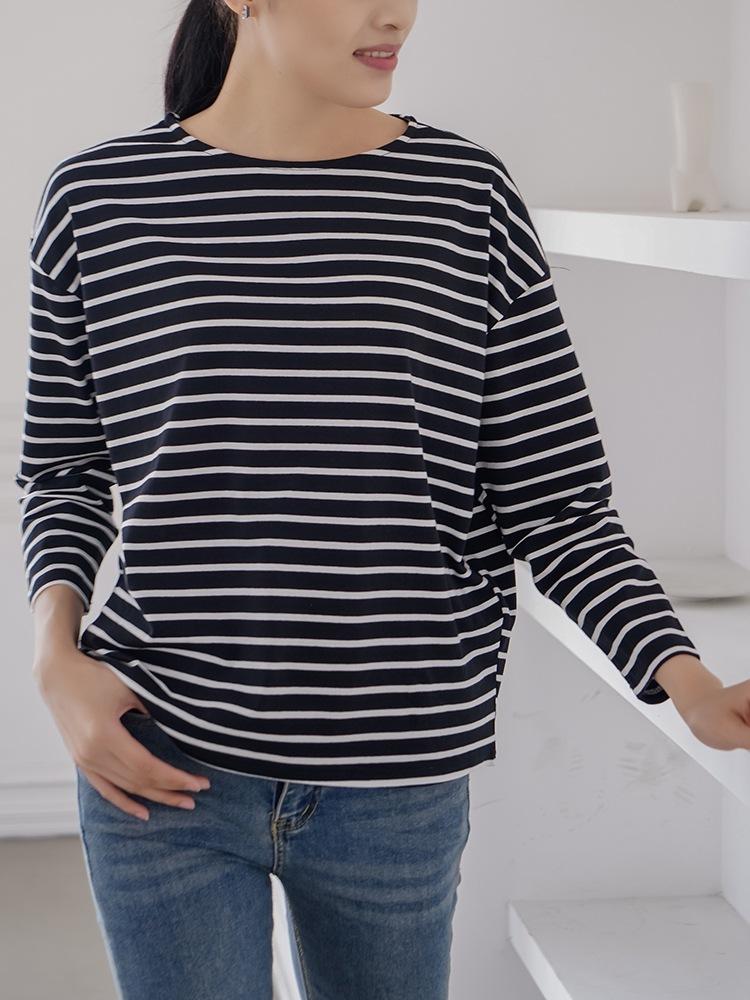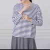 Camiseta japonesa de manga larga a rayas para mujer, jersey sencillo y combinable, cuello redondo holgado, para otoño e invierno.